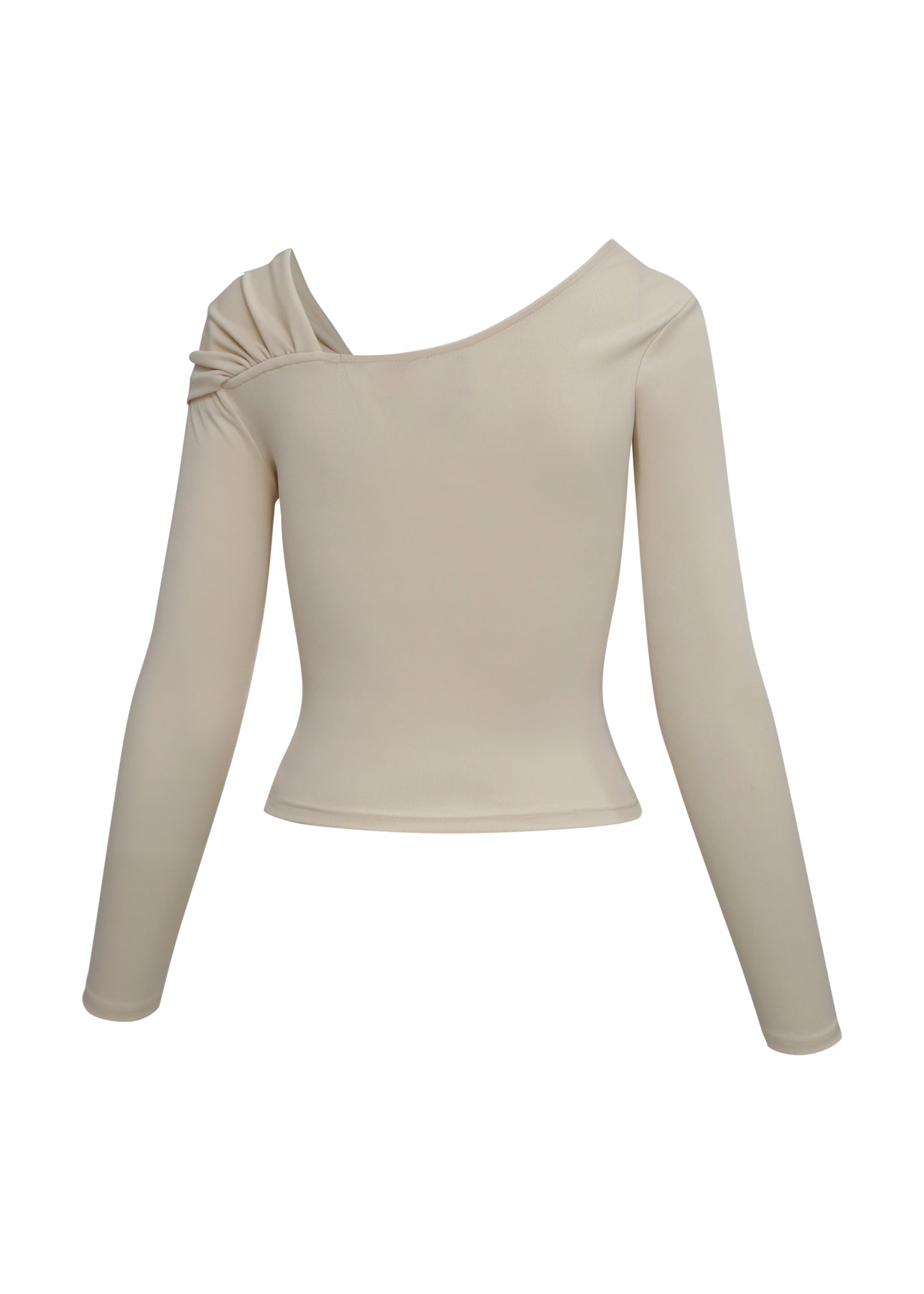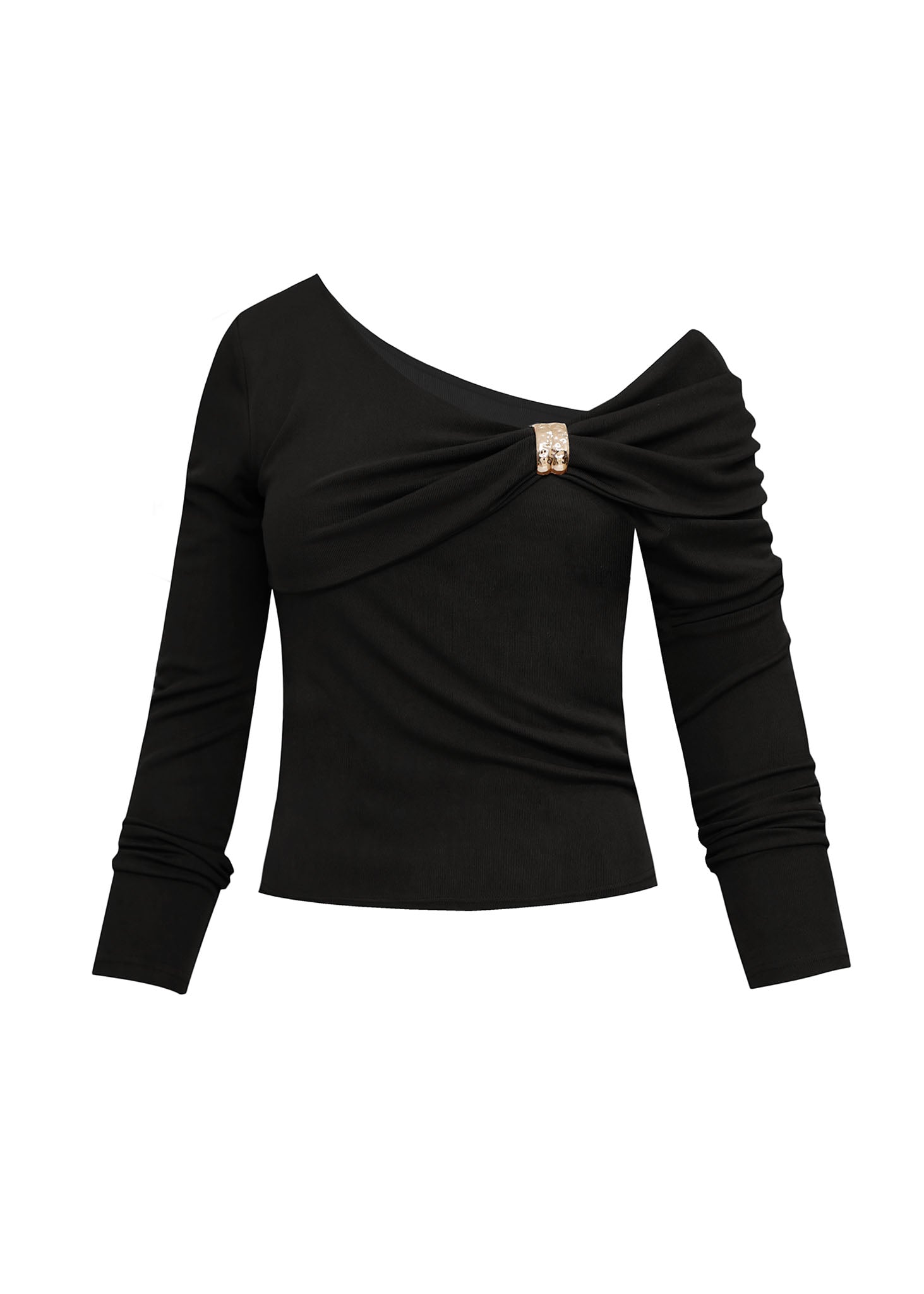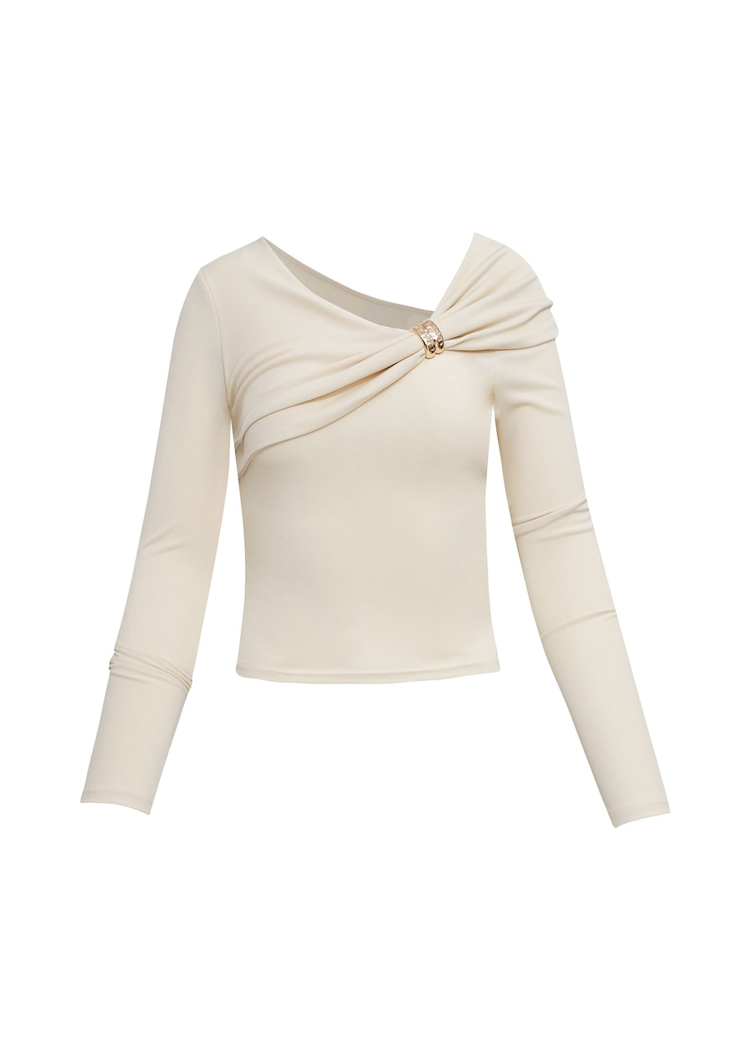Blusa de mangas con un delicado detalle recogido en el frente, realzado por un adorno dorado que aporta un toque elegante y sofisticado. Perfecta para elevar cualquier look con estilo moderno y femenino.
