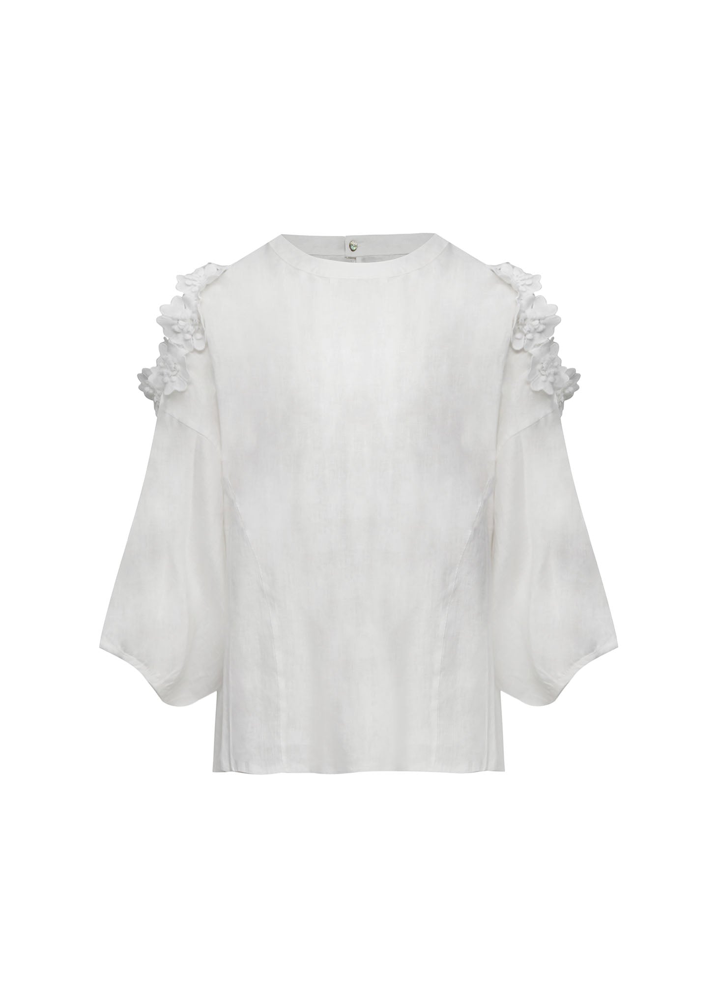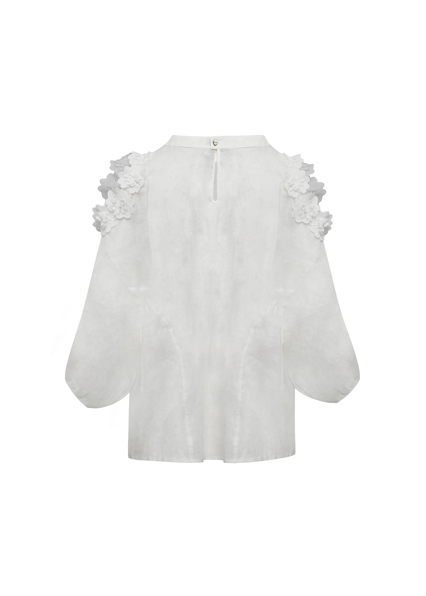 Esta blusa en lino destaca por sus elegantes flores en 3D, que aportan textura y sofisticación al diseño. Perfecta para quienes buscan una prenda fresca y con un detalle artesanal que realza cualquier atuendo, combinando comodidad y estilo en una sola pieza.