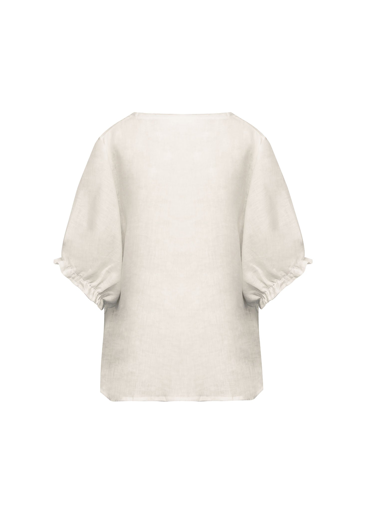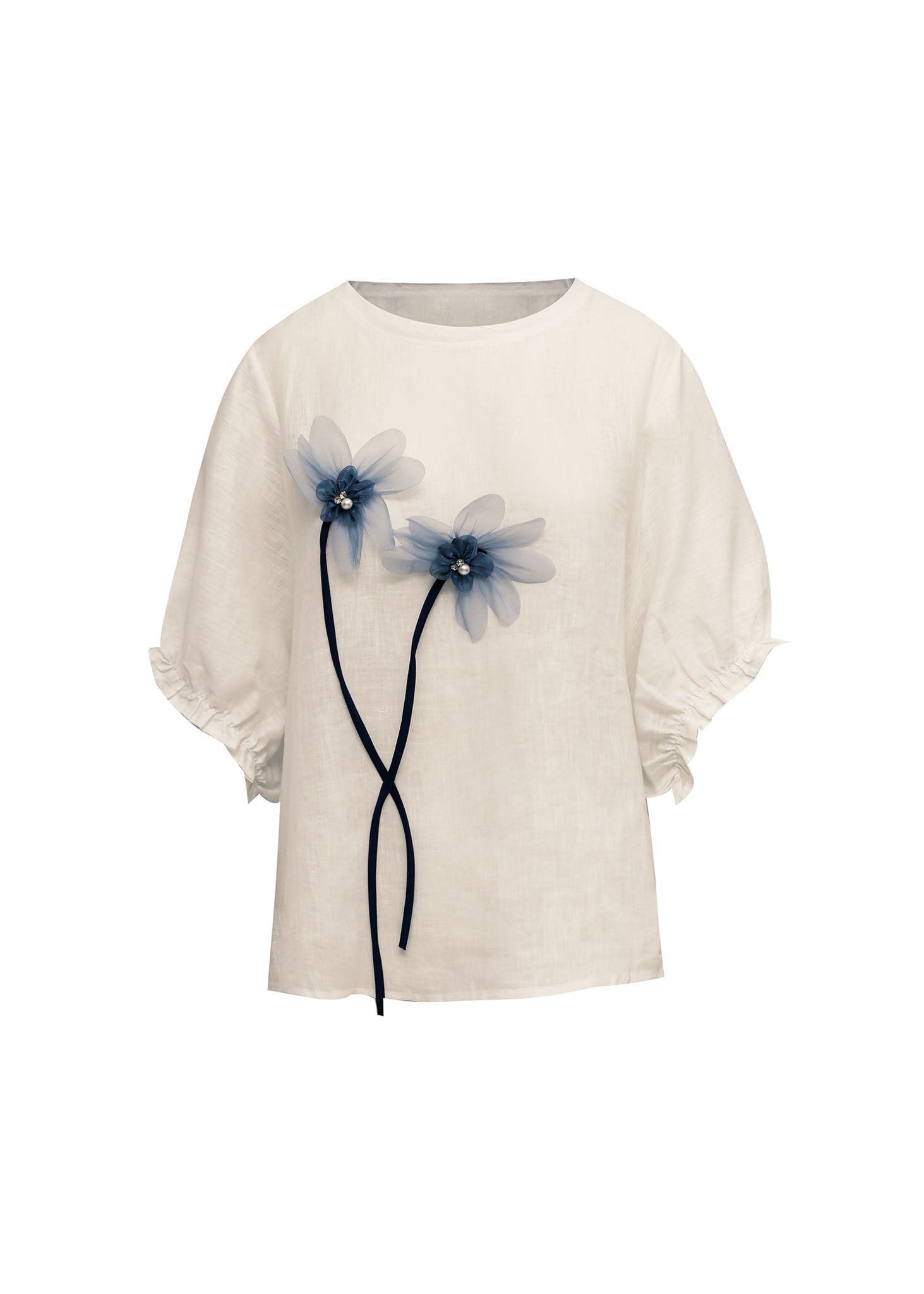 Una pieza que combina la frescura natural con un toque de sofisticación artesanal. Esta blusa de corte holgado está confeccionada en un lino blanco texturizado y ligero. Lo que la hace única son las dos delicadas flores hechas de organza semitransparente. Las flores están adornadas con detalles centrales brillantes (o perlas) y tallos de cinta de terciopelo que se cruzan sutilmente. El toque final lo dan las mangas abullonadas con un ligero volante en el puño. Perfecta para un look de brunch, vacaciones o una reunión de trabajo informal.