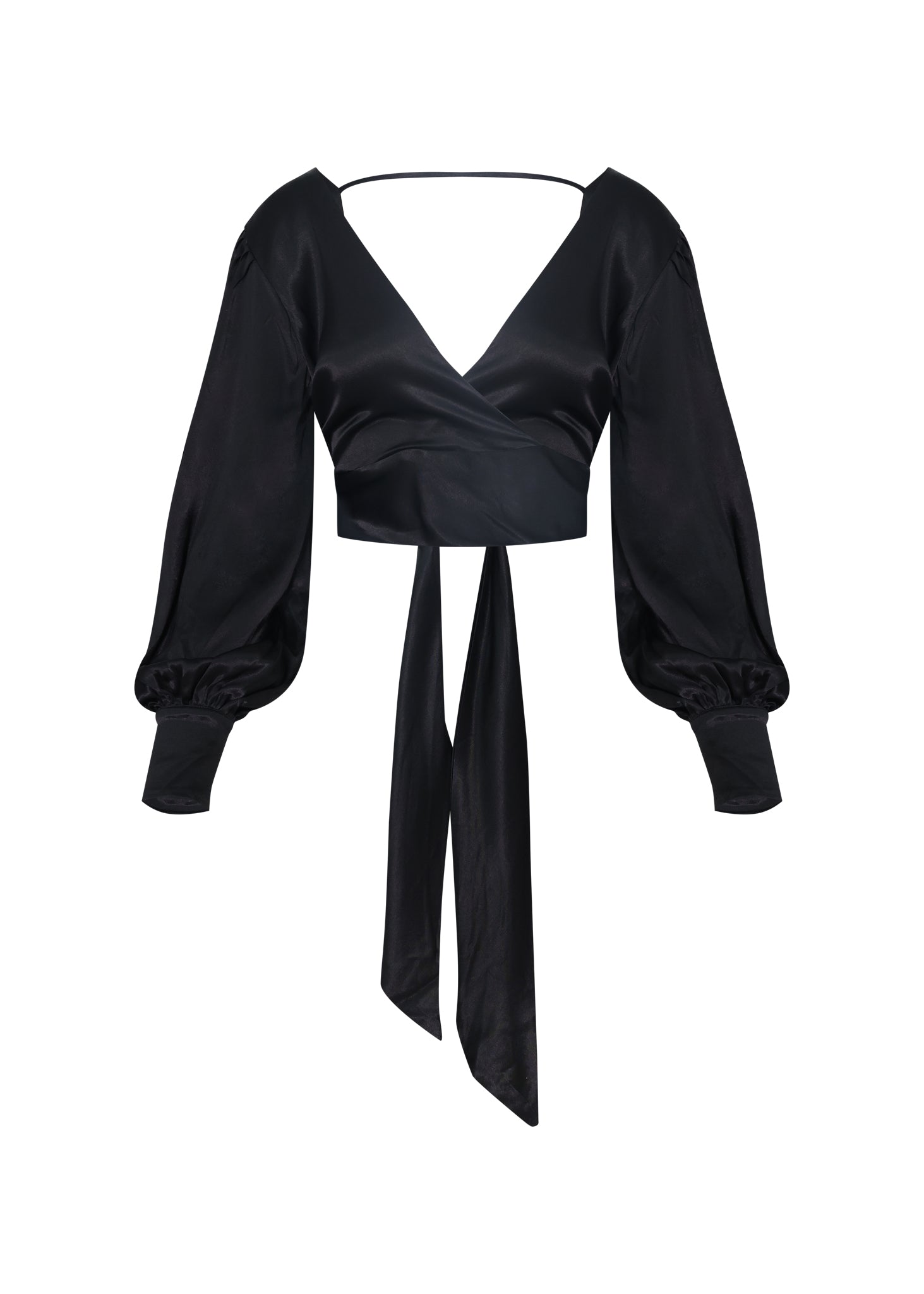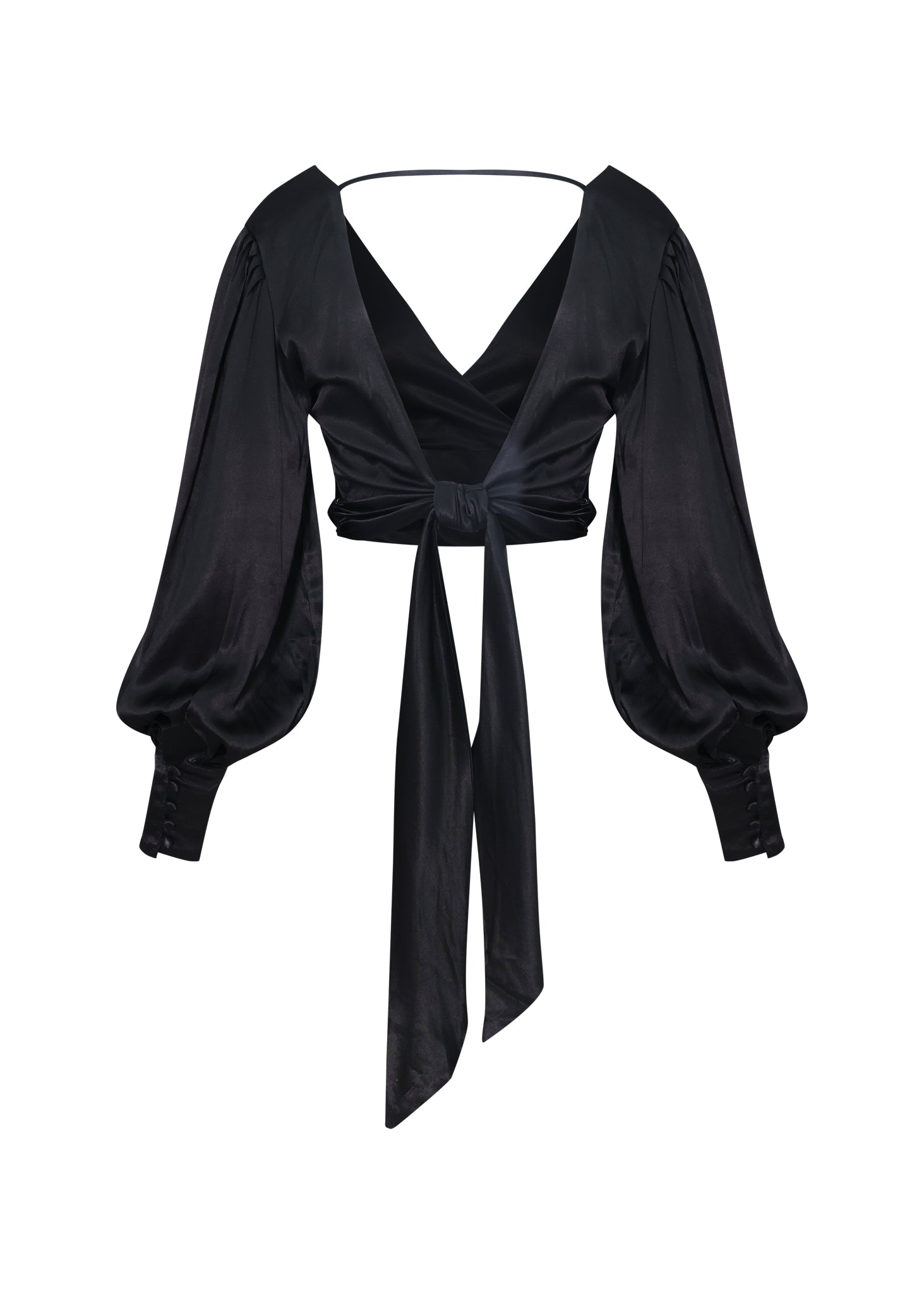 Deslumbra con nuestro Top Crop Cruzado de Satén Negro. Esta pieza sofisticada destaca por su lujoso tejido de satén, un favorecedor escote en V, y elegantes mangas largas abullonadas que añaden volumen y tendencia.