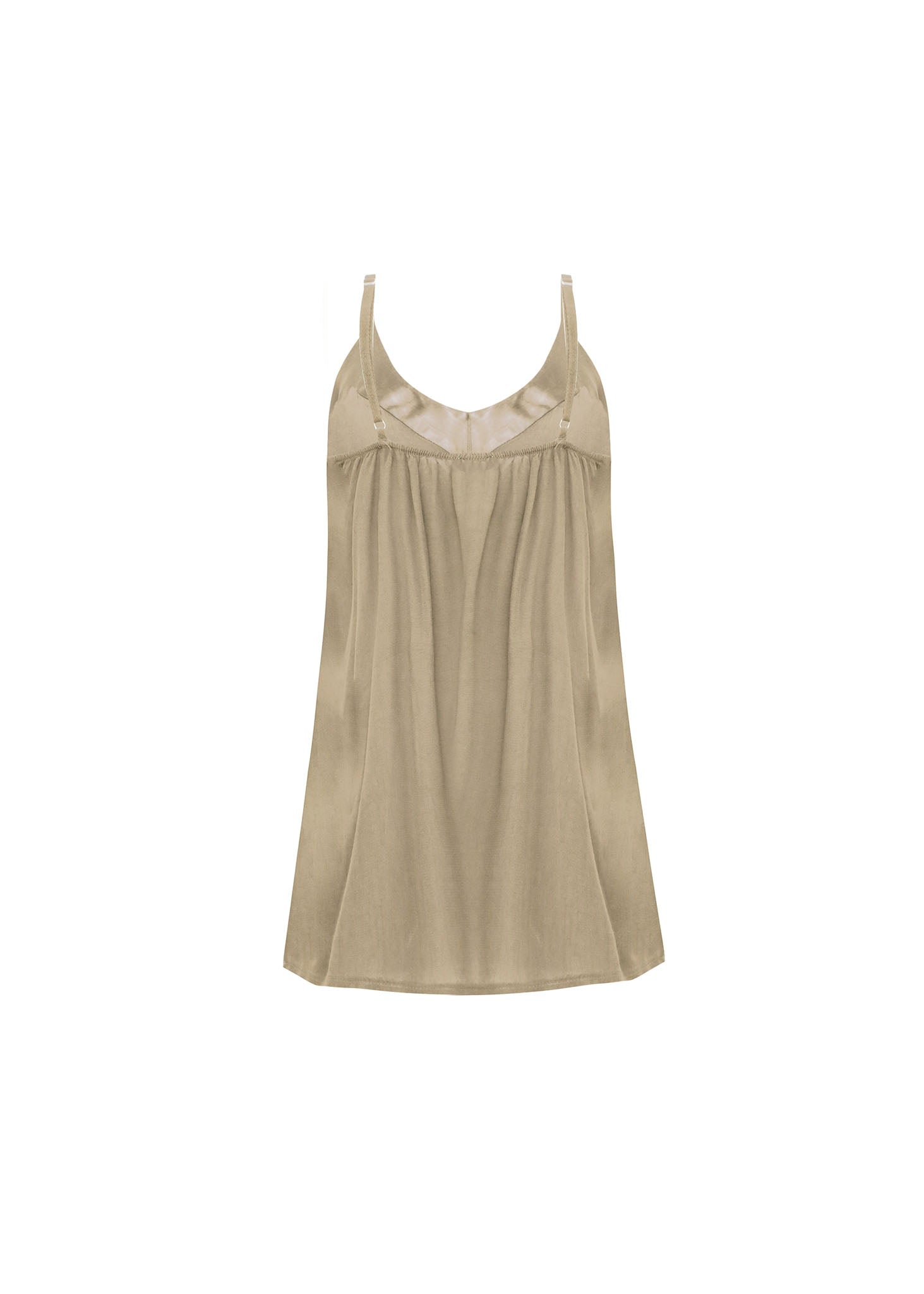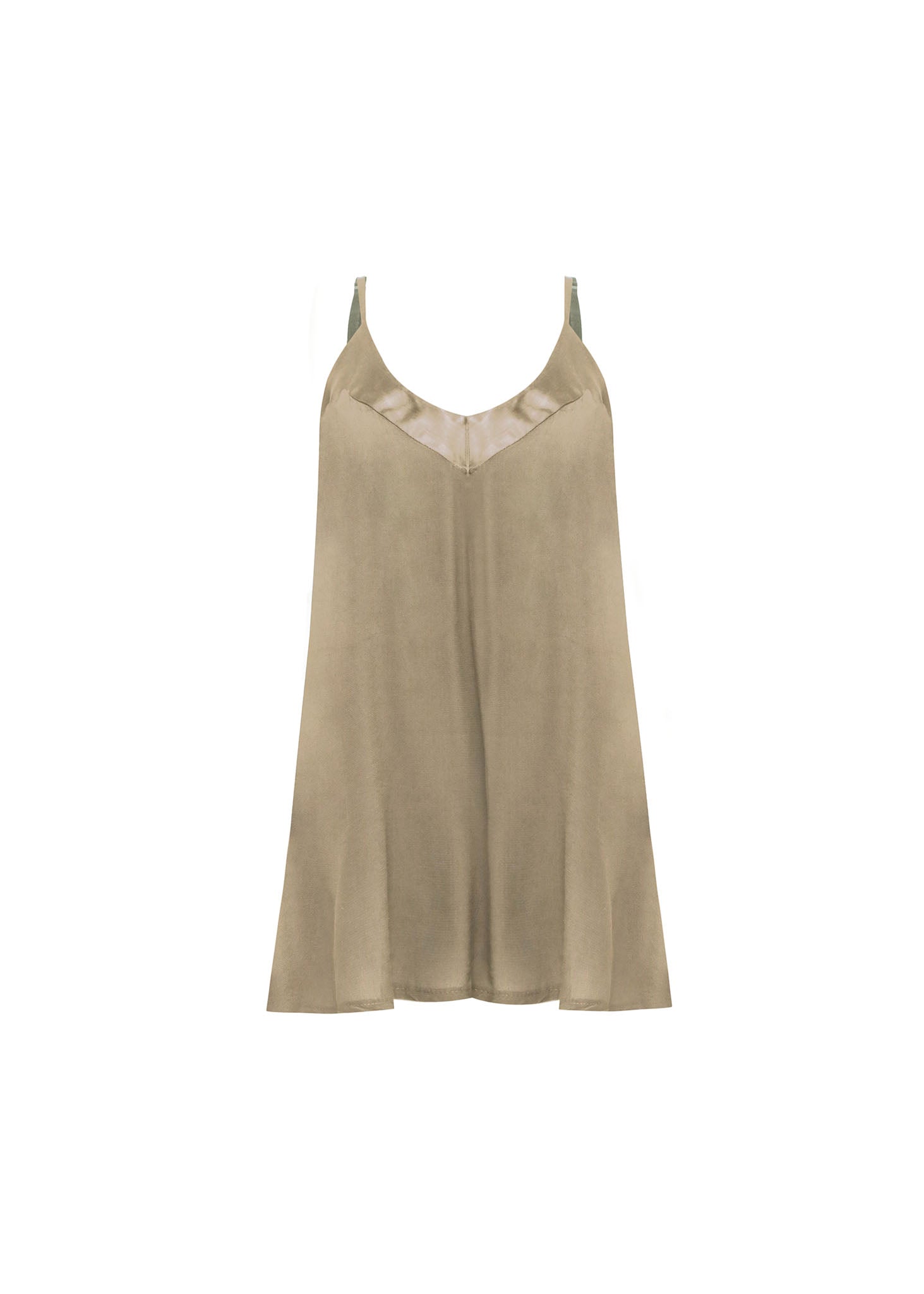 Este elegante Top Lencero Satinado en un versátil color Beige Topo es la definición de lujo discreto, diseñado con un tejido sedoso de caída fluida en corte A-line que garantiza un ajuste cómodo y favorecedor. Destaca por su sofisticado escote en V con un sutil y atractivo detalle de malla o encaje transparente en el centro, y se completa con tirantes finos ajustables, convirtiéndolo en la pieza perfecta para llevar con un blazer en la oficina, o con jeans y tacones para un look de noche chic y effortless.