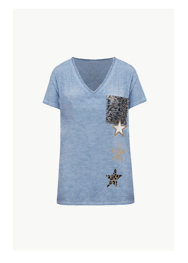 Esta blusa azul confeccionada en algodón combina comodidad y estilo con un toque sofisticado gracias a su bolsillo decorado con lentejuelas. Perfecta para quienes buscan una prenda versátil que aporta un detalle llamativo sin perder la frescura y suavidad propia del algodón. Ideal para uso diario o para darle un giro brillante a tu look casual.