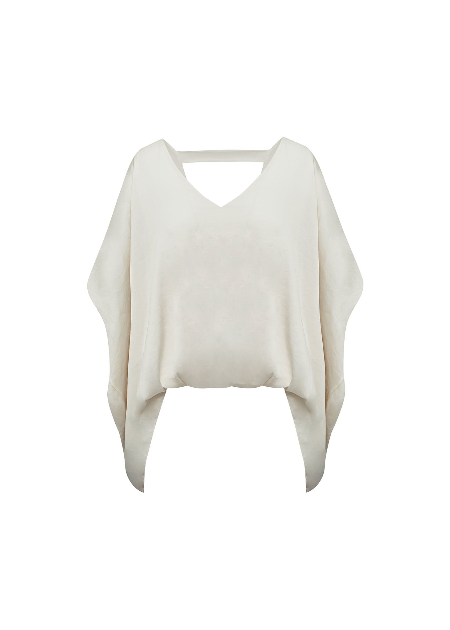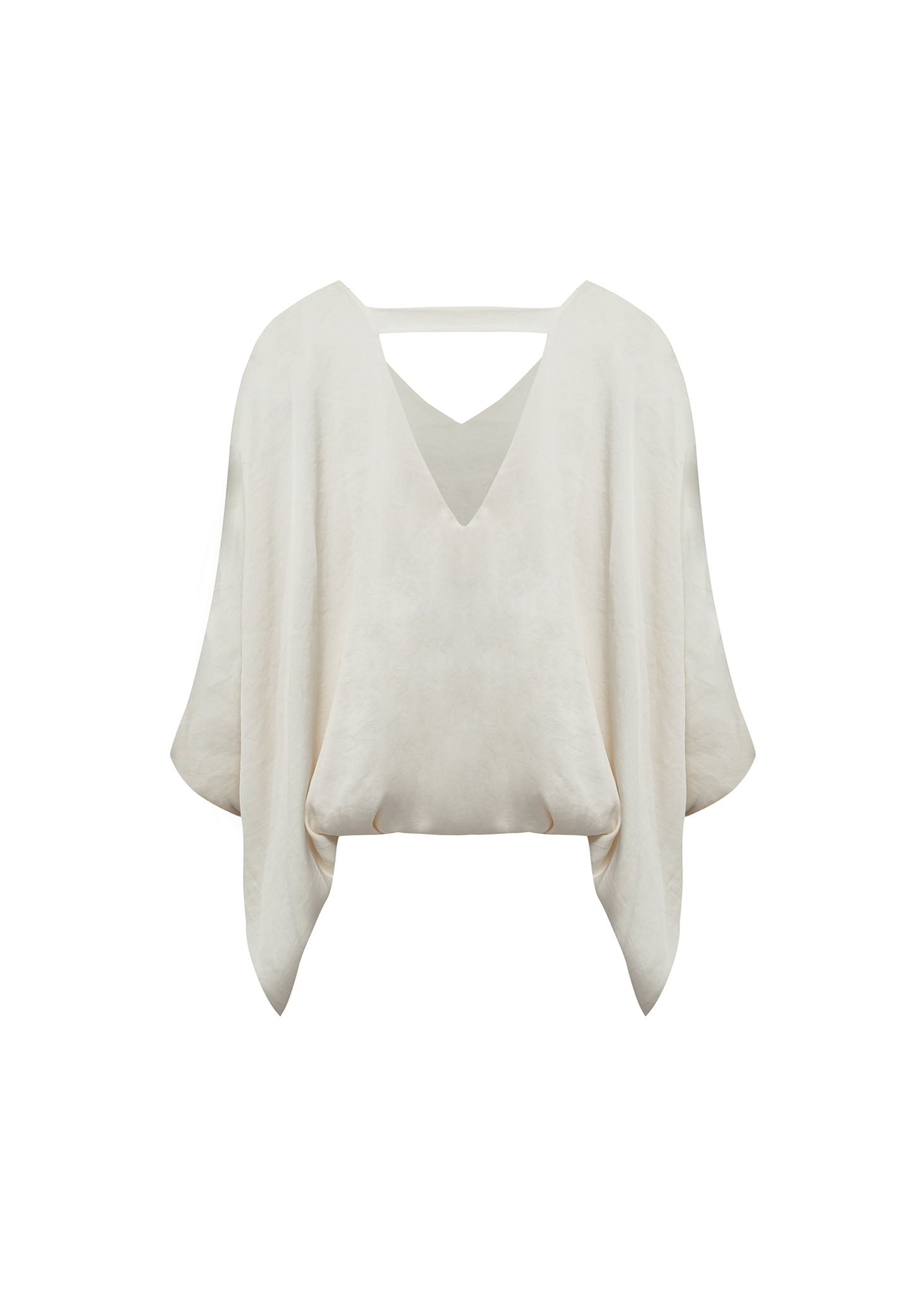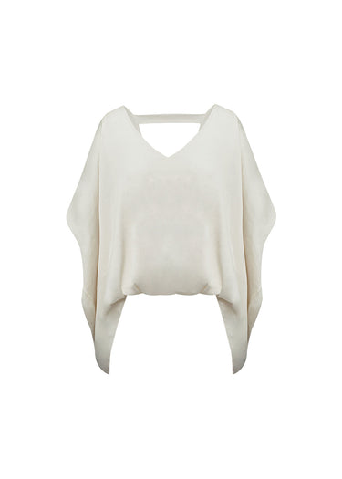 Elegancia sin esfuerzo. Este Top de mezcla de seda en tono marfil ofrece una caída lujosa y un ajuste holgado sumamente favorecedor. Presenta un sofisticado escote en V y mangas estilo murciélago. El detalle cutout en la parte trasera del cuello le da un toque moderno. Perfecto para cualquier ocasión, combínalo con pantalones de talle alto para un look chic y pulido.
