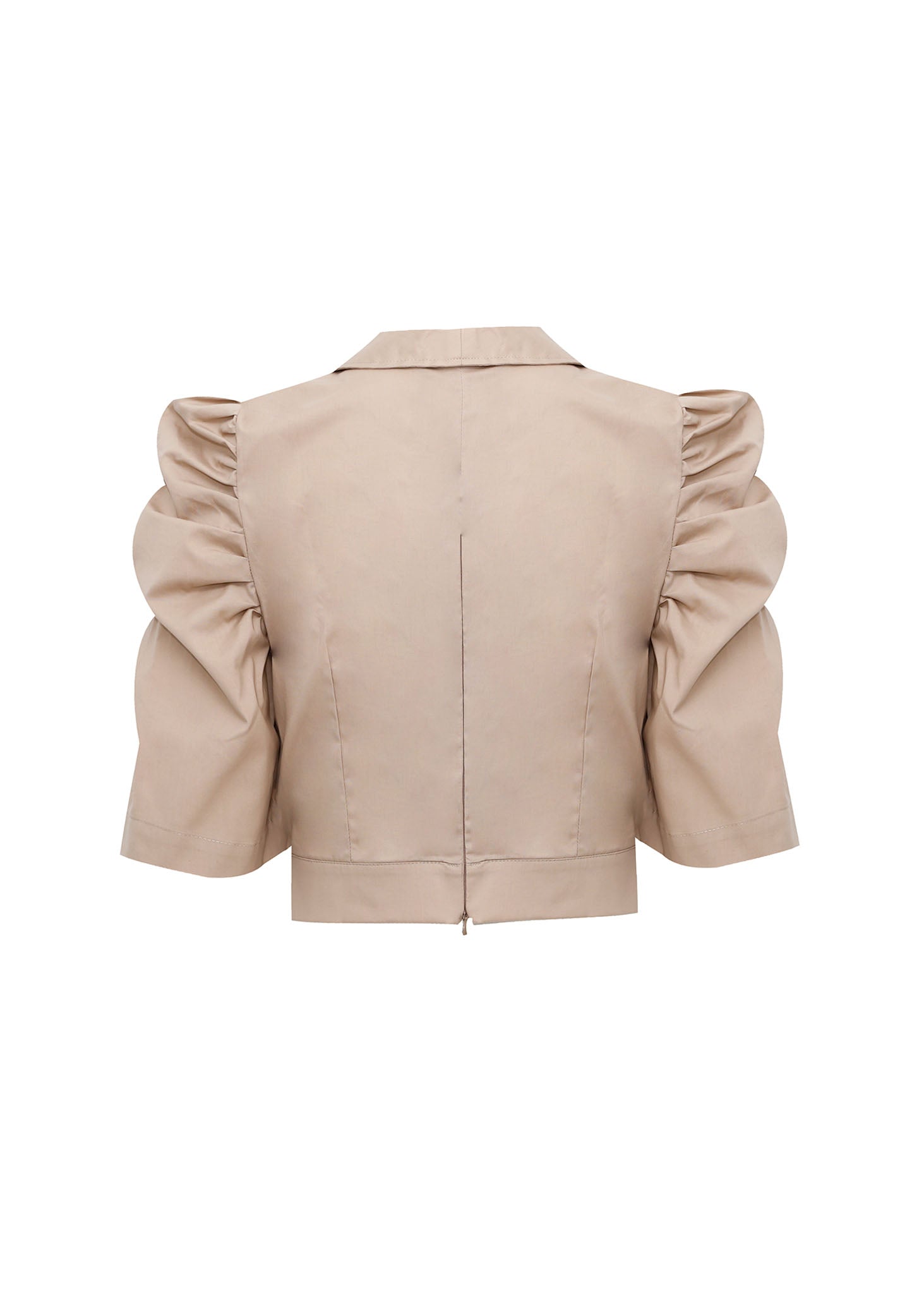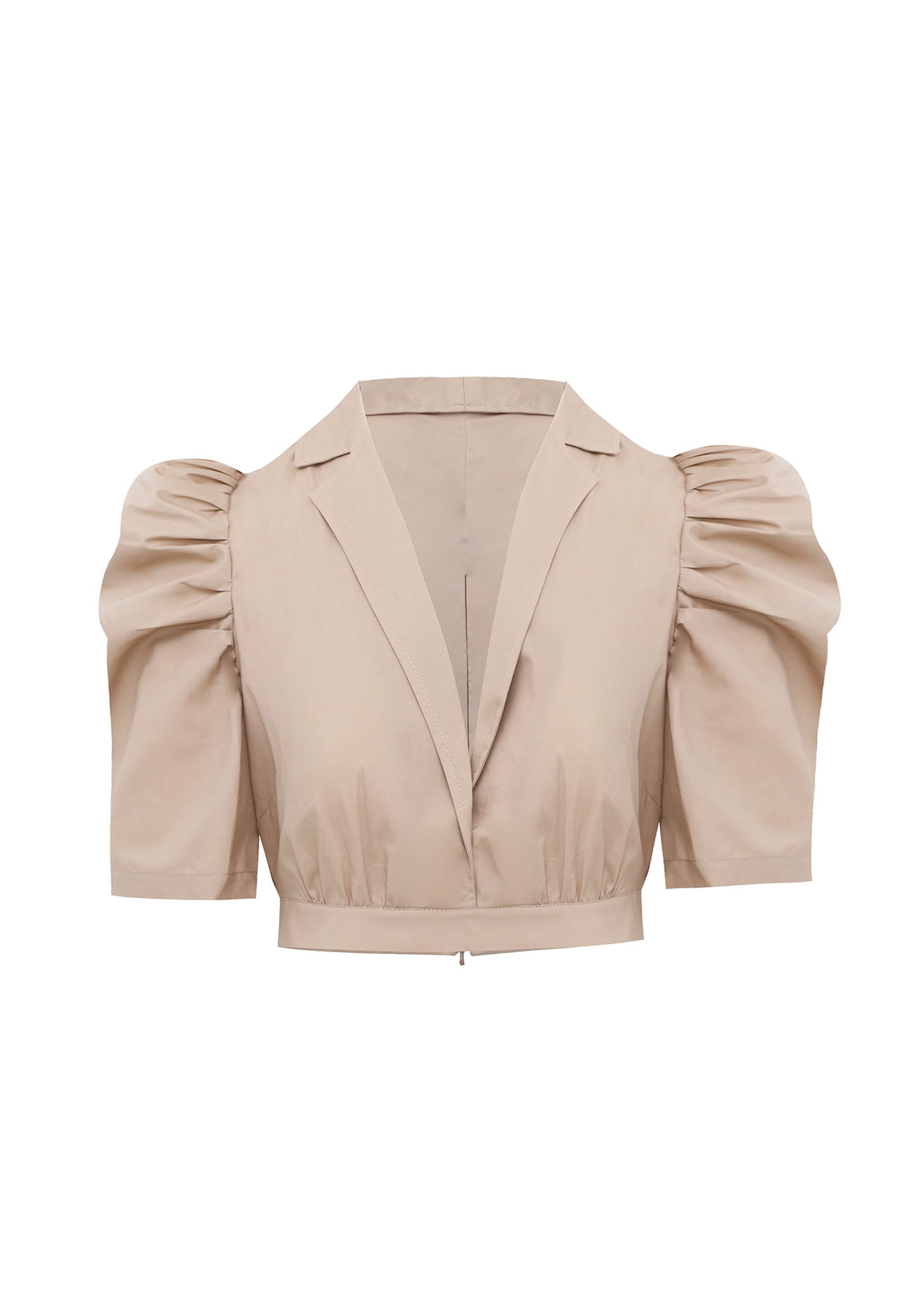 Esta blusa es una pieza de diseño arquitectónico que redefine la sastrería femenina mediante un juego audaz de volúmenes y proporciones. Confeccionada en un tejido técnico de color beige arena con acabado liso, la prenda destaca por sus mangas abullonadas de volumen exagerado, que incorporan un delicado drapeado en los hombros para crear una silueta escultural y poderosa.