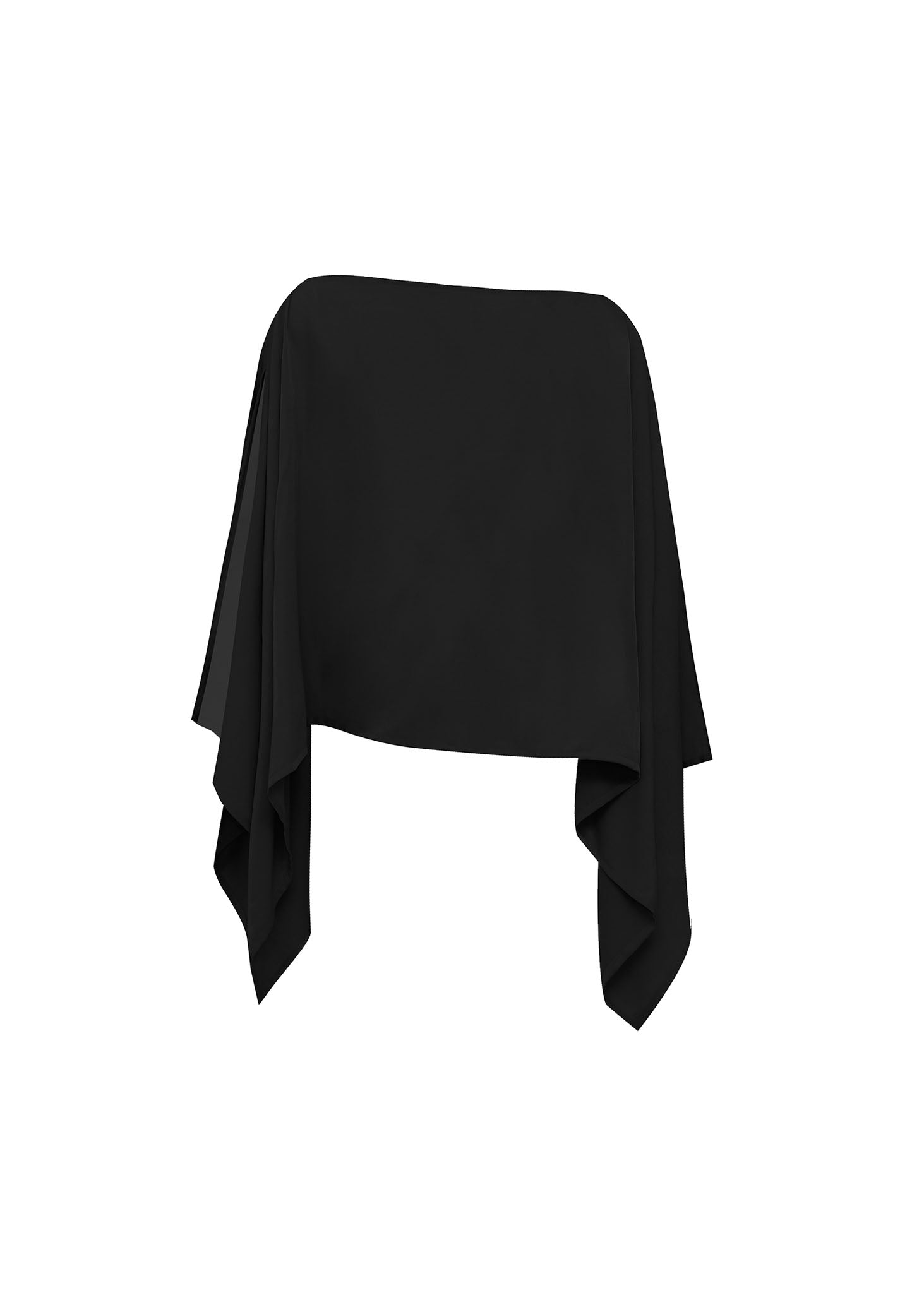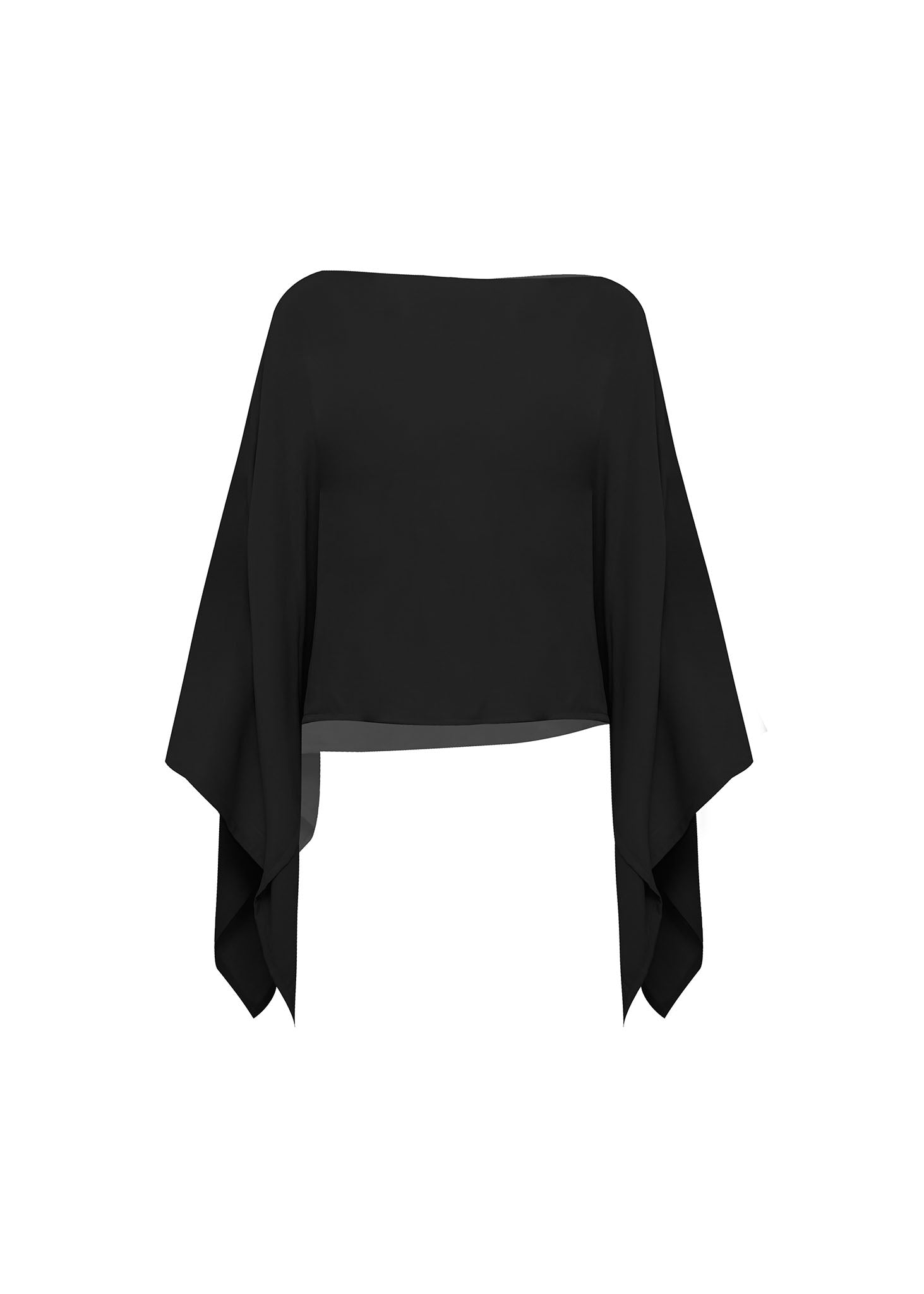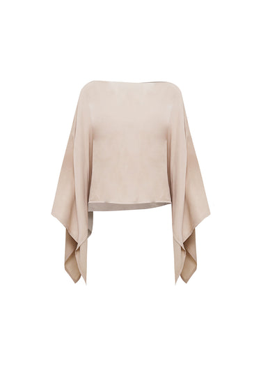 La prenda presenta mangas de efecto capa con una caída espectacular, que nacen desde los hombros para crear un volumen ligero que parece flotar alrededor del torso. Confeccionado en un tejido con un sutil brillo satinado, su corte tipo crop y su estructura etérea lo convierten en la opción ideal para añadir una dosis de sofisticación arquitectónica a cualquier conjunto. Es una pieza versátil que transita sin esfuerzo del día a la noche, proyectando una imagen de elegancia serena y vanguardista.