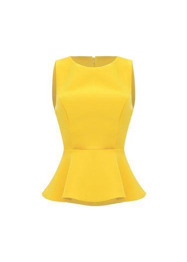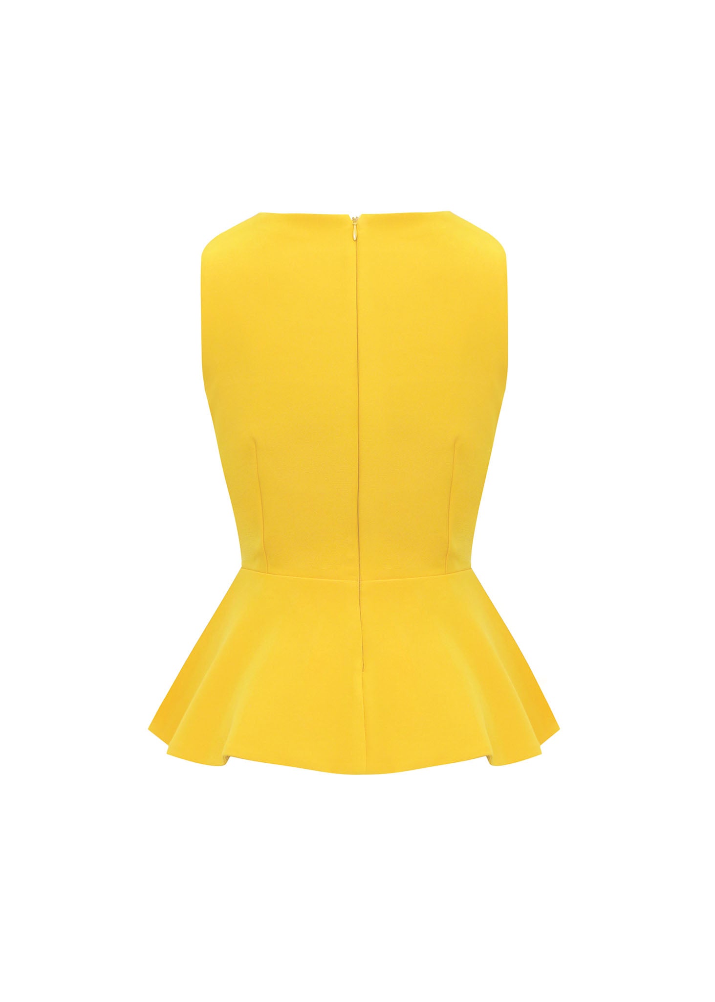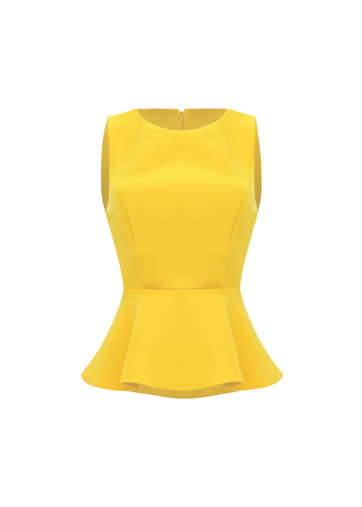 Este top es una pieza de diseño impecable que celebra la sofisticación a través de una silueta escultural y un color vibrante de alto impacto. Confeccionado en un tejido técnico de alta calidad en color amarillo canario, la prenda destaca por su corte peplum clásico, que define magistralmente la cintura antes de abrirse en un vuelo estructurado y femenino.