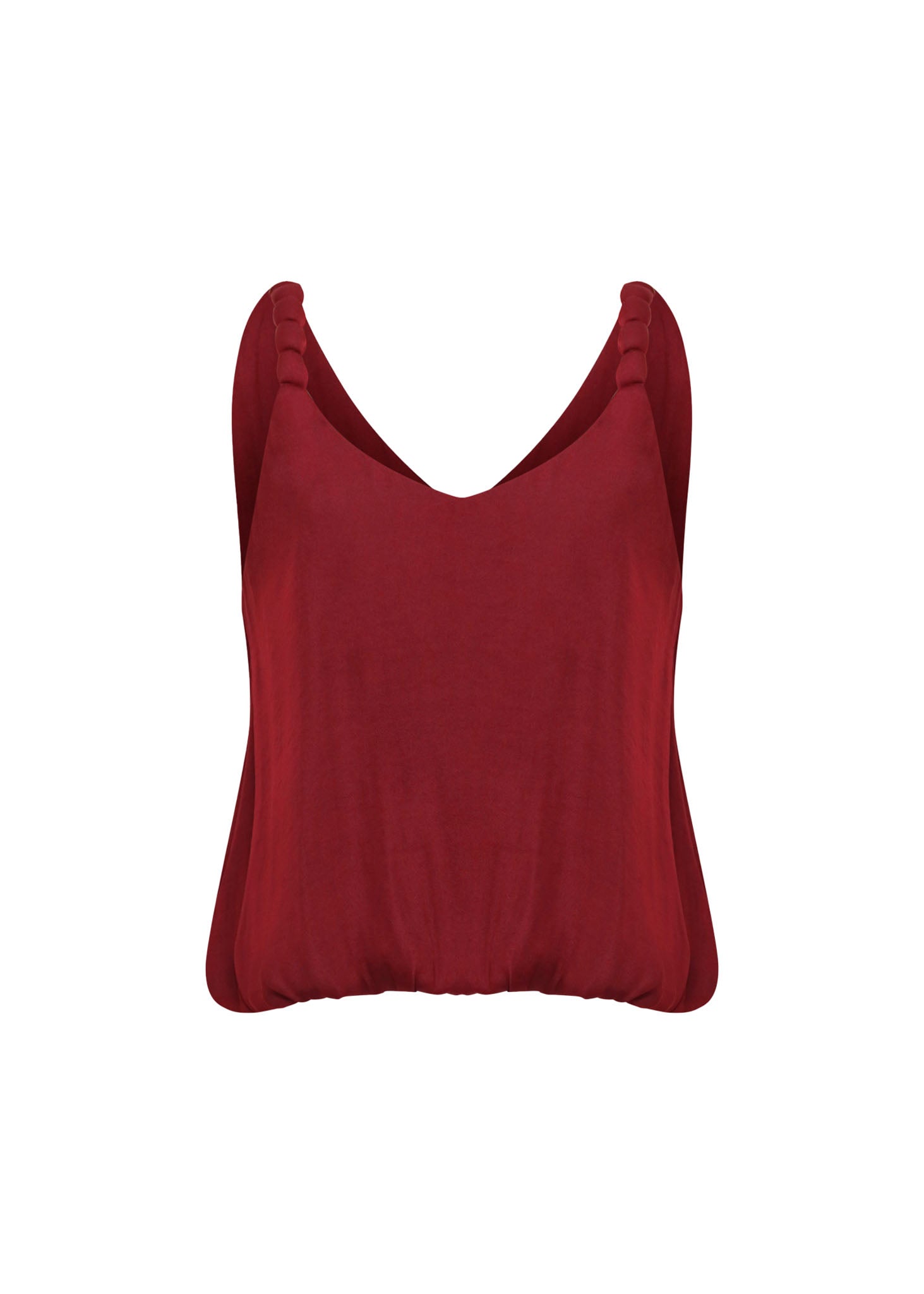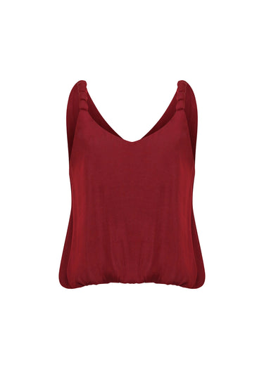 Esta blusa de tirantes es una pieza de elegancia atemporal que destaca por su color vibrante y sus detalles de diseño refinados. La prenda, confeccionada en un tejido satinado de color rojo borgoña, presenta un sofisticado escote en V tanto en la parte frontal como en la posterior, realzando la zona del cuello y los hombros con una caída fluida.