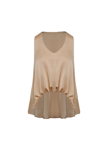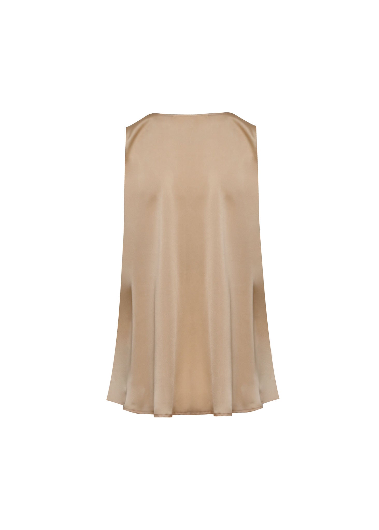 Esta blusa sin mangas en un sofisticado tono arena metalizado es una pieza que personifica el lujo fluido y la elegancia escultural. Confeccionada en un satén de alta calidad con un brillo líquido que refleja la luz, la prenda destaca por su escote en "V" de líneas limpias, que aporta una verticalidad refinada al diseño.