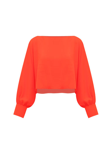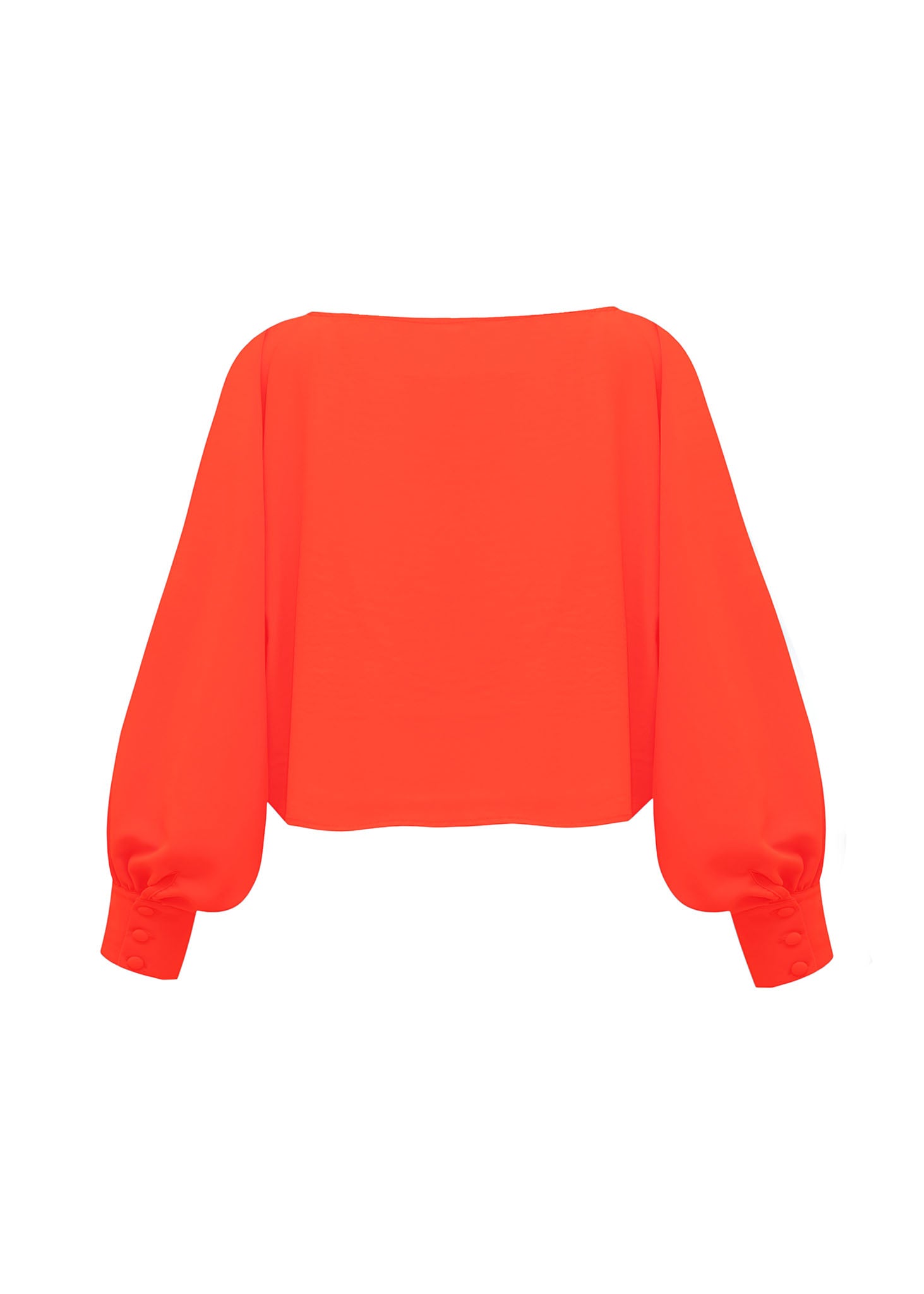 Esta blusa de silueta cropped en un vibrante tono naranja destaca por su equilibrio entre la sobriedad del corte y el dramatismo de sus volúmenes. La pieza presenta un elegante cuello bote que estiliza la línea de los hombros y mangas largas de estilo poet o bishop, las cuales aportan un movimiento fluido y se recogen en puños altos estructurados de acabado sastrero. Confeccionada en una tela satinada de brillo delicado, la prenda ofrece una caída impecable y una textura lujosa al tacto. Su diseño limpio y contemporáneo la convierte en una pieza clave para eventos de gala o cóctel, ideal para combinar con faldas de tiro alto o pantalones de corte formal, logrando una estética de alta sofisticación.