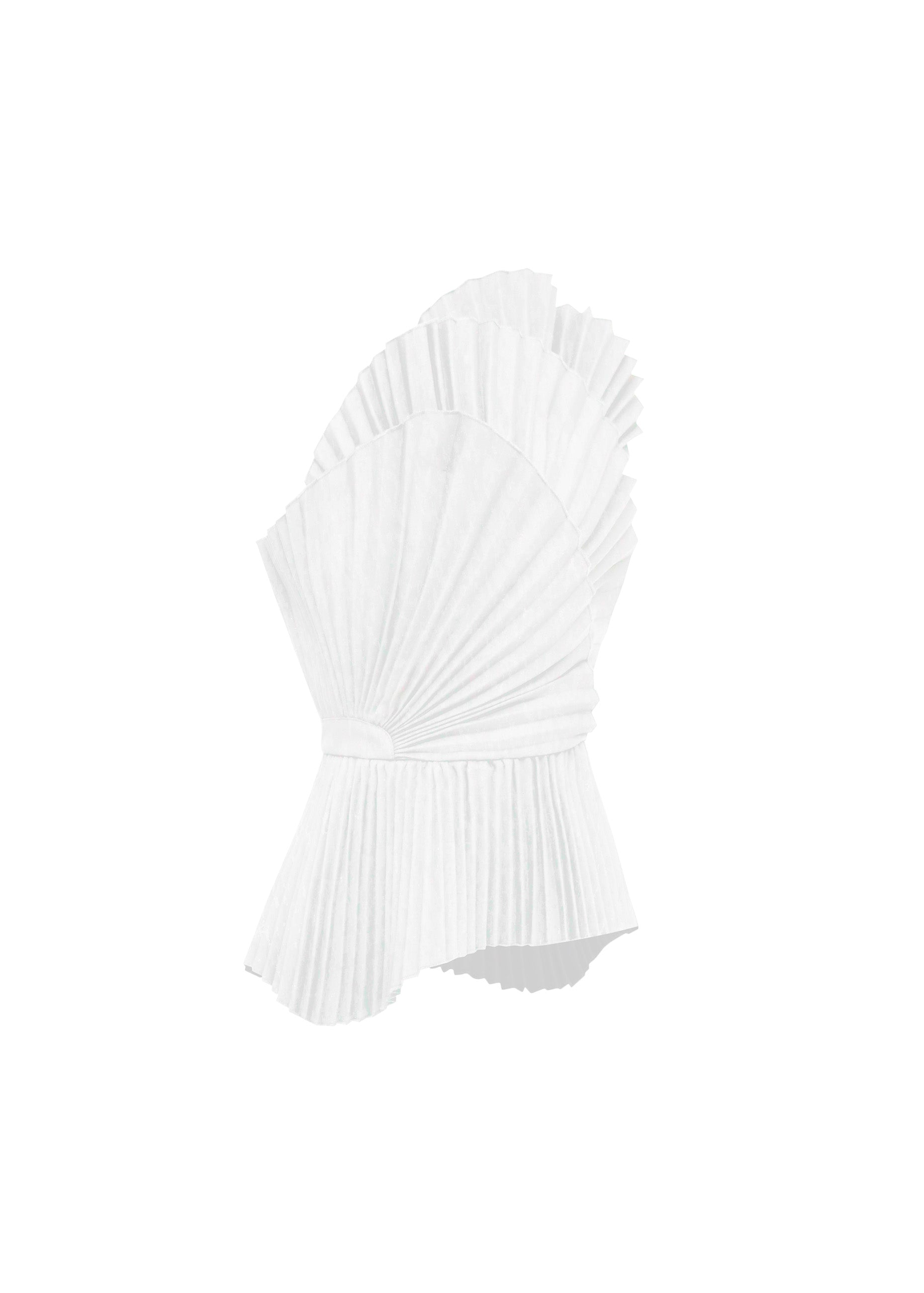 Confeccionado en un tejido técnico de color blanco óptico, este top asimétrico de un solo hombro destaca por su sofisticada técnica de plisado soleil (en abanico). La prenda se estructura mediante capas superpuestas que emulan la forma de una concha marina, generando un volumen ascendente que enmarca el torso de manera dramática. El diseño incorpora una cintura definida de la cual nace un bajo también plisado en línea asimétrica, logrando un equilibrio perfecto entre la rigidez técnica del plegado y la fluidez del movimiento textil. Es una pieza de vanguardia minimalista ideal para eventos de gala o estilismos de noche que busquen una estética artística y refinada.