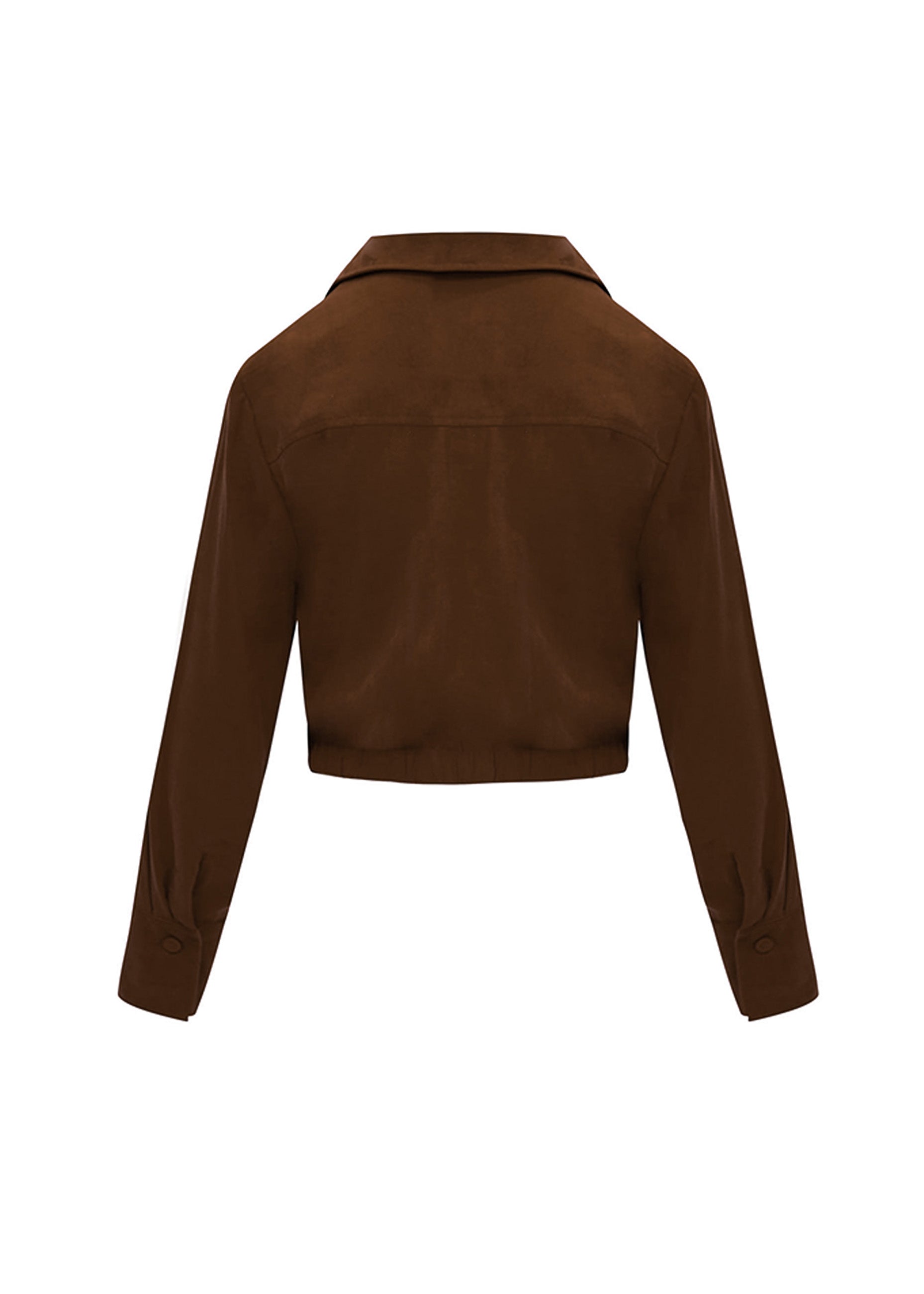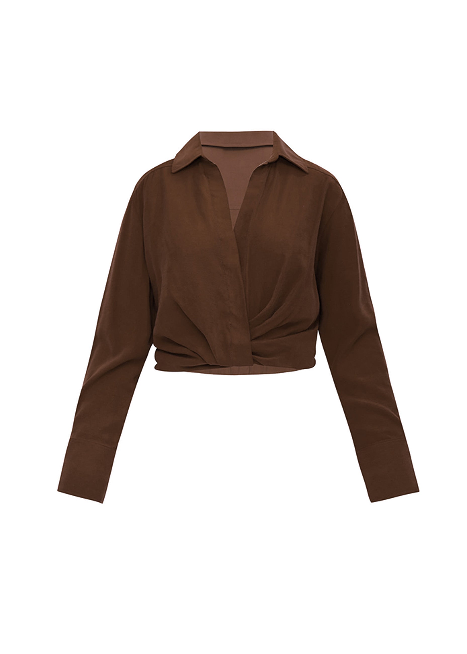 Confeccionada en un tejido fluido de color chocolate con acabado satinado, esta blusa presenta un corte cropped de estética contemporánea. El diseño integra un escote cruzado en "V" que nace de un cuello camisero clásico, creando un efecto drapeado mediante un nudo o retorcido central (twist) en la base del busto. Las mangas largas están terminadas en puños anchos y estructurados, mientras que la cintura se ajusta mediante una banda elástica fruncida en la parte posterior, logrando un equilibrio perfecto entre la fluidez del drapeado y una silueta entallada y moderna.