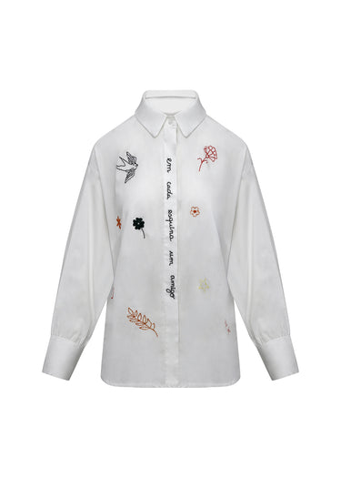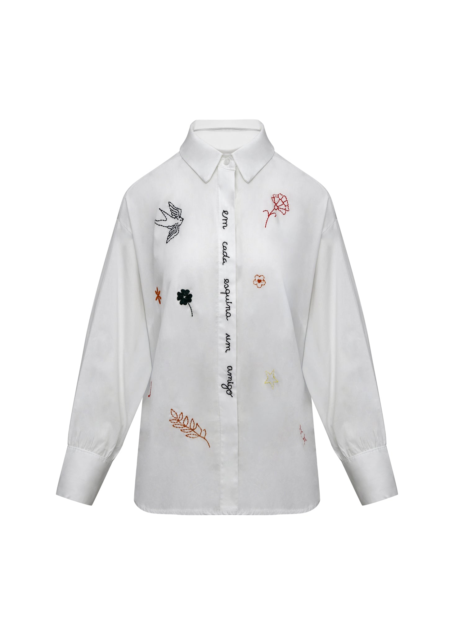 Esta camisa blanca de estilo poético es una pieza que celebra la amistad y la naturaleza a través de un bordado delicado y significativo. Confeccionada en un tejido estructurado de alta calidad, la prenda presenta un corte clásico con cuello de solapa y mangas largas acabadas en puños anchos. El elemento central es el bordado en la tapeta de los botones que reza la frase "em cada esquina um amigo" (en cada esquina un amigo), acompañada de diversos motivos distribuidos por el frontal, como una golondrina en vuelo, flores de colores, una estrella y una rama de olivo. Es una prenda con alma y una narrativa propia, ideal para quienes buscan piezas que combinen el diseño atemporal con un mensaje cálido y personal.