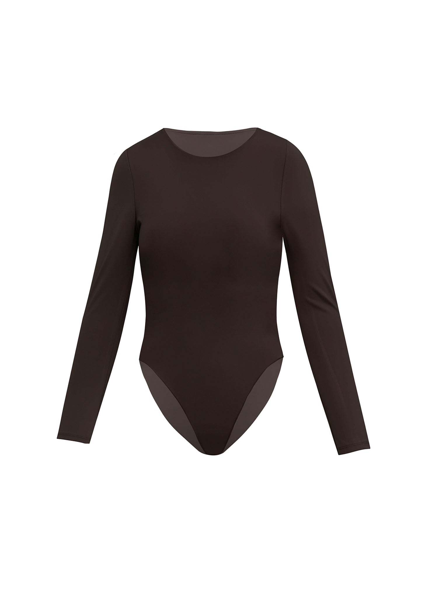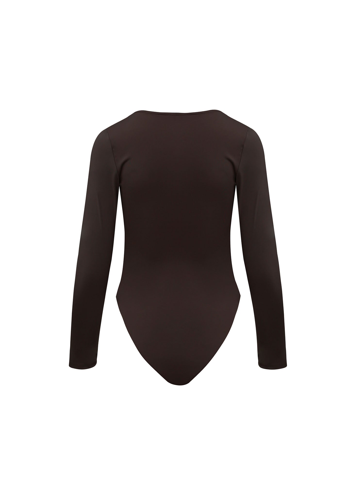 El Body Manga Larga en licra color café oscuro es la prenda básica que transformará cualquier look. Confeccionado en un tejido liso y elástico que ofrece un ajuste segunda piel perfecto, este body de cuello redondo proporciona una silueta impecable y lisa, ideal para llevar debajo de blazers, faldas de tiro alto o pantalones de cuero sin preocuparte por que se salga o se arrugue, asegurando un acabado pulcro y sofisticado en todo momento.