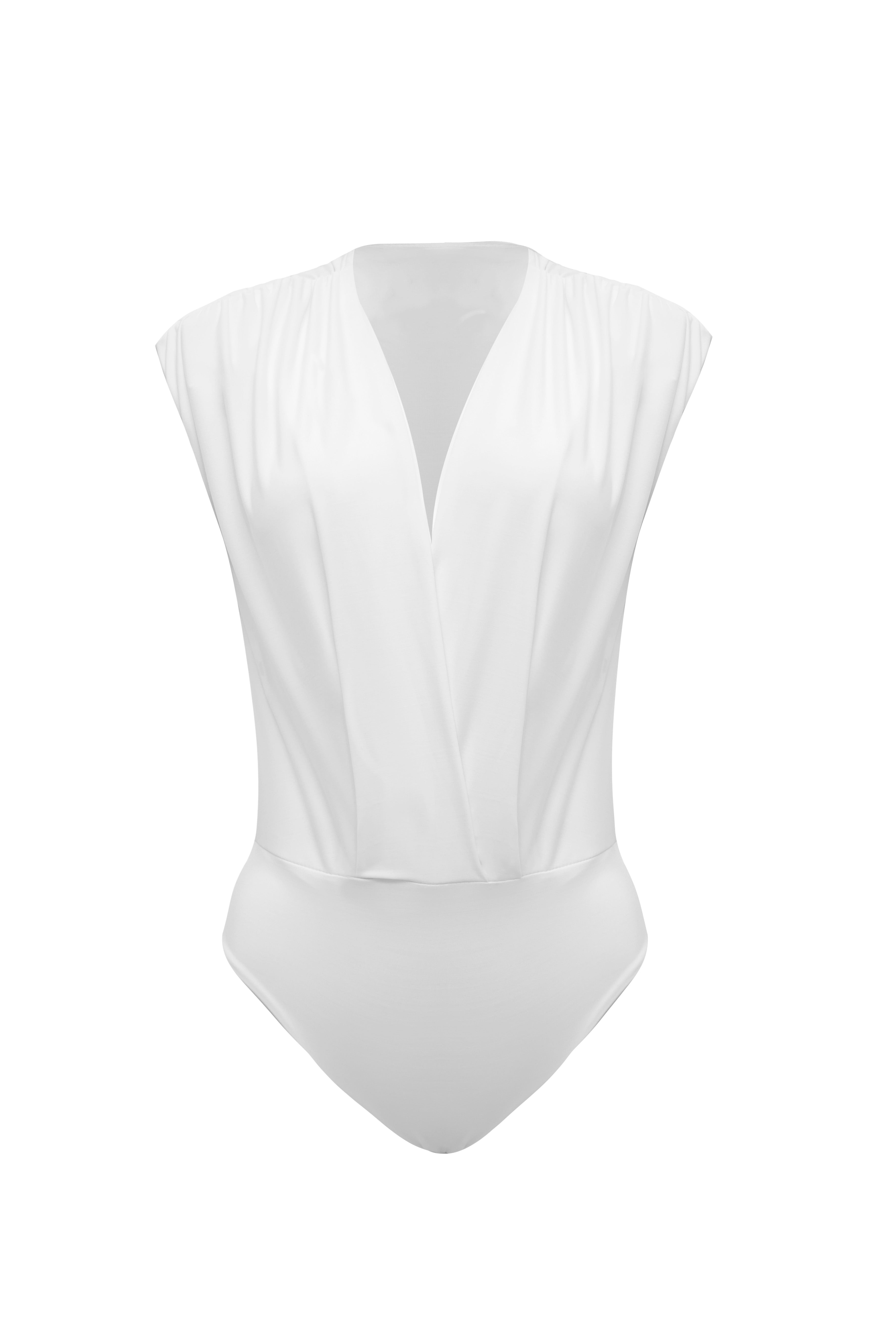 El body Drape, una pieza esencial diseñada para esculpir la silueta con una elegancia impecable. Destaca por su diseño envolvente frontal (wrap design) que crea un escote en "V" profundo y sofisticado, complementado por delicados pliegues en los hombros que aportan una estructura sutil y arquitectónica.