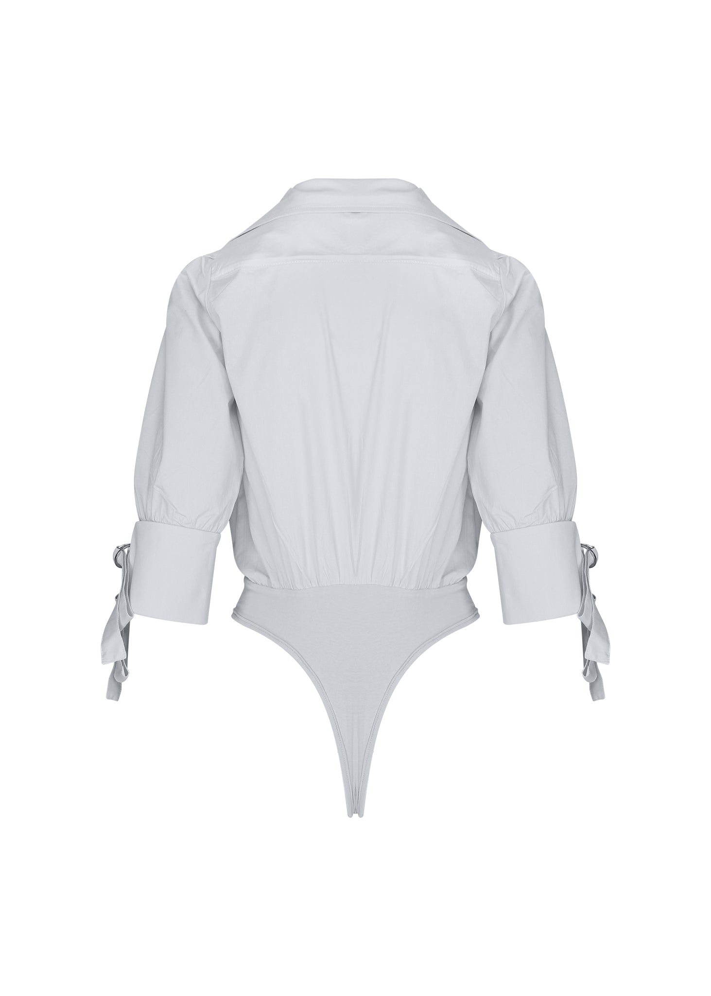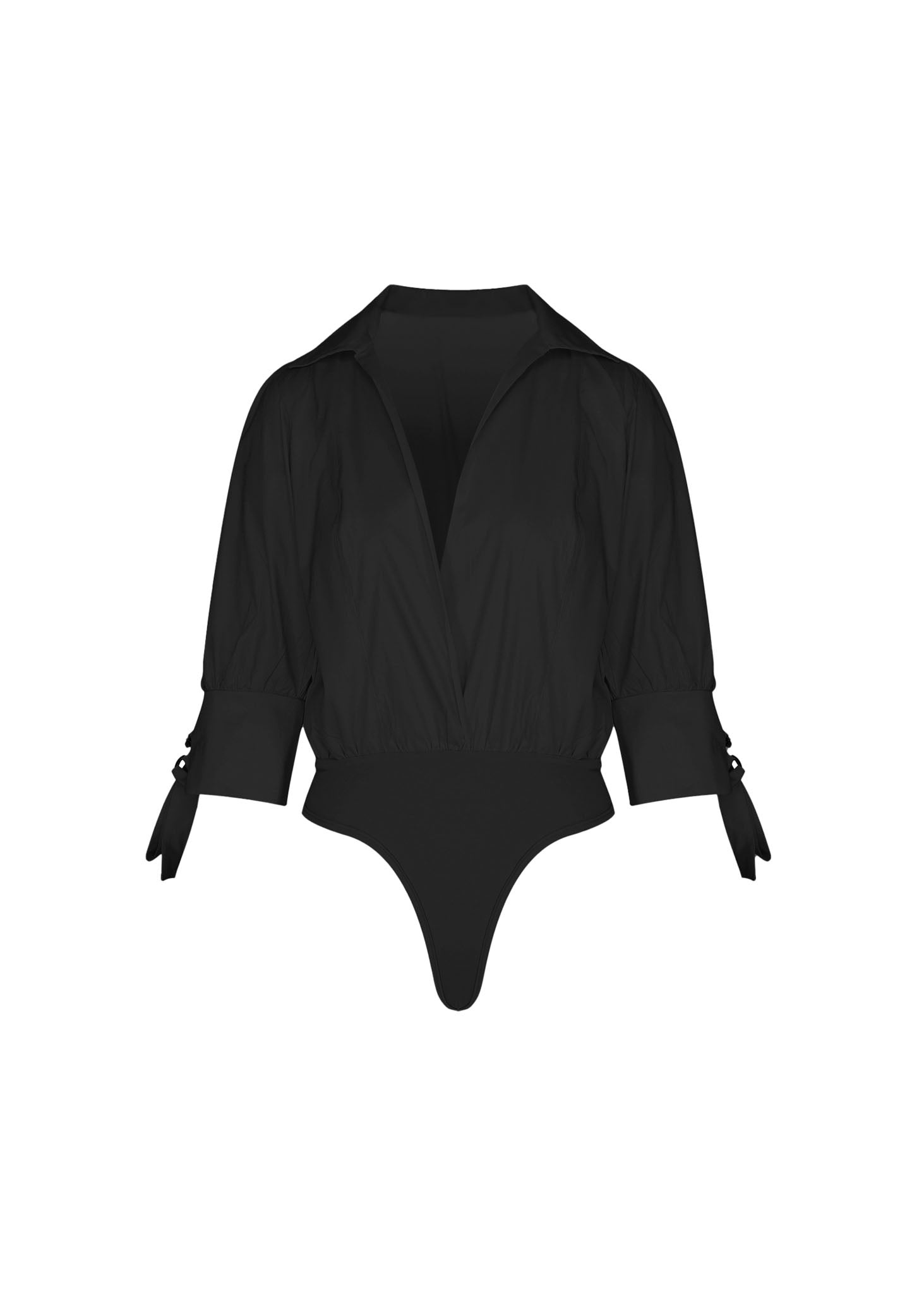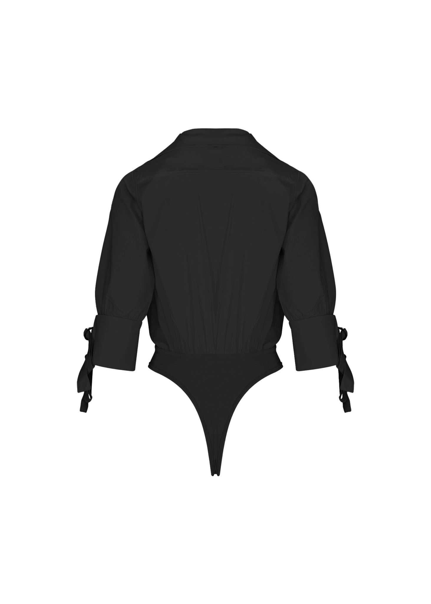 Consigue el ajuste impecable de una camisa con la funcionalidad de un bodysuit con nuestro elegante Bodysuit Camisero Negro "Lazo Chic". Esta prenda esencial de fondo de armario está confeccionada en un tejido de sastre nítido y en un atemporal color negro, y ha sido diseñada para permanecer perfectamente fajada y lisa sin abultamientos.