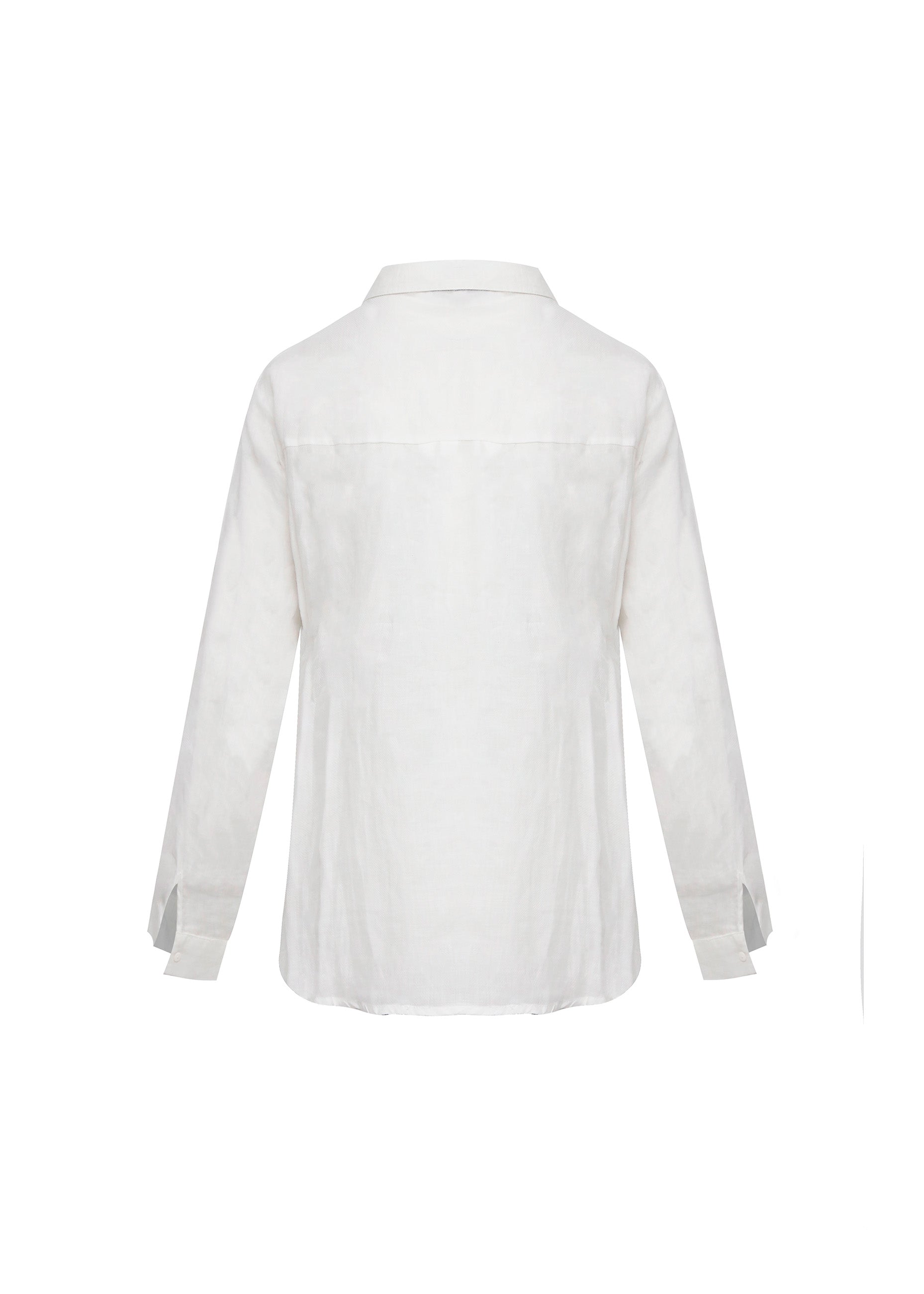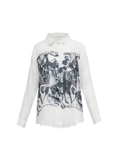 Confeccionada en un tejido liviano de color blanco con textura natural, esta blusa presenta un corte recto de sastrería clásica con cuello de solapa y manga larga. El elemento protagonista es un estampado pictórico en escala de grises posicionado en el panel frontal, que recrea una escena de inspiración ecuestre o histórica con trazos que emulan el grabado antiguo. El diseño se complementa con detalles de tipografía manuscrita que recorren el patrón gráfico, aportando un aire intelectual y sofisticado. Con un cierre de botones frontales ocultos y puños sencillos, esta pieza es ideal para quienes buscan un estilo minimalista con un punto de distinción creativa.