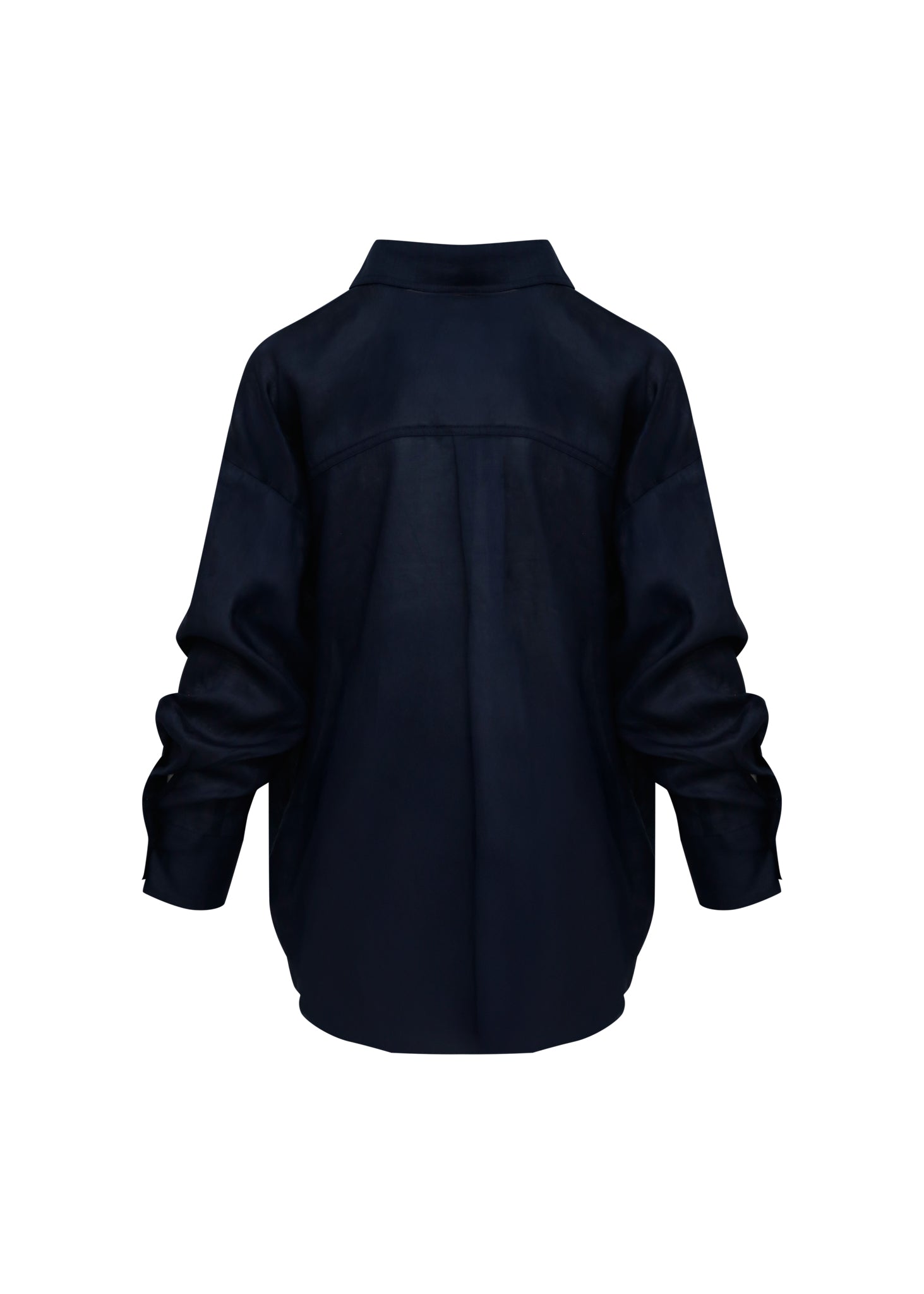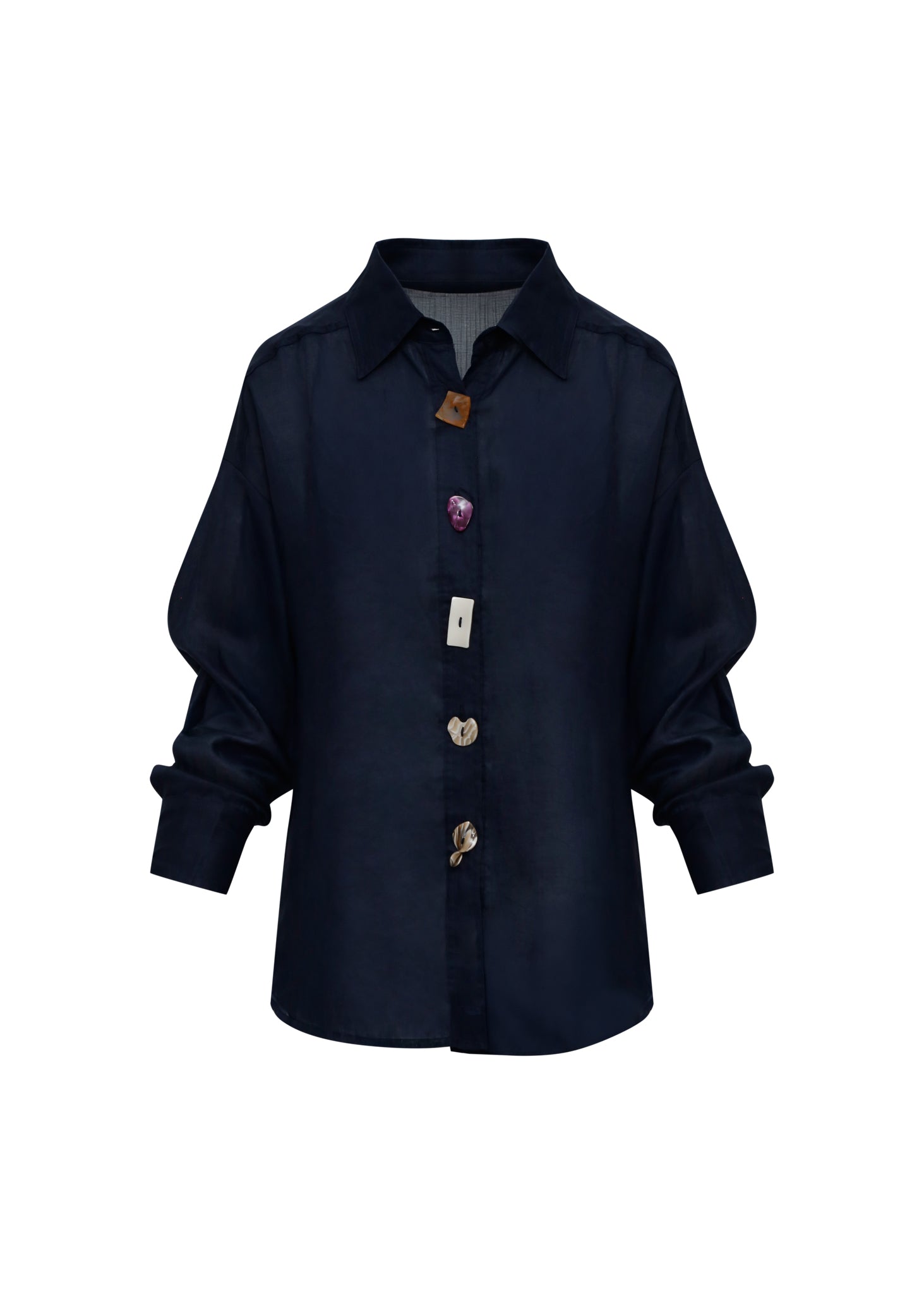Esta distintiva Camisa Oversize en color Azul Marino reinterpreta el clásico estilo abotonado con un toque artesanal y moderno, destacando principalmente por su impresionante hilera de botones esculturales de fantasía que varían en forma, color y material, convirtiendo el cierre en un punto focal llamativo. Confeccionada en un tejido de lino con una caída fluida, presenta un corte relajado, mangas amplias que se fruncen sutilmente en los puños y un cuello camisero tradicional, haciendo de esta prenda una pieza elegante y única, perfecta para elevar cualquier look diario o de noche.