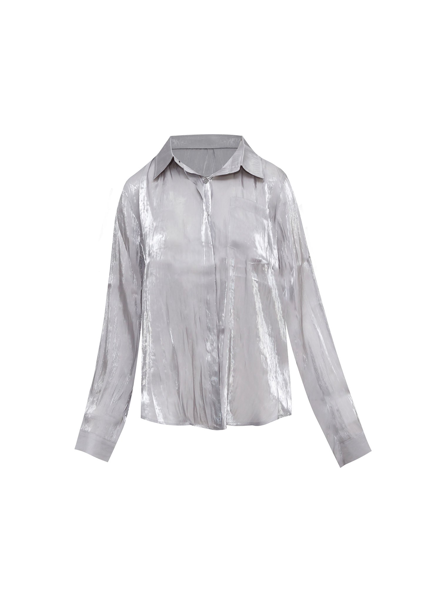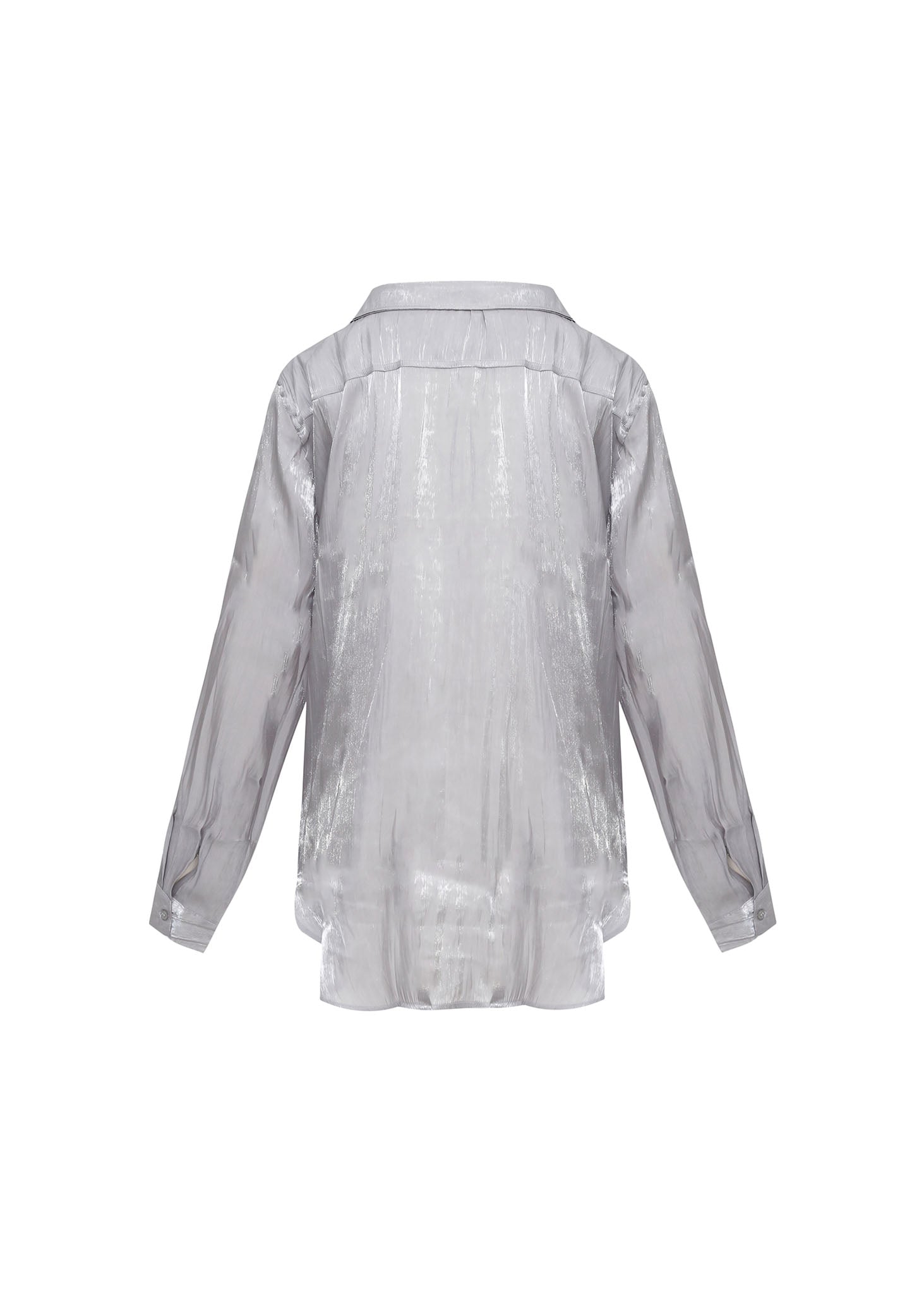 La Blusa Cosmos es una pieza esencial para inyectar lujo y textura a tu fondo de armario. Confeccionada en un tejido satinado de alto brillo, presenta un cautivador acabado arrugado o crinkle up que maximiza el efecto iridiscente del color Gris Plata, reflejando la luz con cada movimiento. Su corte clásico de camisa con cuello, mangas largas y puños abotonados se equilibra perfectamente con la modernidad del tejido, convirtiéndola en la opción ideal para un look de noche sofisticado o para elevar cualquier conjunto de smart casual a un nivel de absoluta distinción.