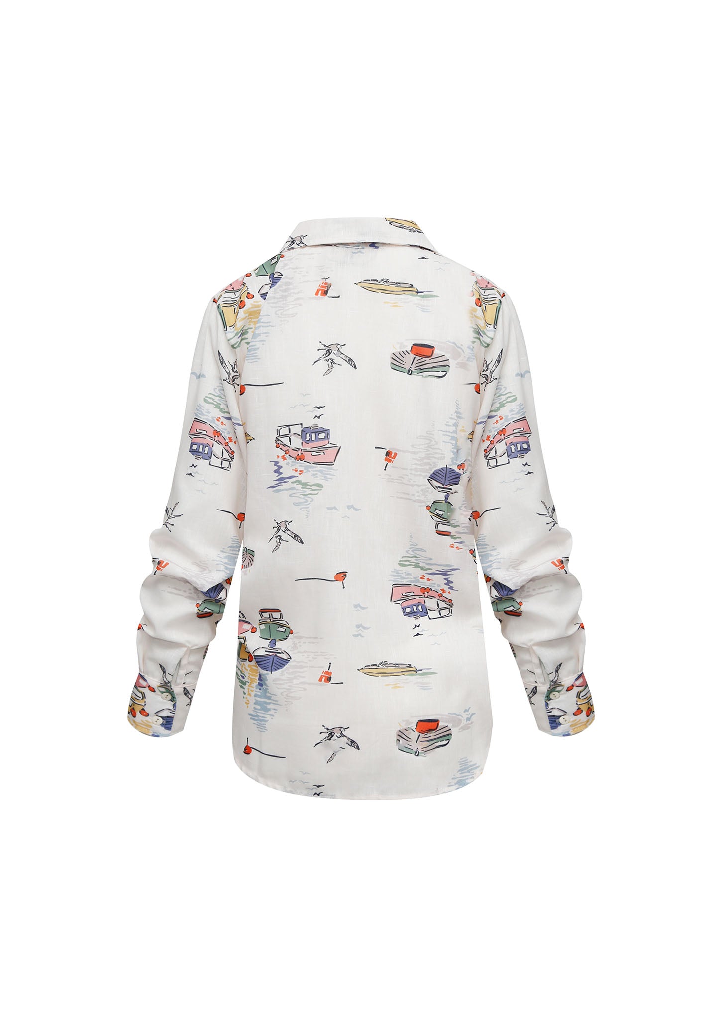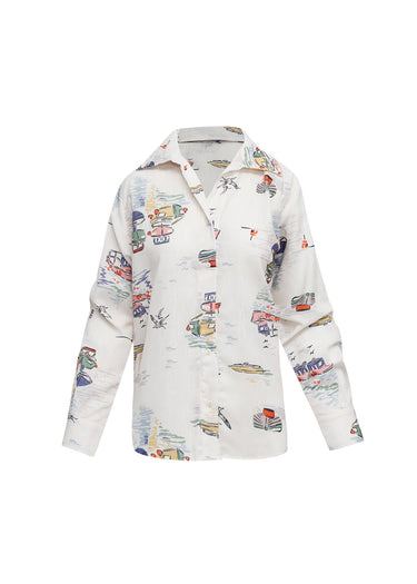 La pieza ideal para un estilo casual chic. Esta Sobrecamisa de corte relajado destaca por su estampado vintage de veleros y motivos costeros sobre fondo crema. Confeccionada en un tejido ligero, es perfecta para llevar abierta como chaqueta o abotonada. Añade un toque divertido y nostálgico a tu look al instante.