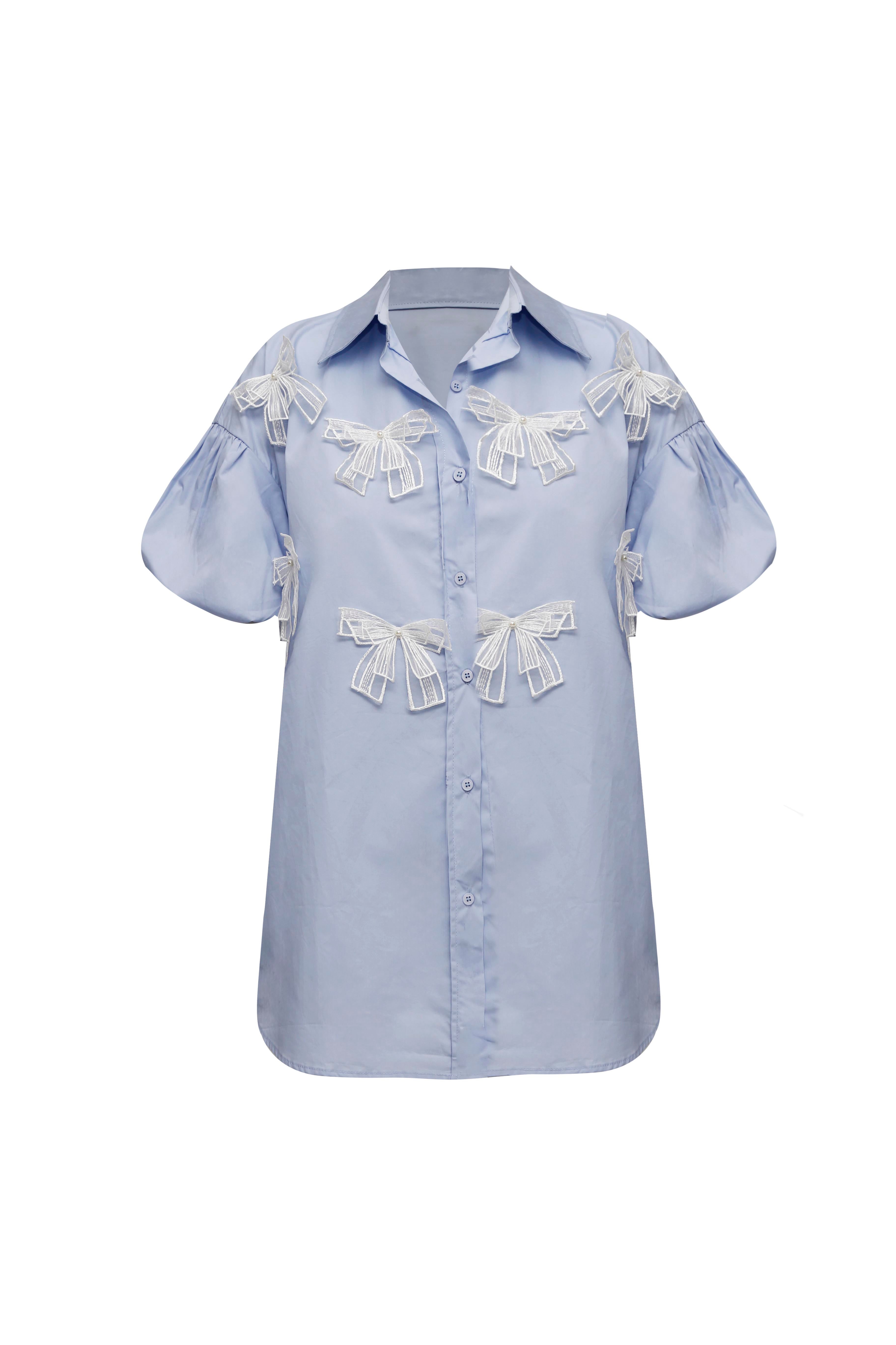 Blusón en algodón de silueta amplia y caída ligera, diseñado para brindar comodidad sin perder sofisticación. Su tono azul suave se realza con delicados apliques en forma de lazos en contraste, que aportan un aire romántico y femenino. Con manga corta abullonada y cuello camisero clásico, es una prenda versátil