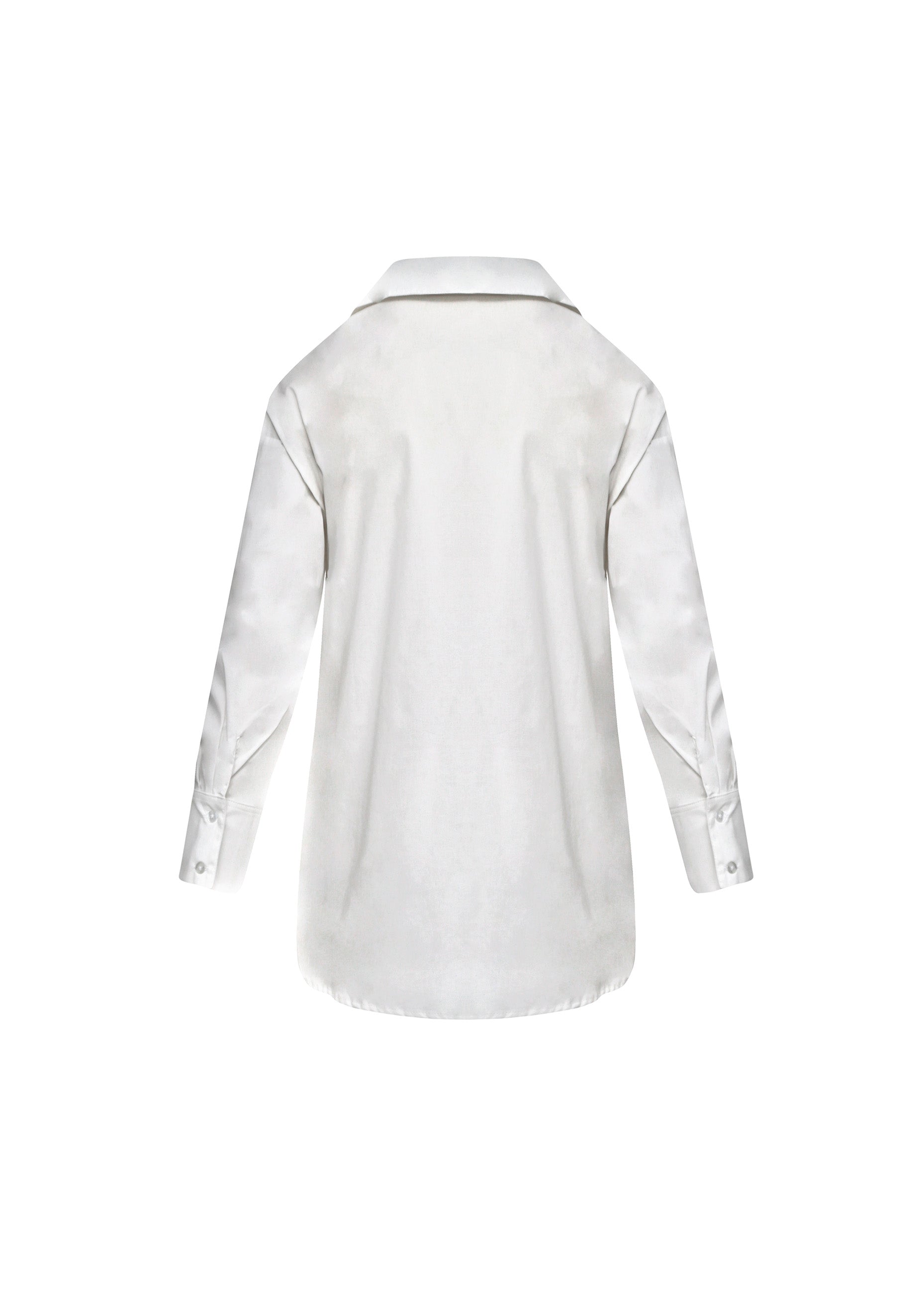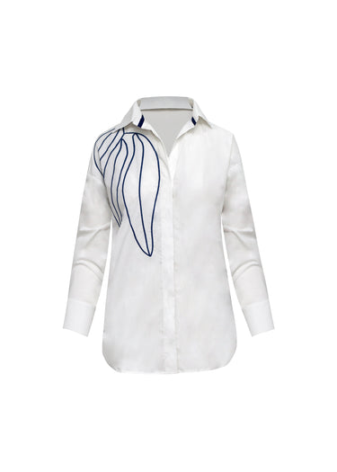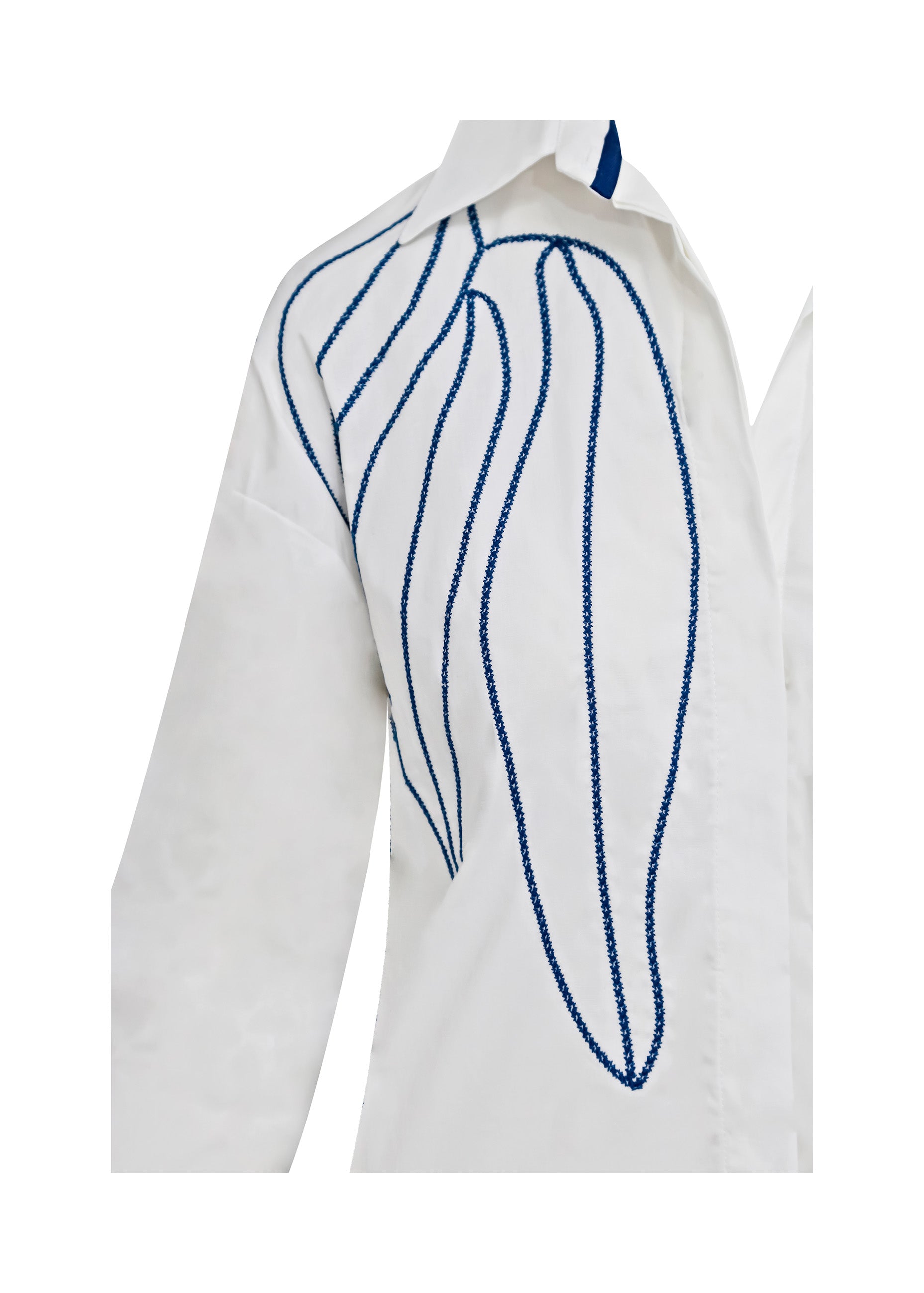 Confeccionada en un tejido de popelina blanca de tacto suave, esta prenda presenta un corte recto y estructurado con cuello de solapa tradicional y una tapeta de botones oculta que realza su minimalismo. El elemento protagonista es un bordado lineal de gran formato en azul marino, que dibuja la silueta de una hoja orgánica sobre el hombro derecho y se extiende hacia el pecho. El diseño se completa con mangas de hombro caído y puños anchos bien definidos, logrando un equilibrio perfecto entre la elegancia formal y un toque creativo de autor.