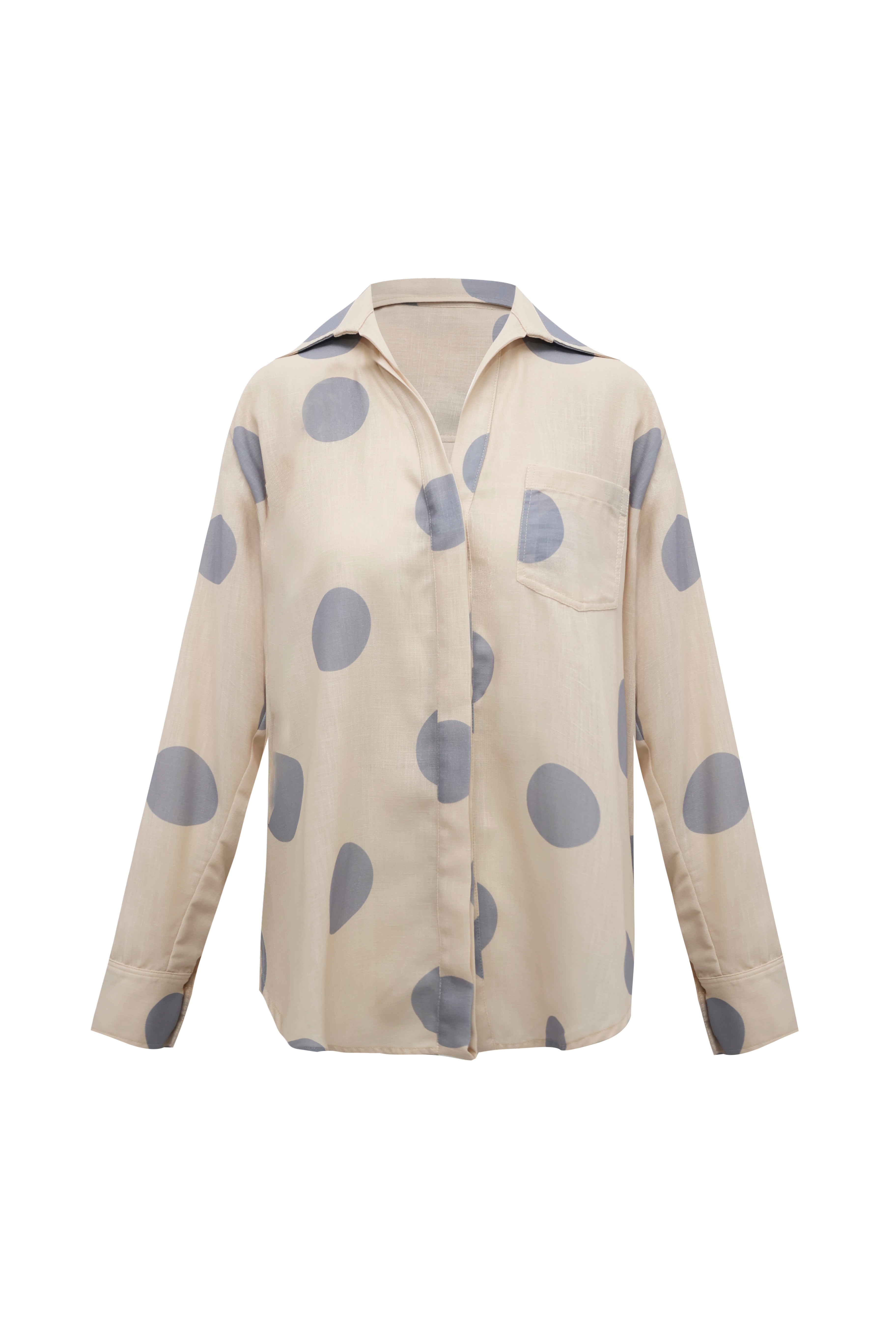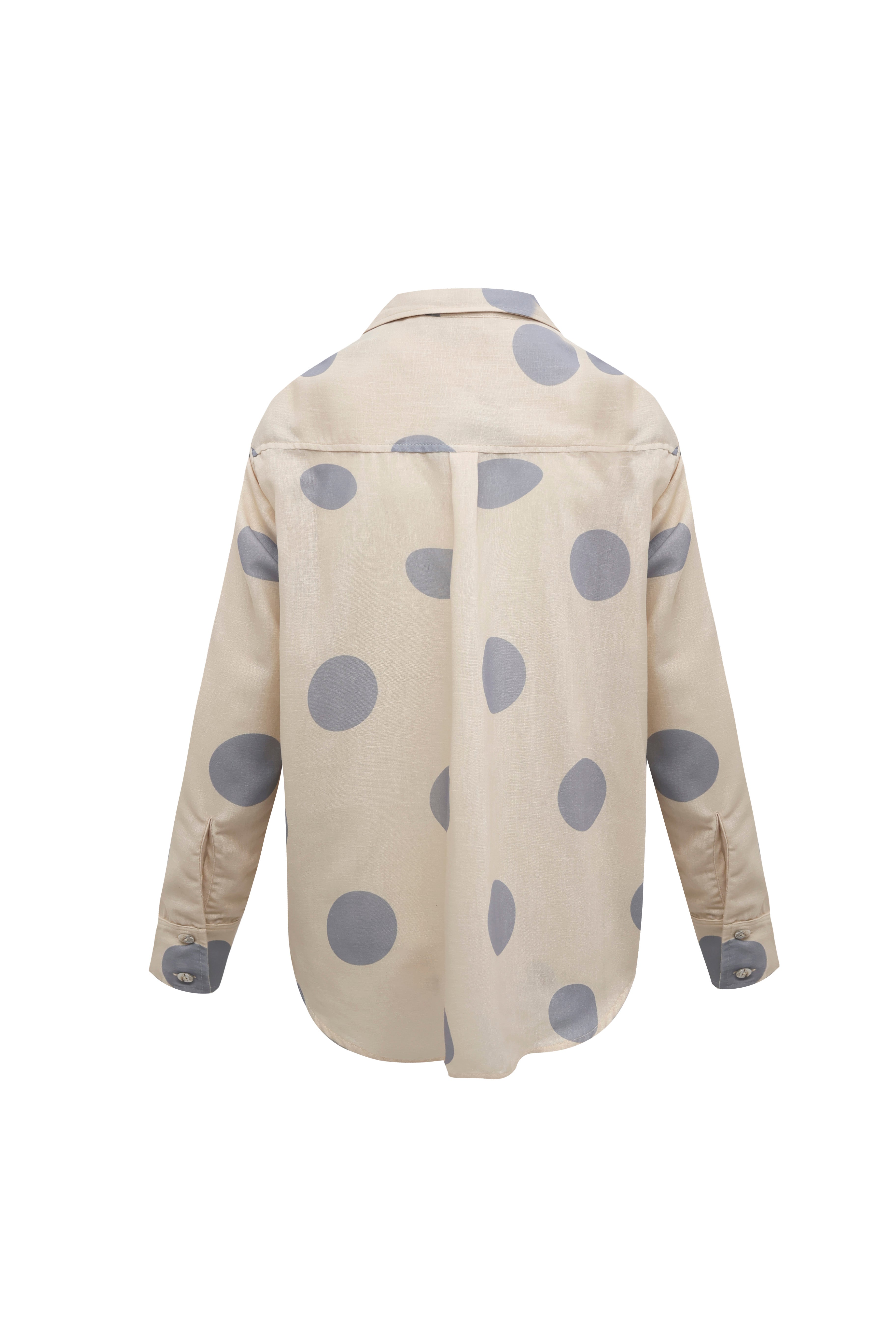 Una reinterpretación moderna de un clásico atemporal. La camisa Pebble destaca por su sofisticado estampado de lunares orgánicos en tono gris ceniza sobre una base de lino y viscosa en color crema. Su diseño de inspiración masculina se suaviza con una caída fluida y un tacto excepcionalmente suave.
