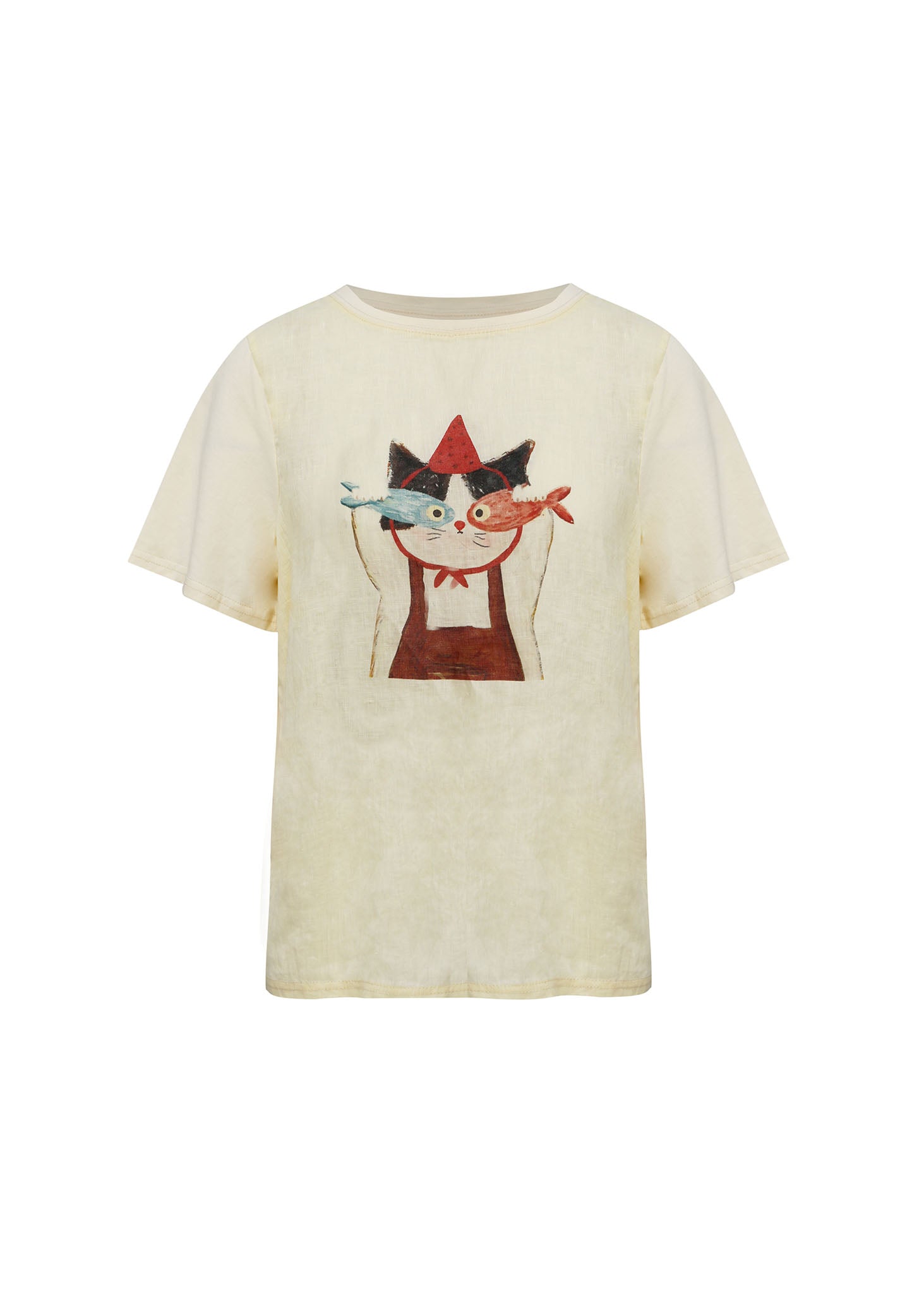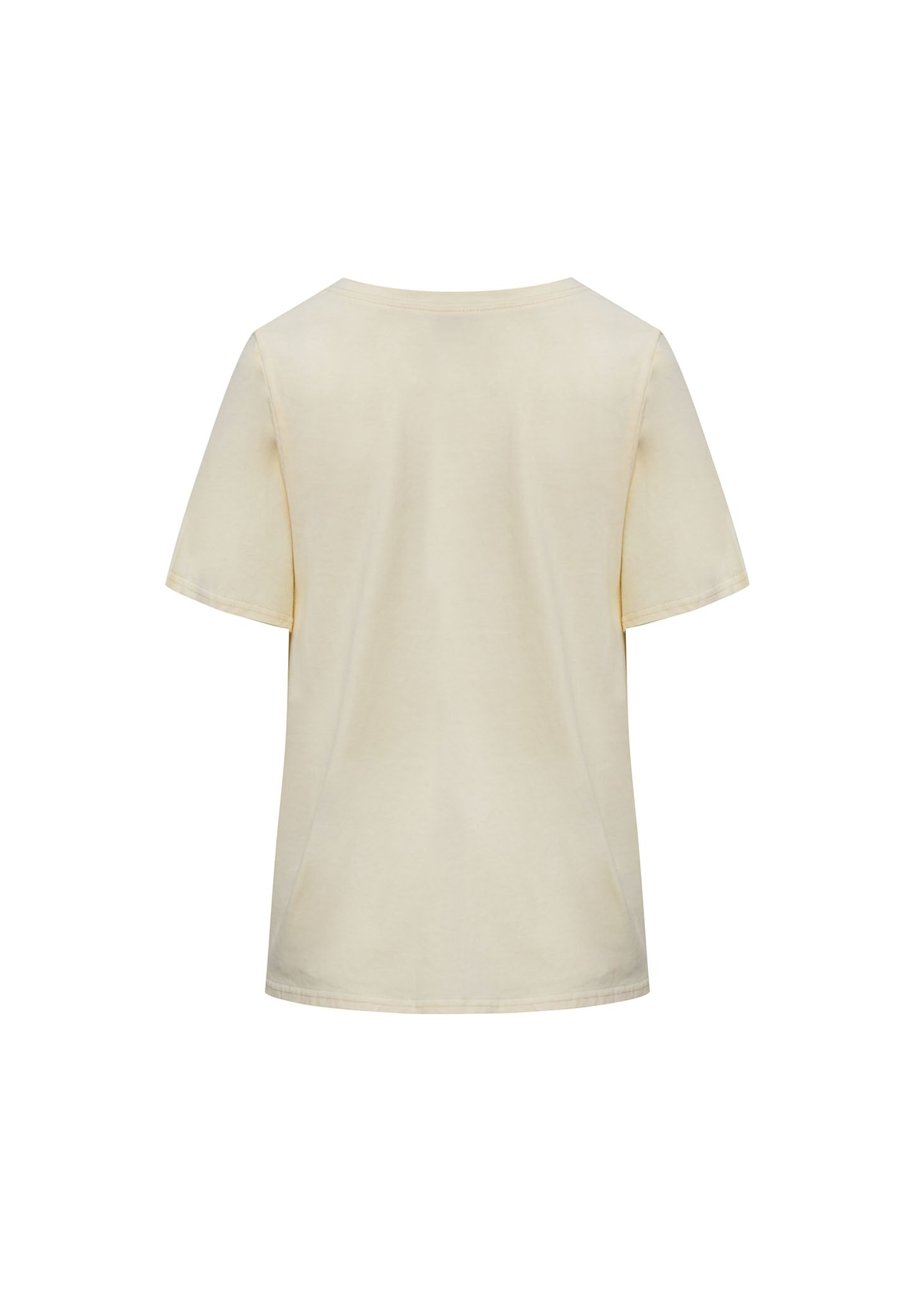 Esta es una camiseta de corte clásico, confeccionada en un jersey suave de un amarillo solar que irradia energía y optimismo. El foco de la pieza es el estampado frontal artístico, que presenta una explosión de colores vibrantes y llamativos. Este diseño gráfico audaz convierte una prenda básica en una declaración de estilo effortless y maximalista.