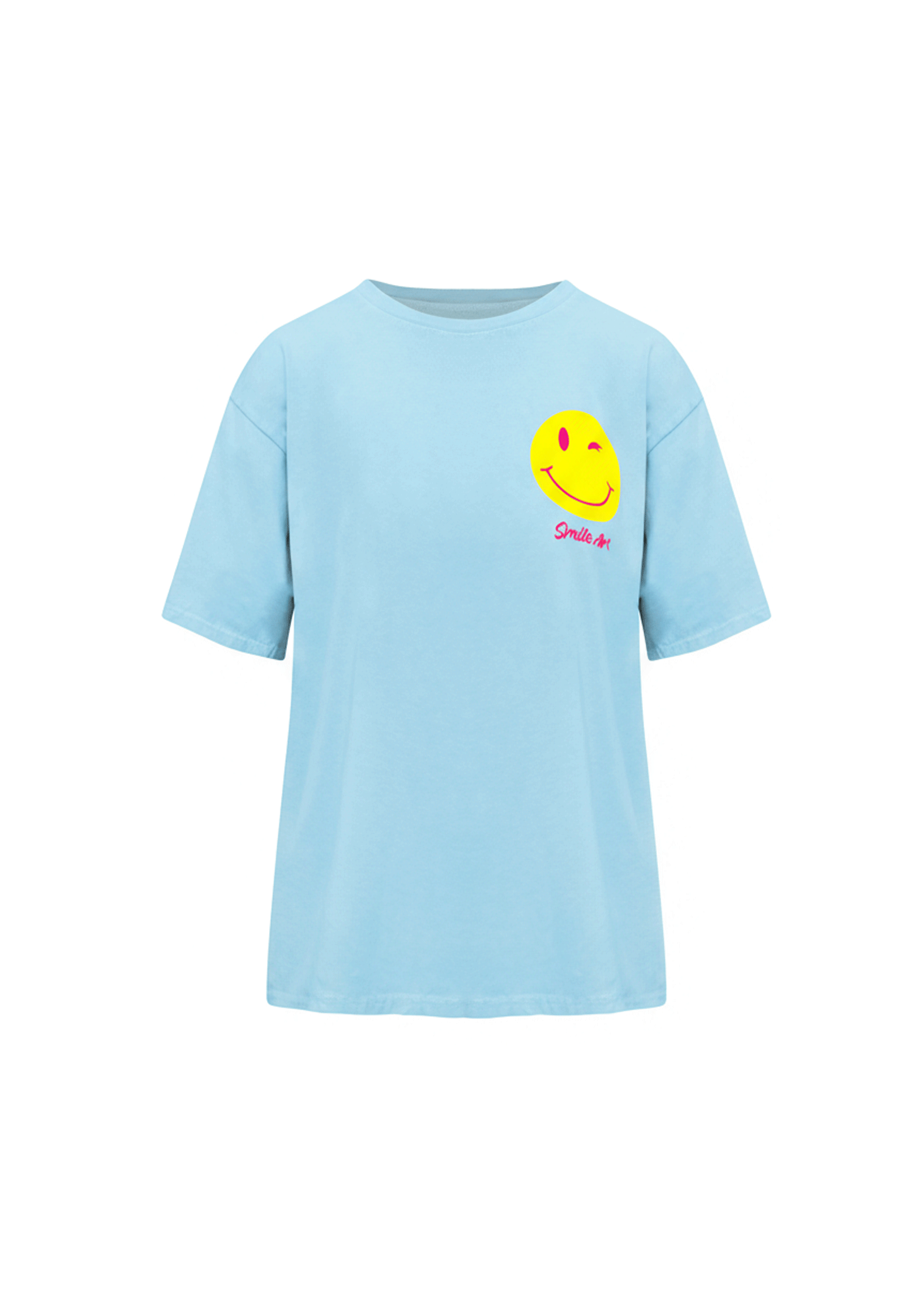 Añade un toque de diversión y color a tu armario con esta camiseta de corte oversize en un refrescante color azul cielo. Confeccionada para la máxima comodidad, presenta un alegre estampado de un smiley guiñando el ojo en amarillo brillante y fucsia. Su corte relajado y moderno te ofrece la comodidad perfecta para cualquier ocasión casual. El mood perfecto para llevar la alegría y el estilo streetwear a tu día a día.