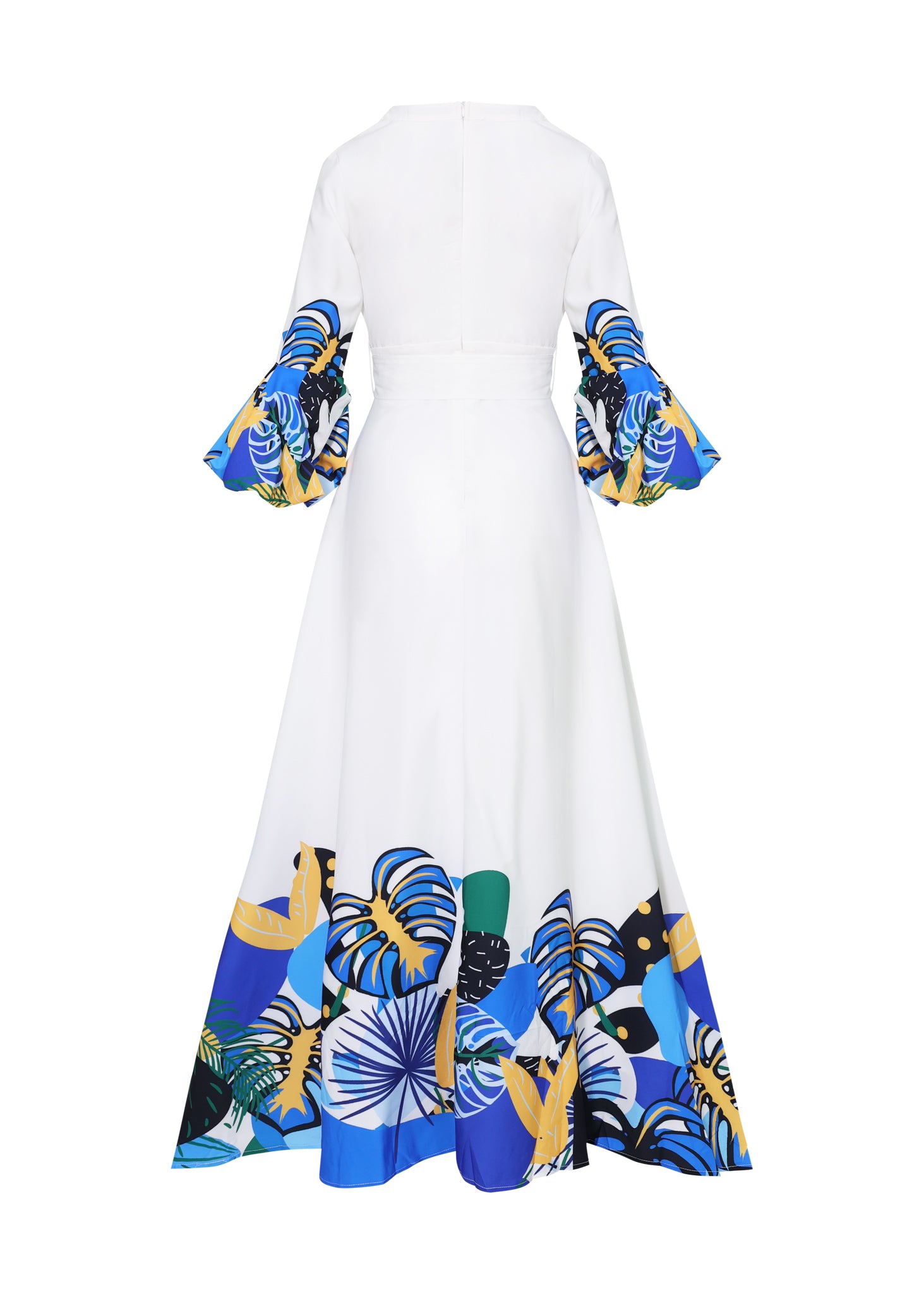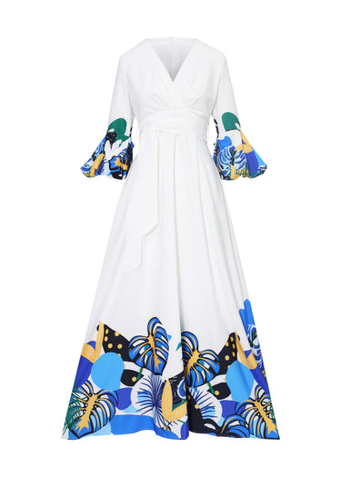 Este impactante vestido maxi, en un blanco puro, presenta un elegante diseño cruzado con favorecedor escote en V. La prenda destaca por su vibrante estampado tropical de bloques de color (azul, amarillo, verde) concentrado en el bajo de la falda y los puños acampanados de las mangas. Incluye un lazo a juego para definir la cintura. Ideal para eventos de verano y looks de resort sofisticados.