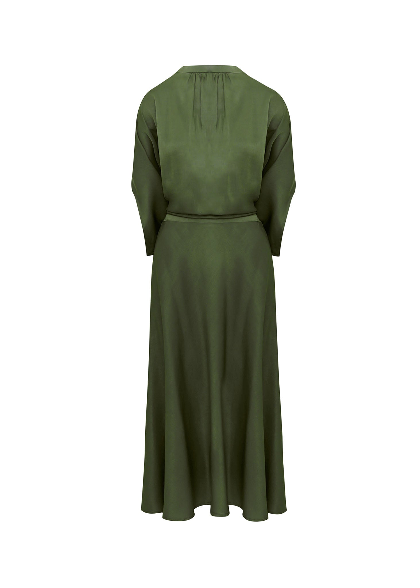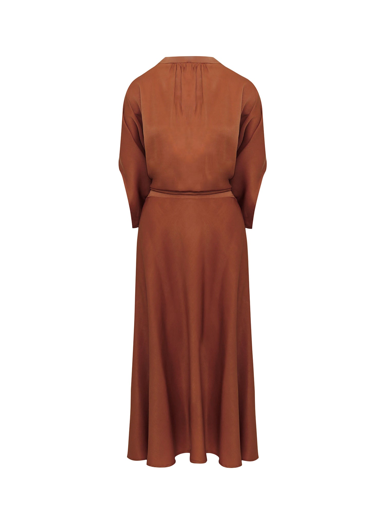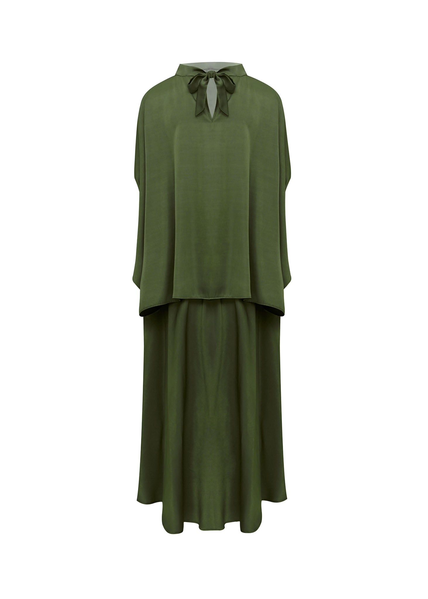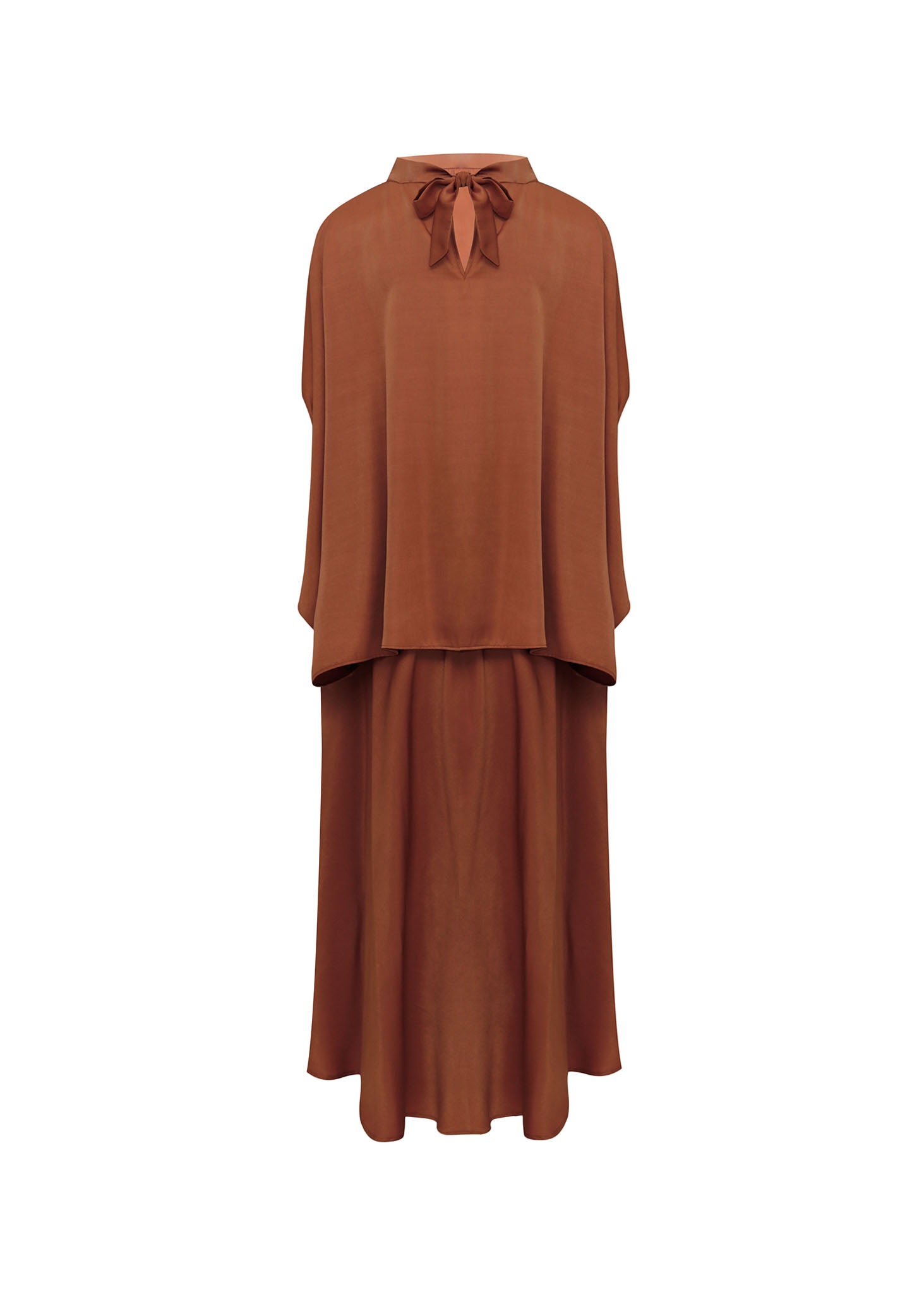 Este sofisticado Conjunto de Dos Piezas redefine la elegancia con un estilo fluido y minimalista en un rico tono Marrón Cobre. Presenta una blusa tipo capa de corte oversize con una caída espectacular, destacada por un cuello alto y un encantador lazo de seda en el escote. Se combina con una falda midi acampanada a juego que equilibra el volumen de la parte superior. Confeccionado en un tejido suave y fluido, este conjunto es ideal para un look de transición que irradia lujo discreto y es perfecto para eventos de día, reuniones formales o un outfit de oficina con un toque artístico.