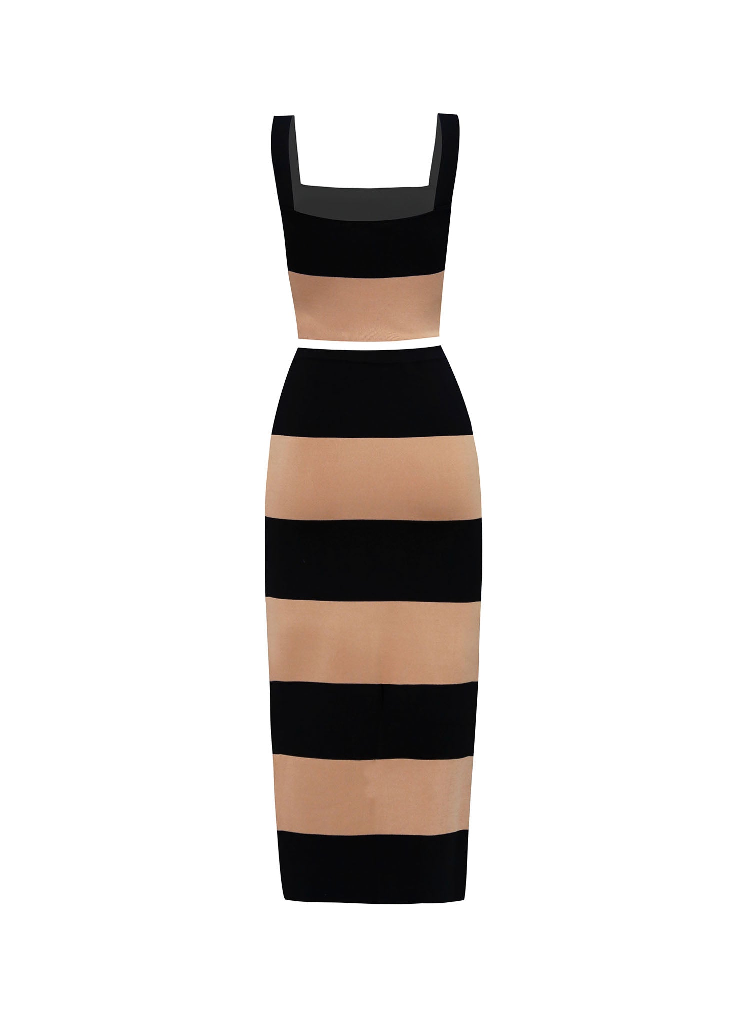 El crop top de escote recto y tirantes anchos ofrece un aire contemporáneo y versátil, ideal para estilismos tanto casuales como más sofisticados. La falda de cintura alta y corte entallado cae suavemente hasta media pantorrilla, generando un efecto visual alargador gracias a las bandas anchas que alternan colores, simulando una estética "color block" muy en tendencia.