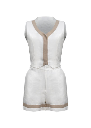 Un conjunto que expresa sofisticación serena y feminidad contemporánea. Su silueta estructurada en la parte superior realza la figura con sutileza, mientras el short aporta frescura y ligereza. El contraste entre el tono marfil y los acentos arena enmarca la prenda con un aire refinado, minimalista y muy chic. Es una propuesta versátil y elegante, ideal para una mujer segura de su estilo, que busca piezas impecables para el día con un toque de distinción.