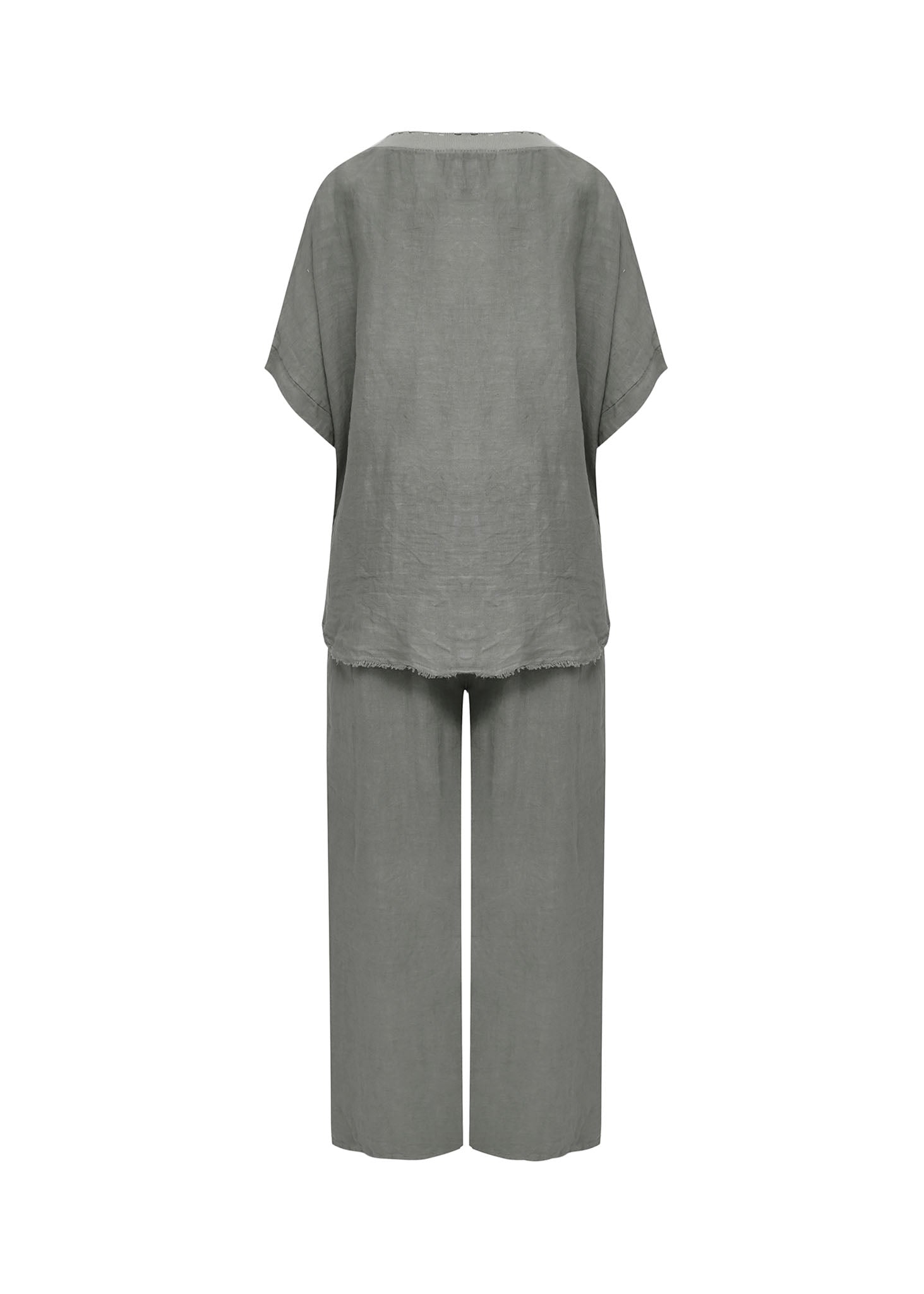 La parte superior es una blusa de silueta relajada con escote en "V" y mangas cortas caídas, donde las estrellas se posicionan de forma asimétrica en el hombro y el costado inferior. El pantalón, de corte recto y bota ancha, complementa el diseño con estrellas estratégicamente ubicadas que añaden un destello de luz a cada paso. Con sus acabados de costura vista y bordes rústicos, esta pieza es ideal para quienes buscan un estilo bohemio elevado con un aire cósmico y sofisticado.