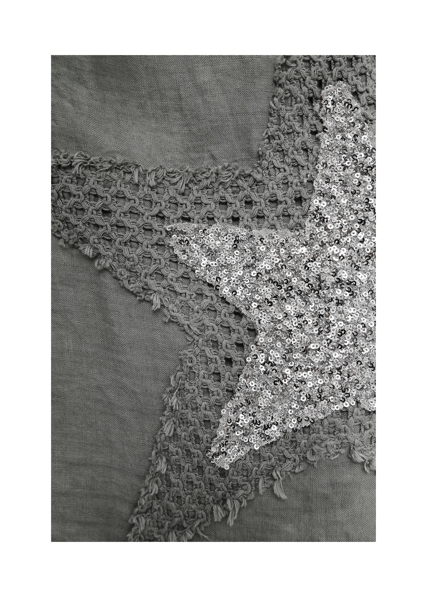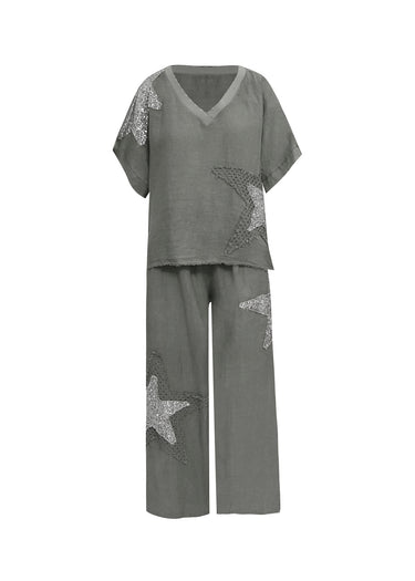 Este conjunto de dos piezas en color gris antracita es una propuesta que fusiona la comodidad del estilo lounge con un toque de fantasía brillante. Confeccionado en un tejido con textura natural y apariencia de lino, el conjunto destaca por sus aplicaciones de estrellas en lentejuelas plateadas, que están bordadas sobre parches de tela con bordes deshilachados para un look artesanal y moderno.