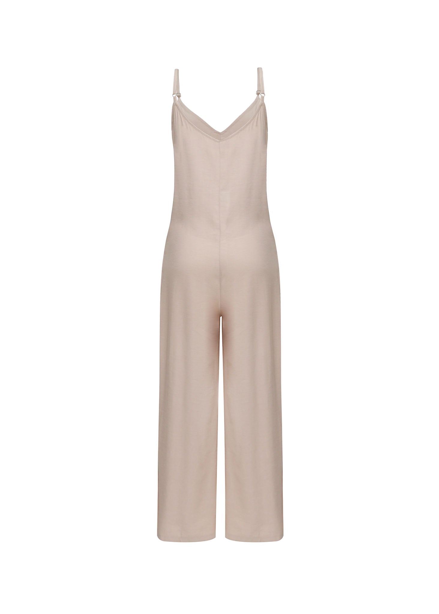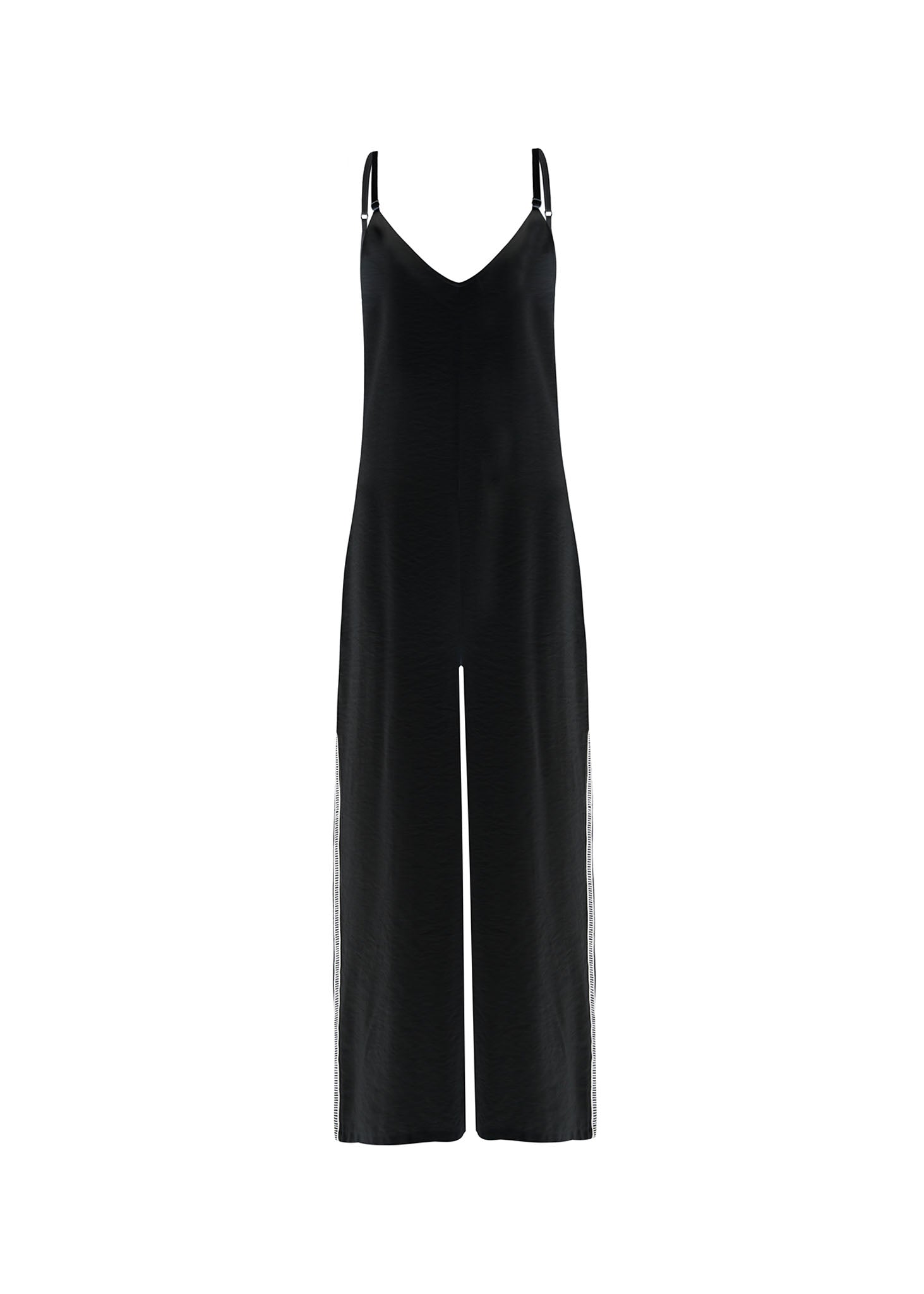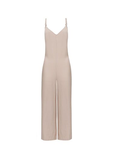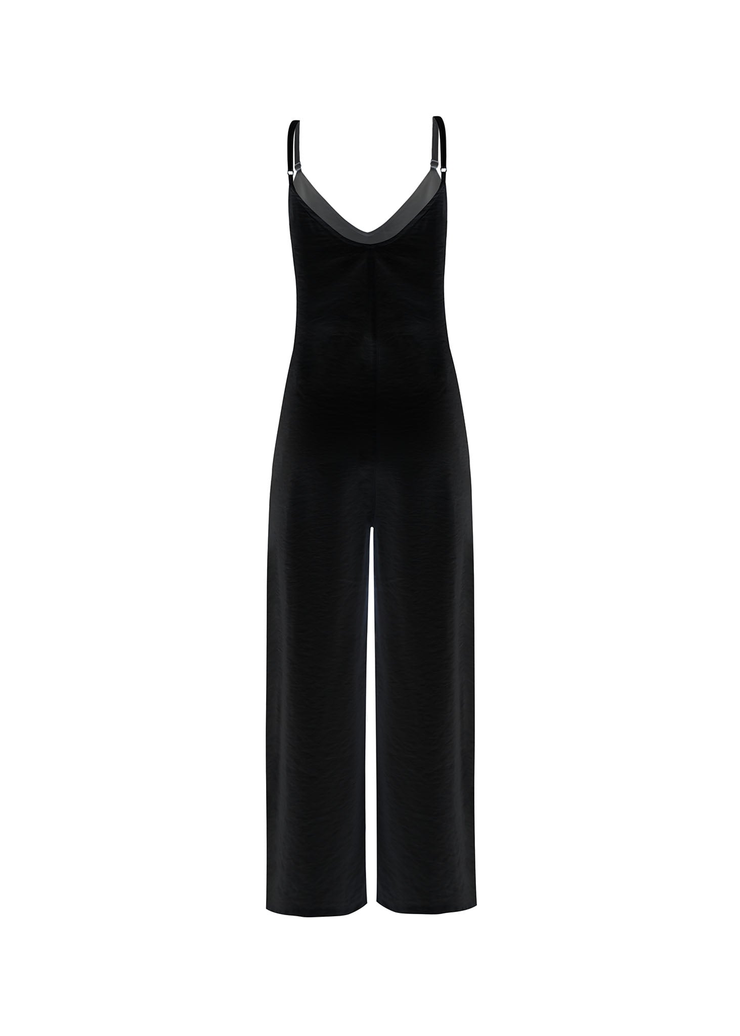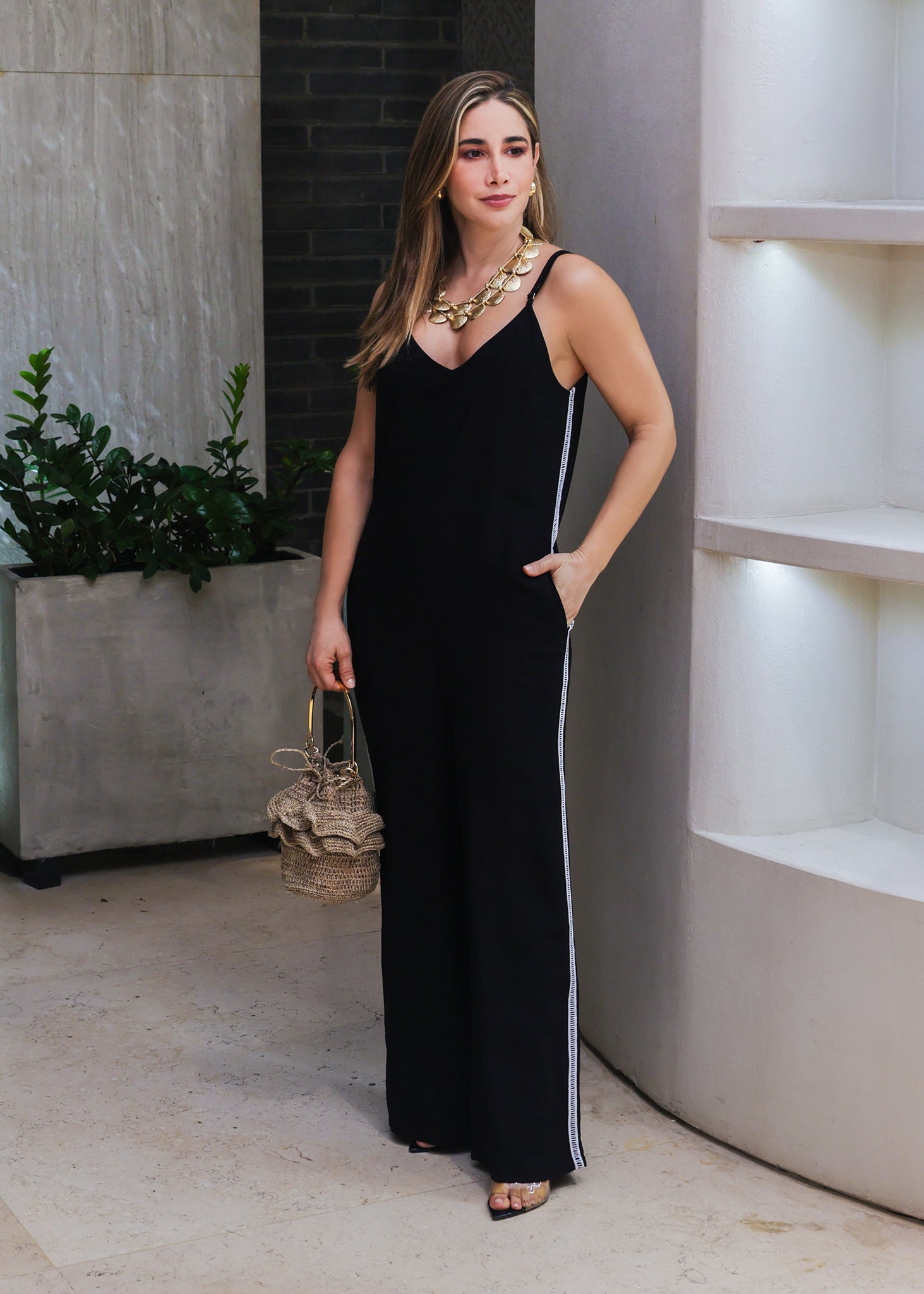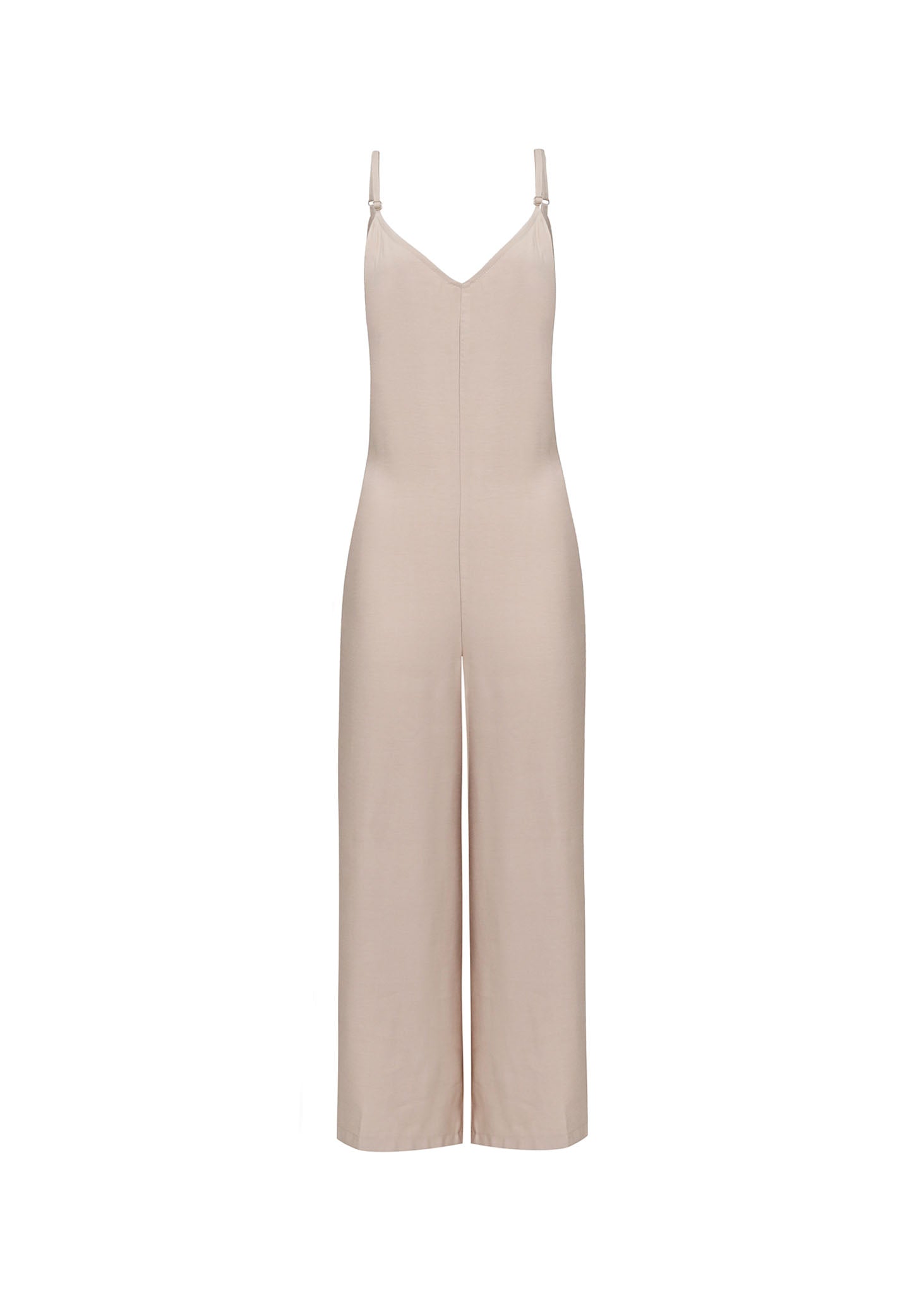 Un básico versátil y elegante. Con tirantes finos ajustables y un corte de pierna amplia, este enterizo en tono neutro es perfecto para looks relajados de día o estilizados de noche. Su diseño minimalista lo convierte en un esencial atemporal en tu armario