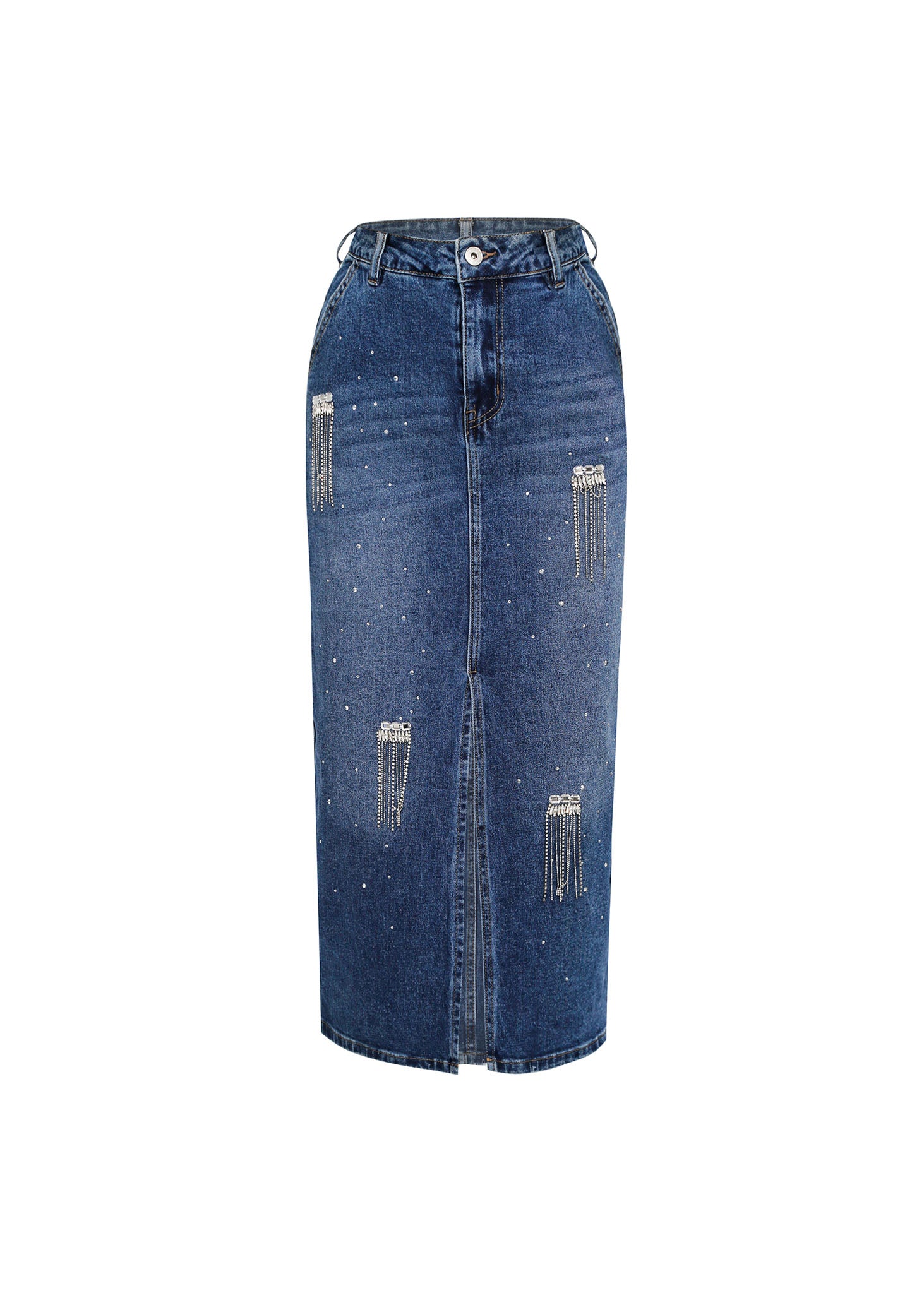 Falda con apliques en strass que captura la luz con cada movimiento. Los detalles brillantes transforman un básico en una pieza statement, perfecta para noches especiales o cuando quieras destacar. Confeccionada para comodidad y estilo, esta falda combina elegancia con un toque de glamour que te hará sentir segura y radiante.