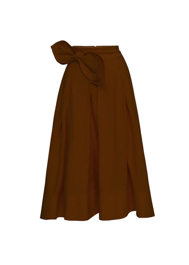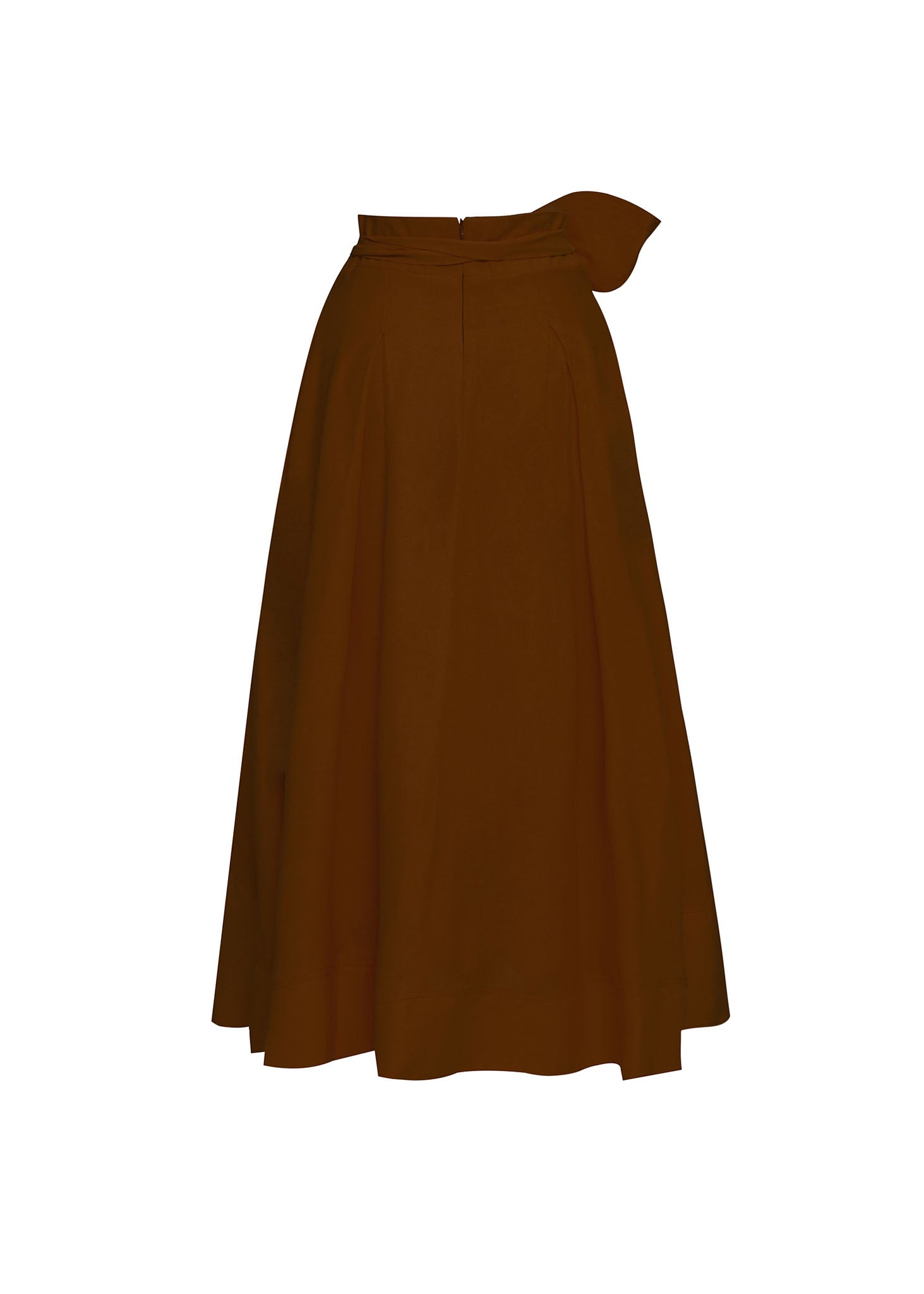 Esta es una falda de corte maxi y silueta fluida, confeccionada en un tejido con caída en un sofisticado tono café (mocha o tierra). El diseño se eleva con un detalle floral tridimensional posicionado estratégicamente en la cintura o cinturón. Este aplique de flor inyecta un toque romántico y couture, convirtiendo una prenda simple en un ejercicio de feminidad statement.