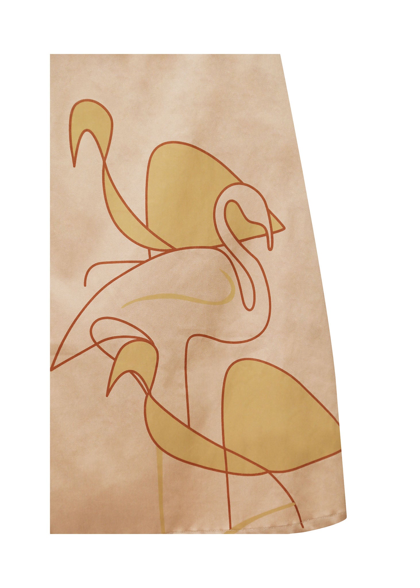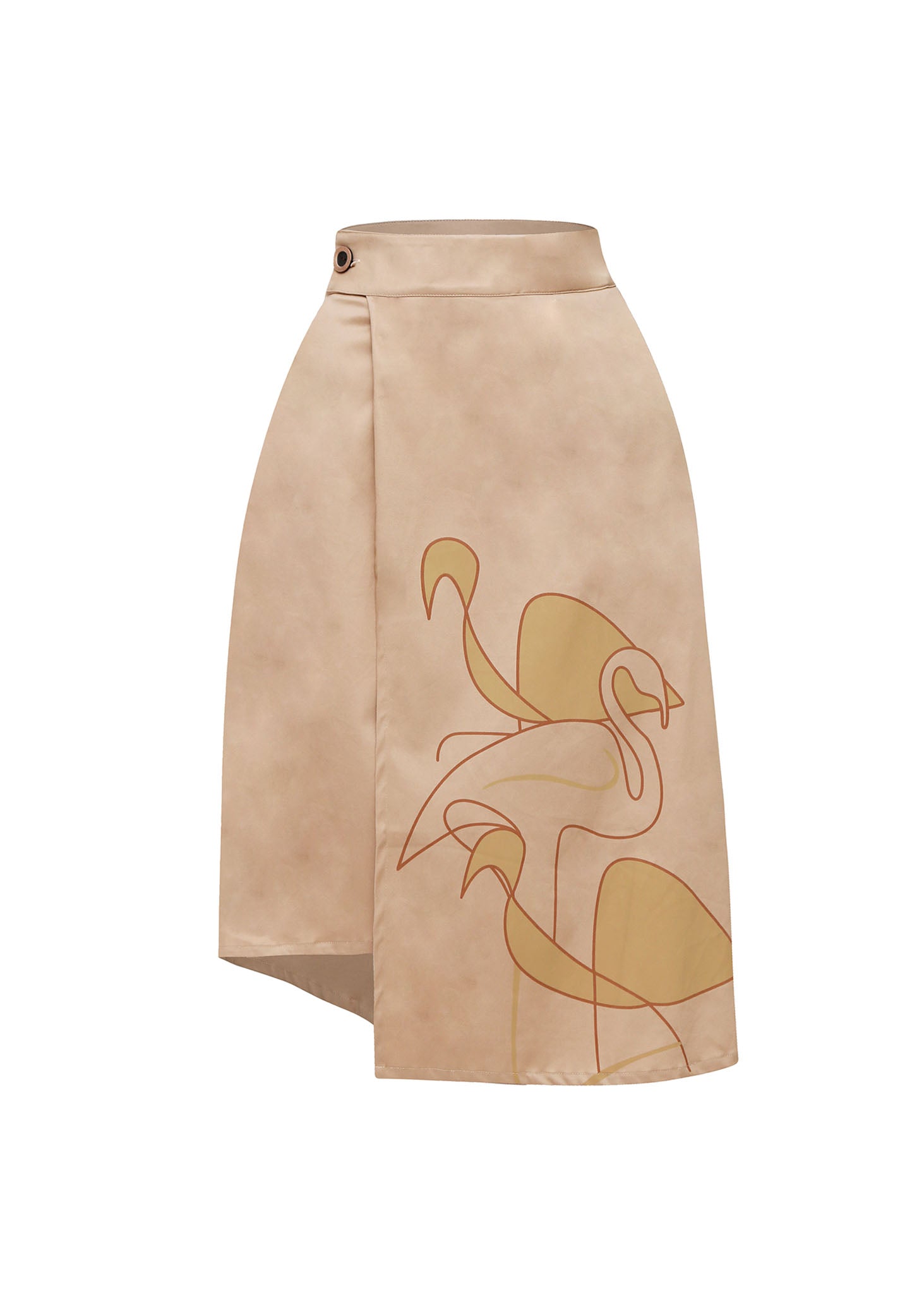 Esta falda única es la pieza clave para un estilo chic y moderno. Su diseño de corte asimétrico y cruzado en un suave tono beige con acabado satinado te hará lucir sofisticada. El delicado estampado de flamencos de estilo lineal añade un toque artístico y original. Perfecta para un evento especial o una salida de noche, combínala con un top sencillo para dejar que la falda sea la protagonista.
