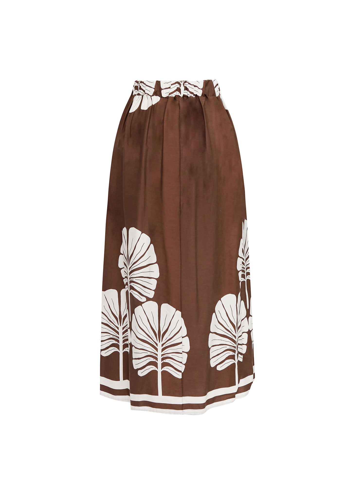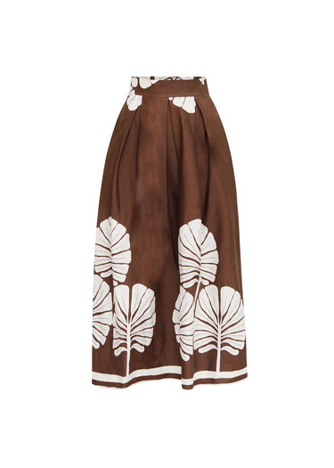 Esta falda es la pieza perfecta para un estilo fresco y sofisticado. Su corte amplio y fluido en un color marrón profundo se complementa con un llamativo estampado de hojas blancas que crean un contraste visual único, presentando una cintura lisa en la parte frontal con un detalle de pliegues que le da una caída elegante, y un cierre de botón para un ajuste cómodo. Es un pantalón versátil y fácil de combinar, perfecto para un look relajado pero chic.