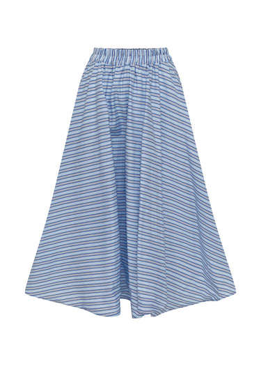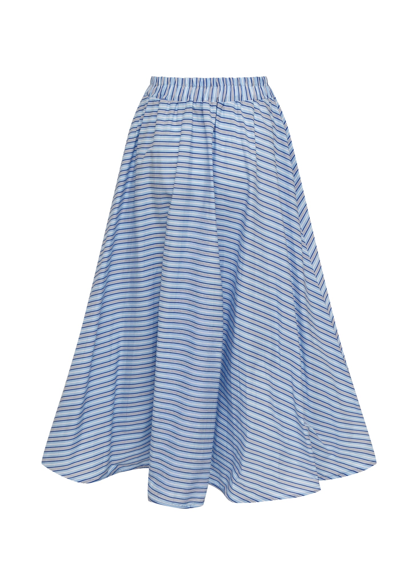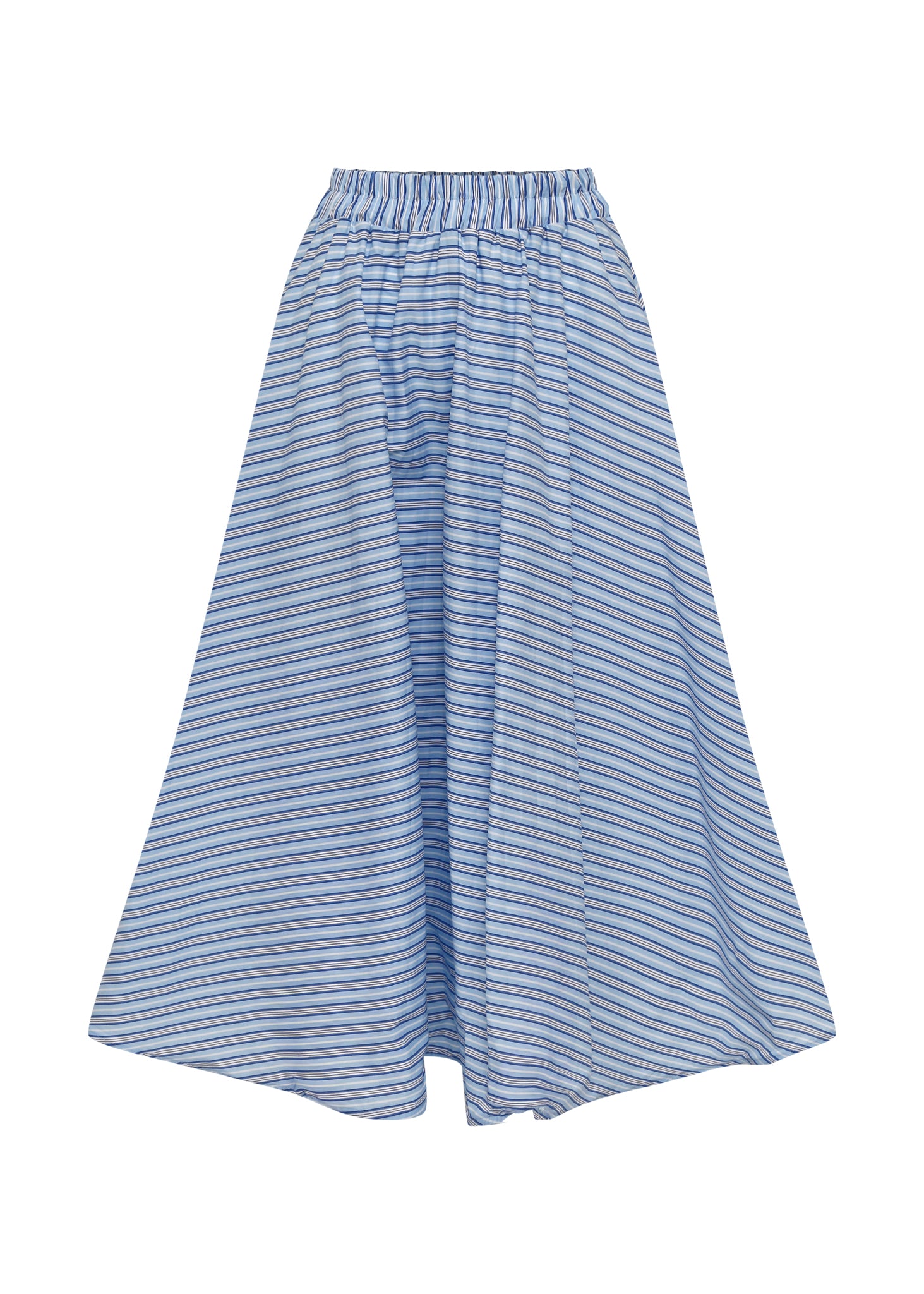 Esta falda de rayas azul, confeccionada en algodón de alta calidad, ofrece comodidad y durabilidad. Su cintura compuesta garantiza un ajuste perfecto y soporte adicional, ideal para un uso prolongado. Perfecta para un estilo casual o formal, combina facilidad de movimiento con un acabado sofisticado.