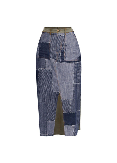 Esta falda midi de alta gama es una pieza de diseño vanguardista que celebra la técnica del patchwork mediante una sofisticada reconstrucción textil. La prenda se caracteriza por una amalgama de paneles de mezclilla en diversas tonalidades y texturas —desde denim liso hasta patrones de espiga y tejidos geométricos— unidos por pespuntes blancos visibles que evocan una estética artesanal y deconstruida. El diseño de tiro alto integra una pretina en tono verde oliva que contrasta cromáticamente con el cuerpo azul de la falda, cerrando con un botón clásico. Presenta una pronunciada apertura frontal asimétrica que revela un forro interior en el mismo tono oliva, aportando dinamismo al movimiento y una estructura visual arquitectónica. Es una prenda de declaración ideal para elevar estilismos urbanos con un enfoque en la sostenibilidad visual y el lujo contemporáneo.