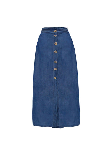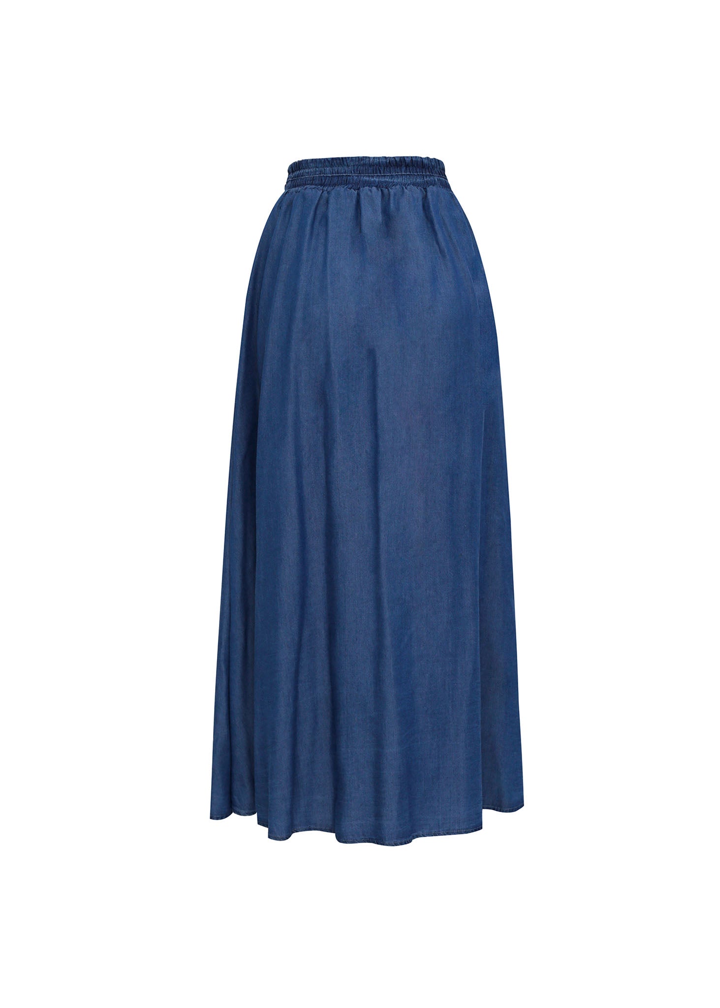 Falda larga confeccionada en denim azul clásico, de corte recto y estilo atemporal. Su diseño versátil combina la comodidad del tejido vaquero con un aire moderno y femenino. Cuenta con cintura ajustada, bolsillos funcionales y abertura frontal/trasera (opcional según diseño), que aportan un toque casual y favorecedor. Ideal para looks diarios, combinada con camisetas básicas, blusas o chaquetas ligeras.