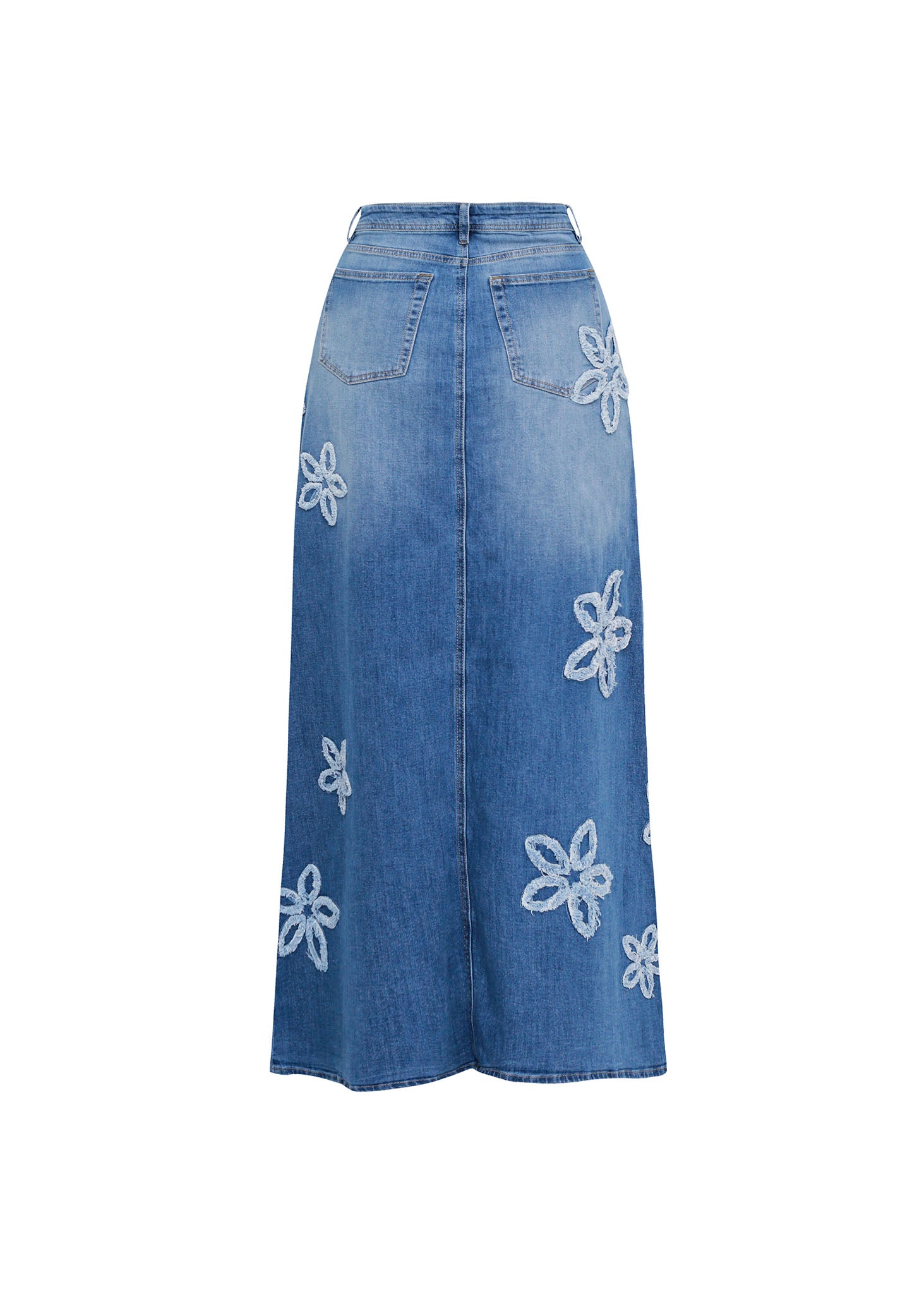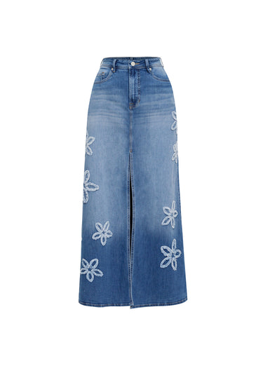 Esta falda de silueta maxi redefine el clásico denim mediante una estética femenina y artesanal. La prenda está confeccionada en una mezclilla azul con un lavado medio degradado que aporta un aire vintage y relajado. Su diseño de tiro alto destaca por una prominente abertura central que facilita el movimiento y añade un toque contemporáneo. El elemento distintivo son las aplicaciones de flores en relieve 3D distribuidas de manera asimétrica, elaboradas con bordes desflecados que refuerzan el estilo orgánico de la pieza. Con bolsillos funcionales y pasadores para cinturón, esta falda es una declaración de moda que combina la robustez del jean con la delicadeza del detalle botánico.