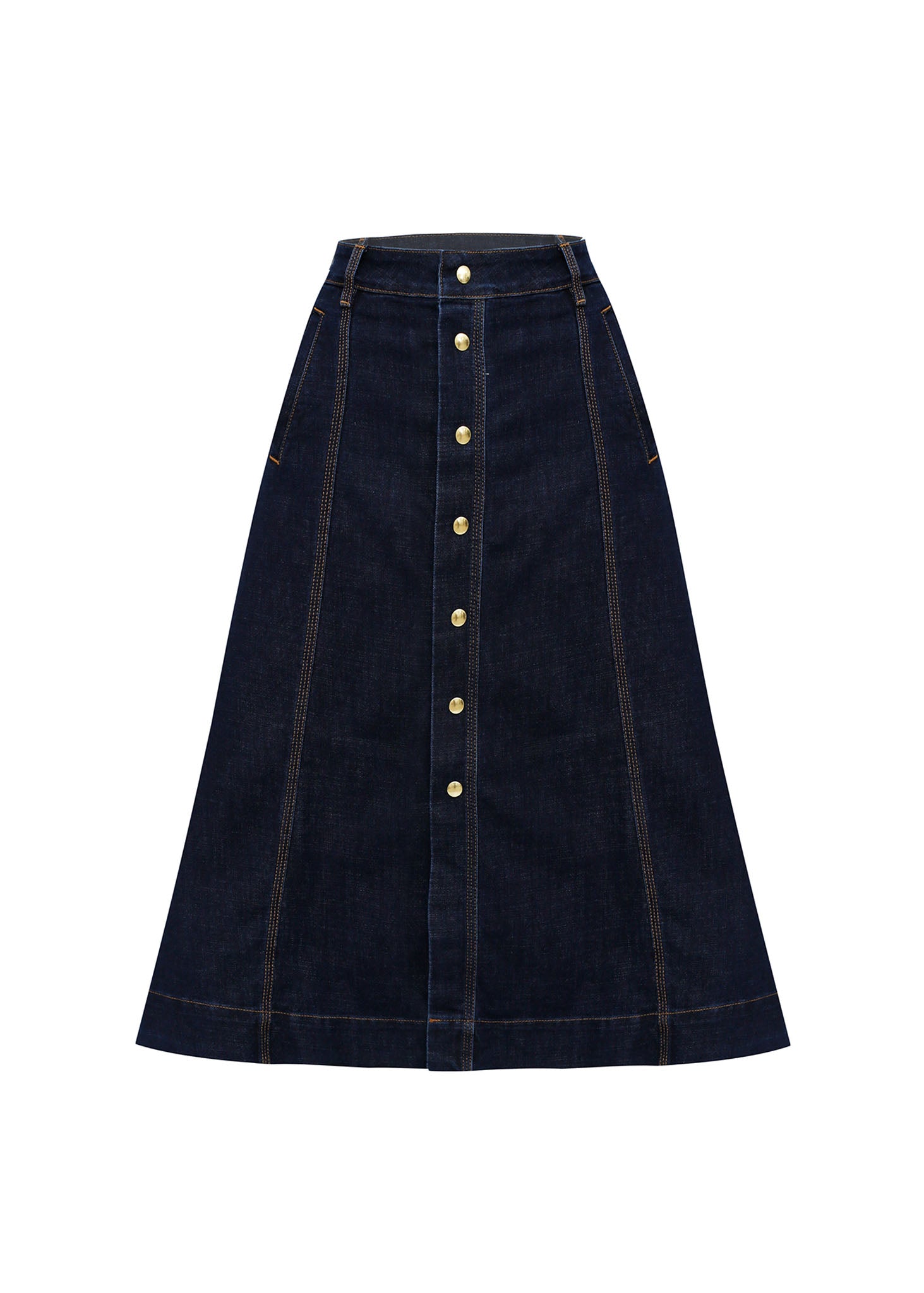 Esta falda midi de silueta evasé destaca por su confección en denim de alta densidad en un tono indigo profundo, ofreciendo una estética pulida y atemporal. La prenda presenta un diseño de tiro alto que estiliza la figura, acentuado por una hilera central de botones metálicos en color dorado que recorren todo el frente, aportando un contraste de lujo. Su estructura se define mediante costuras verticales reforzadas con pespuntes en contraste que imitan la sastrería clásica, brindando mayor cuerpo y definición al vuelo de la falda. Con bolsillos laterales discretos y un bajo de terminación limpia, esta pieza es un básico elevado, ideal para crear conjuntos de oficina sofisticados o estilismos casuales de aire retro-chic.