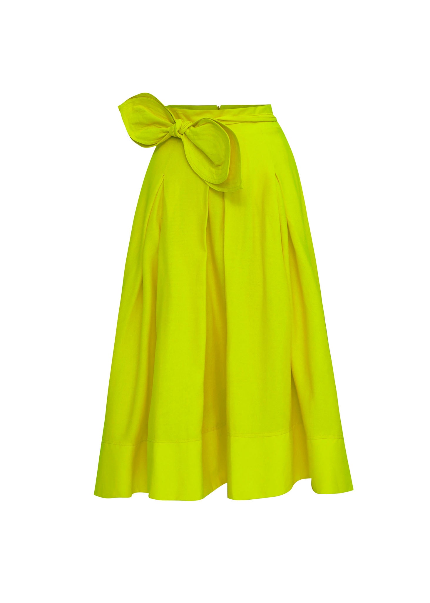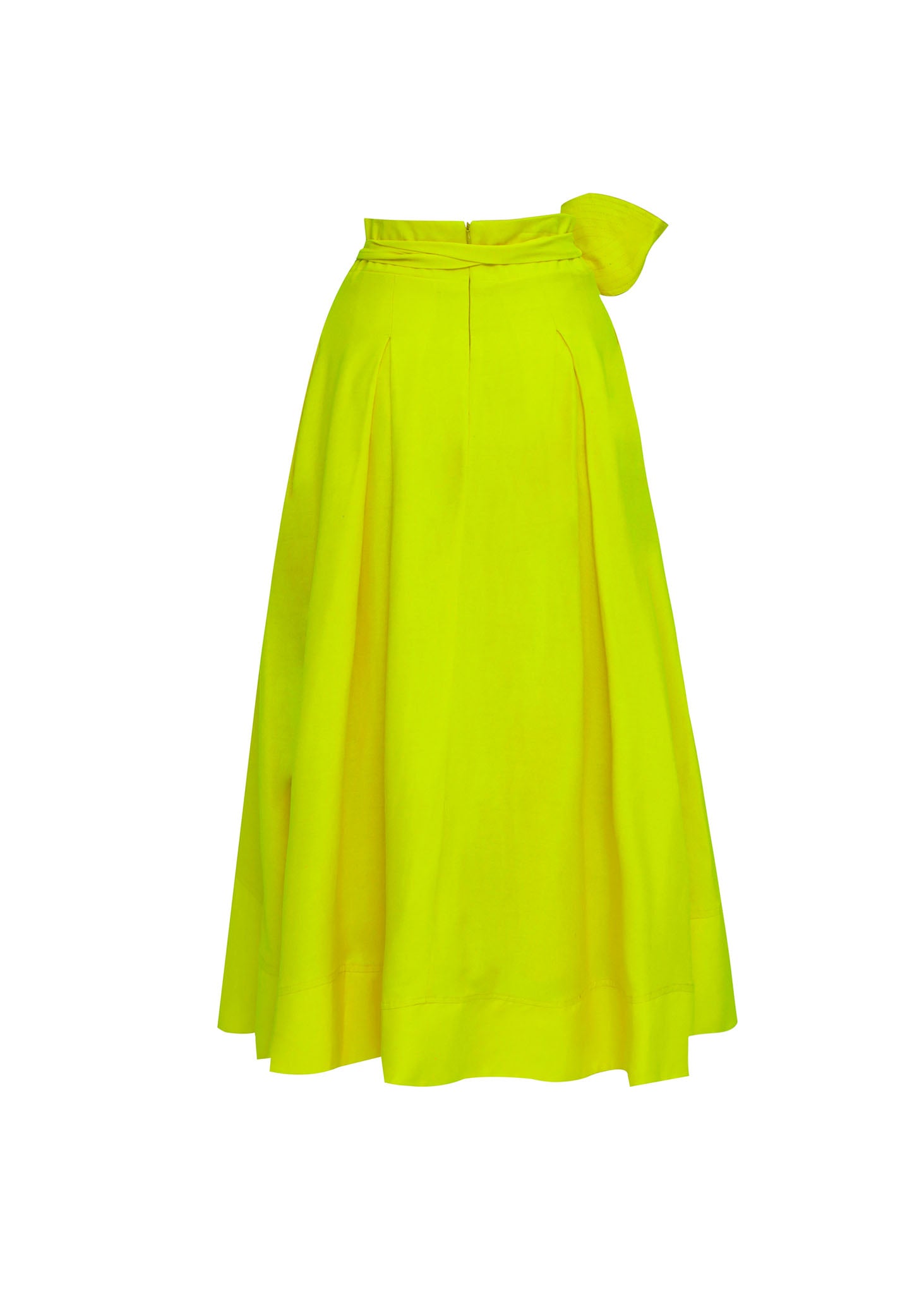 La prenda presenta una silueta amplia y fluida, lograda mediante delicados pliegues en la parte superior que permiten que la tela caiga con un volumen natural y sofisticado. Su terminación en el bajo cuenta con un dobladillo ancho que refuerza la estructura de la falda, manteniendo su forma de "A" mientras se mueve. Es la opción ideal para crear un "look" de impacto, perfecta para combinarse con prendas ajustadas que equilibren su volumen y resalten el vibrante tono cítrico de la colección.