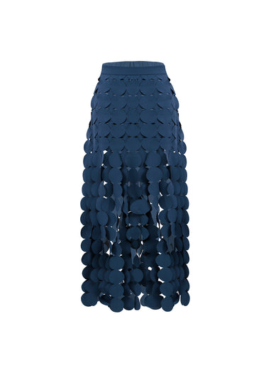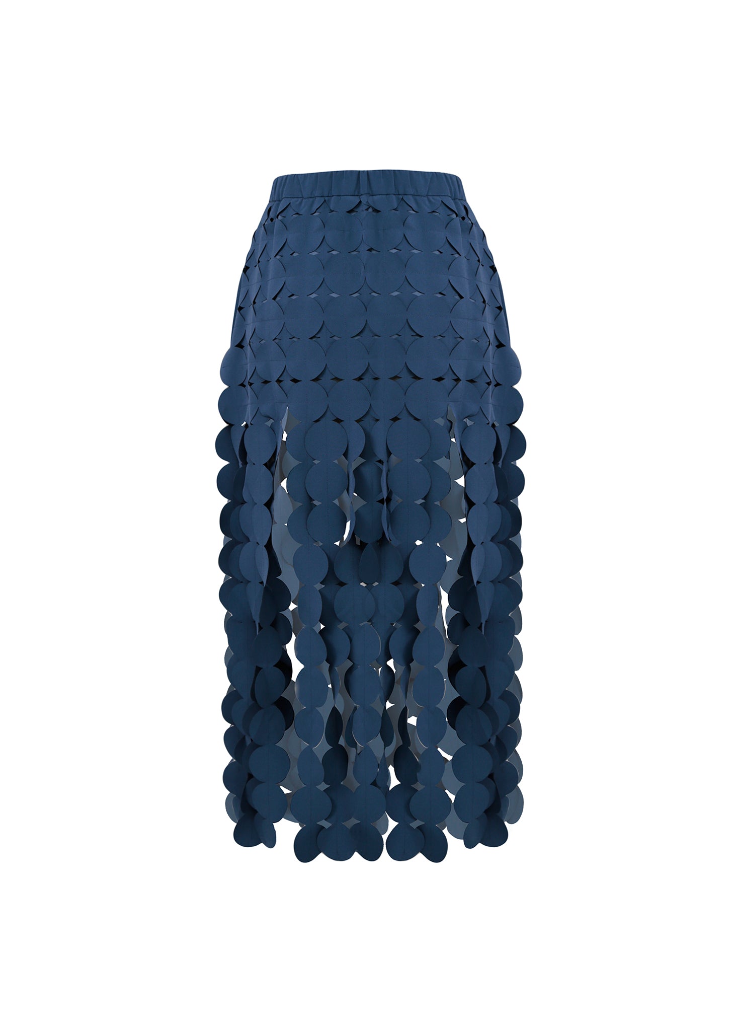 Nuestra Falda Midi es una pieza de exhibición que utiliza una técnica de corte preciso para crear una cascada de discos superpuestos, generando un efecto tridimensional y un movimiento hipnótico al caminar.