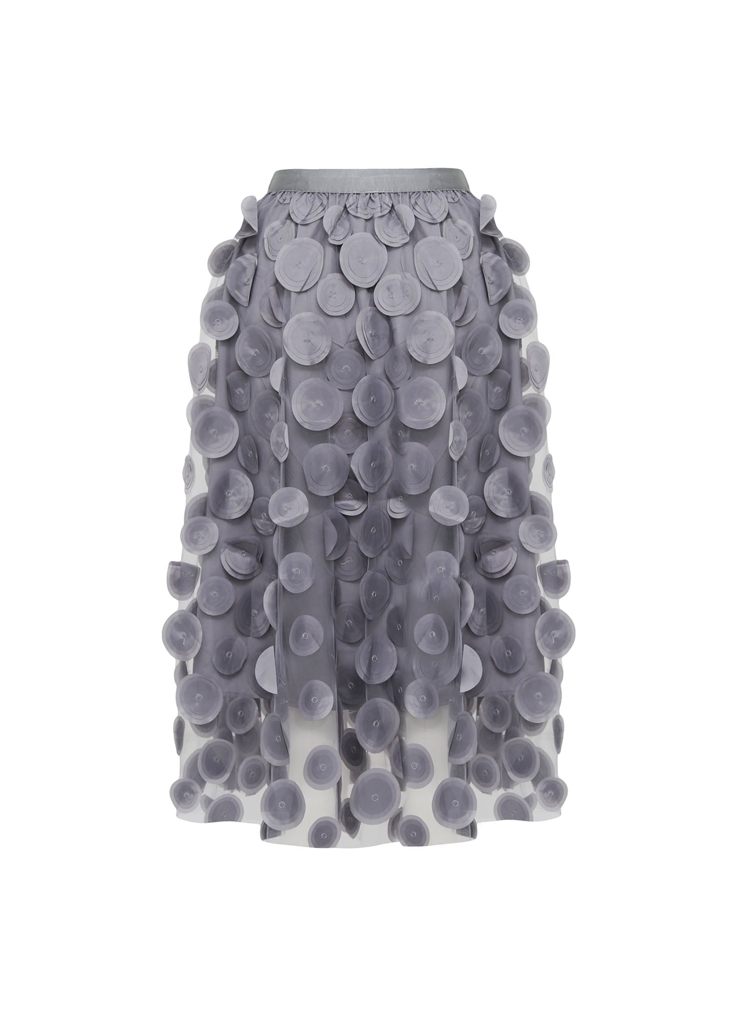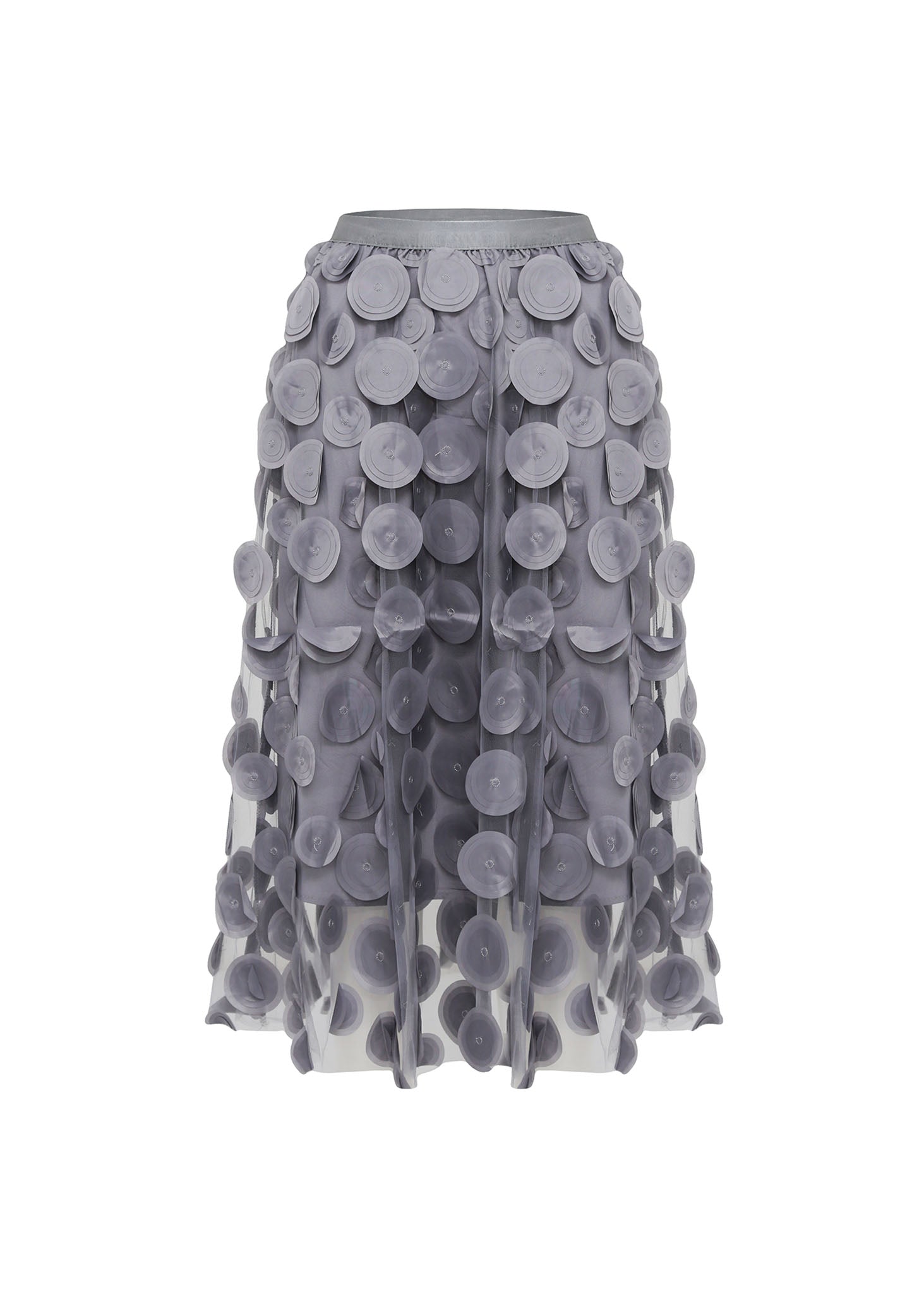 Esta falda es una pieza de diseño excepcional que juega con la transparencia y el volumen para crear una estética onírica y sofisticada. La prenda está confeccionada sobre una base de tul transparente de alta calidad en color gris humo, sobre la cual se distribuyen estratégicamente cientos de apliques circulares en relieve.