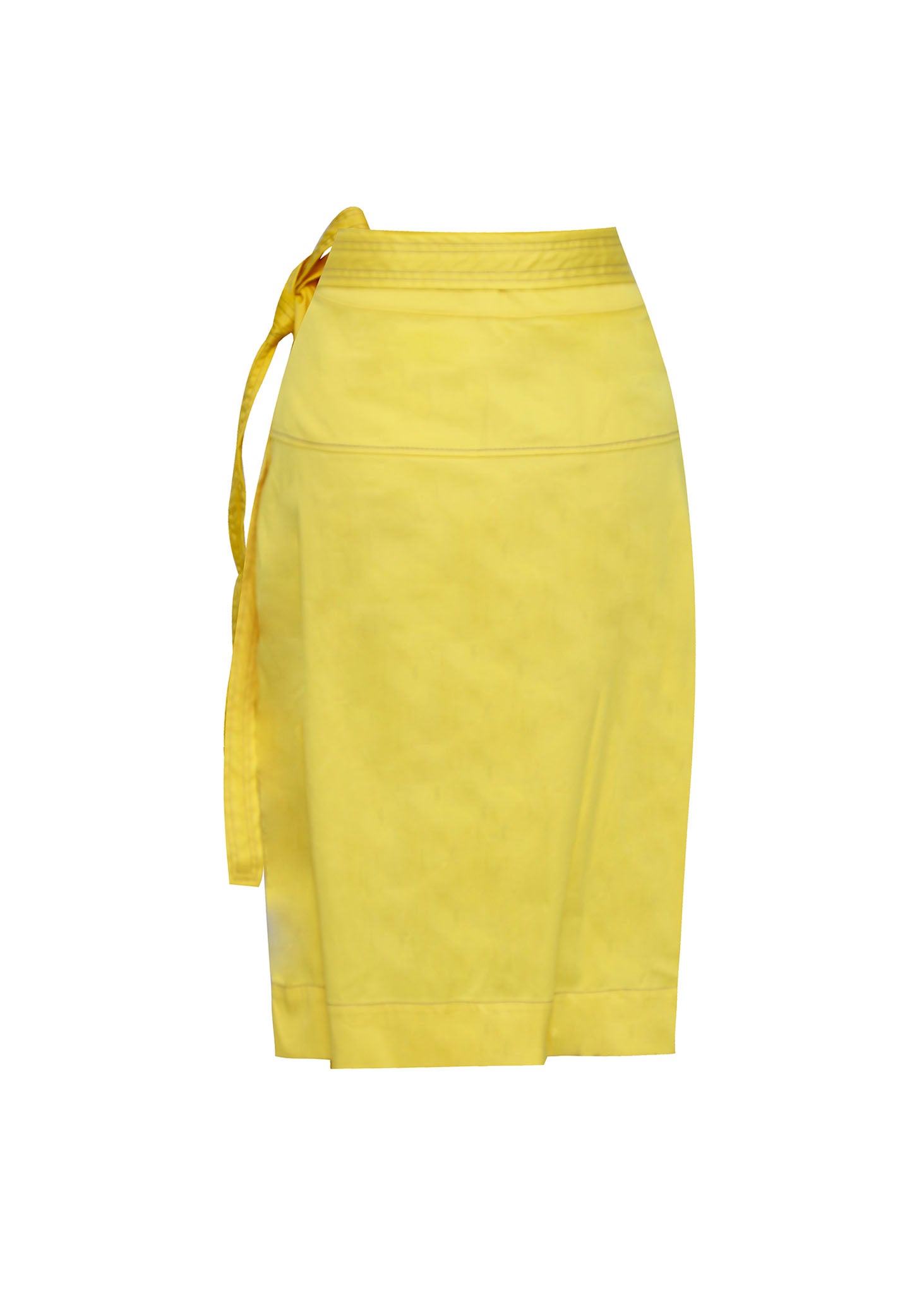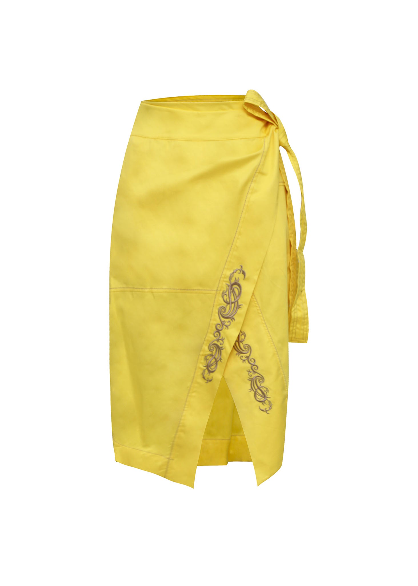 Esta falda midi es una pieza de diseño vibrante que fusiona la frescura del color estival con detalles ornamentales de alta sofisticación. Confeccionada en un tejido de estructura firme que garantiza una silueta definida, la prenda destaca por su diseño envolvente (wrap) que se cruza elegantemente en la parte frontal, creando una abertura natural que aporta movimiento y dinamismo al caminar. El elemento protagonista es un bordado intrincado de estilo barroco en tonos contrastantes que recorre el borde del cruce, añadiendo un valor artesanal y exclusivo a la pieza. Se ajusta estratégicamente en la cintura mediante una lazada del mismo tejido, permitiendo un entalle personalizado que realza la figura femenina. Su longitud midi y el acabado de sus costuras visibles refuerzan una estética moderna y pulida, ideal para destacar en eventos de día o compromisos sociales que exigen un equilibrio entre audacia y elegancia clásica.