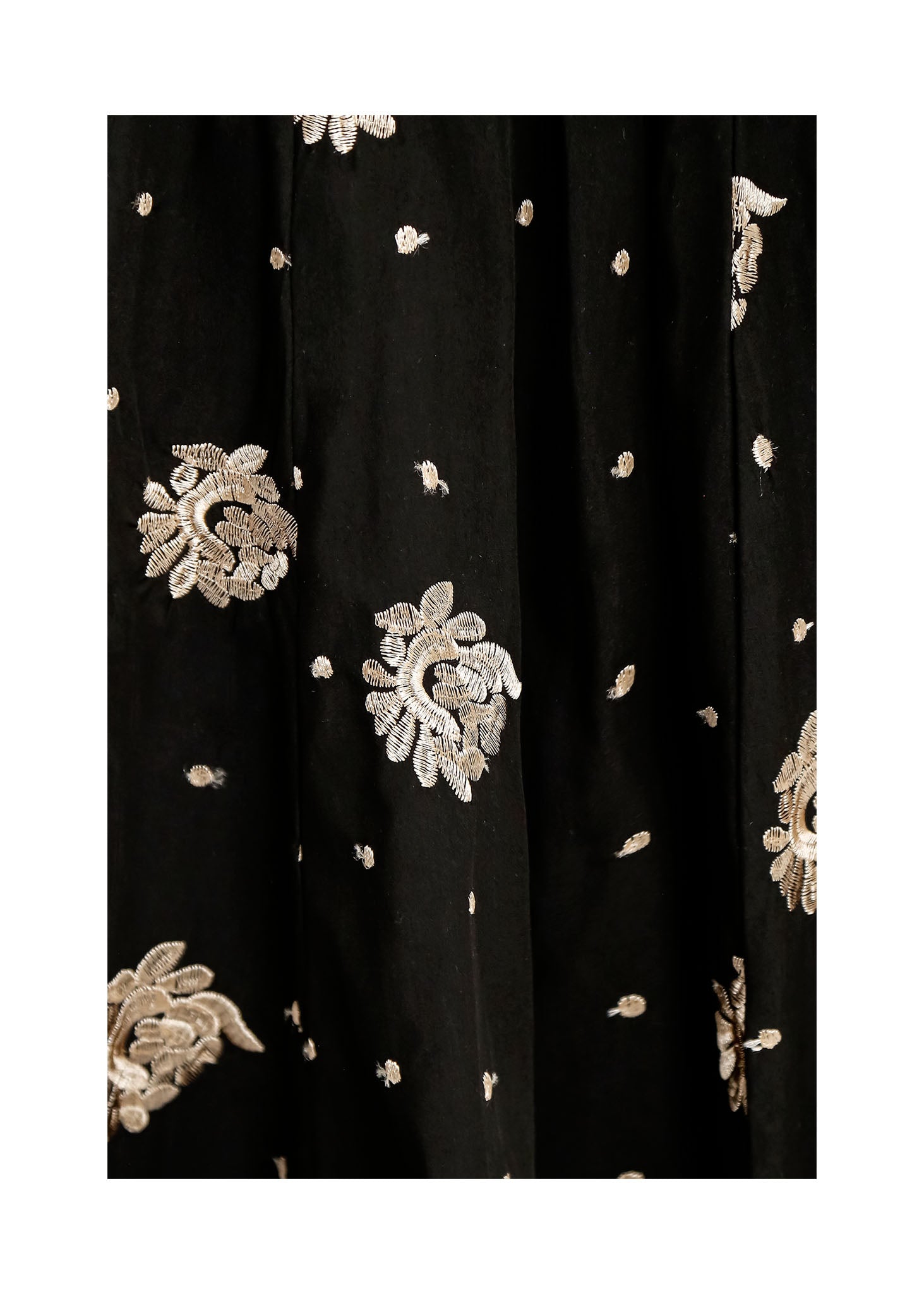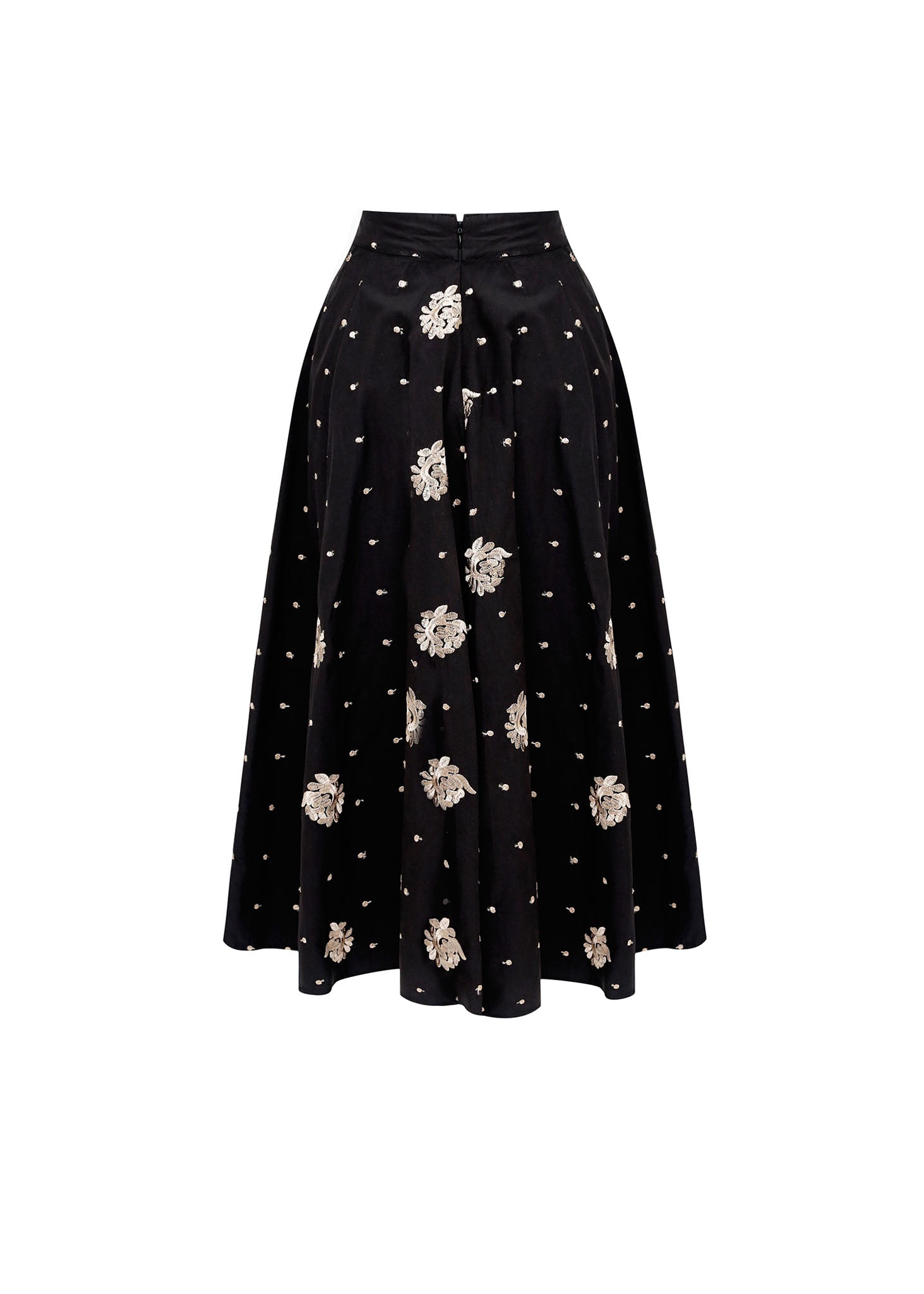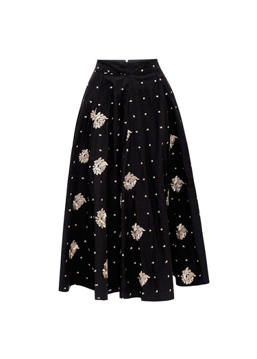 Esta majestuosa falda de gala personifica la elegancia clásica mediante una silueta estructural y una ornamentación artesanal de gran lujo. La prenda destaca por su corte acampanado de gran volumen, definido por pinzas profundas en la cintura que crean un movimiento fluido y regio al caminar. Confeccionada en un tejido de base negra con un sutil brillo satinado, la falda está exquisitamente decorada con bordados botánicos en relieve realizados en hilo dorado y marfil, complementados por un delicado patrón de puntos metalizados que capturan la luz de forma multidimensional. El diseño de tiro alto y su acabado de alta costura la posicionan como la pieza central definitiva para eventos de etiqueta que buscan fusionar la sobriedad del negro con la opulencia de los detalles joya.