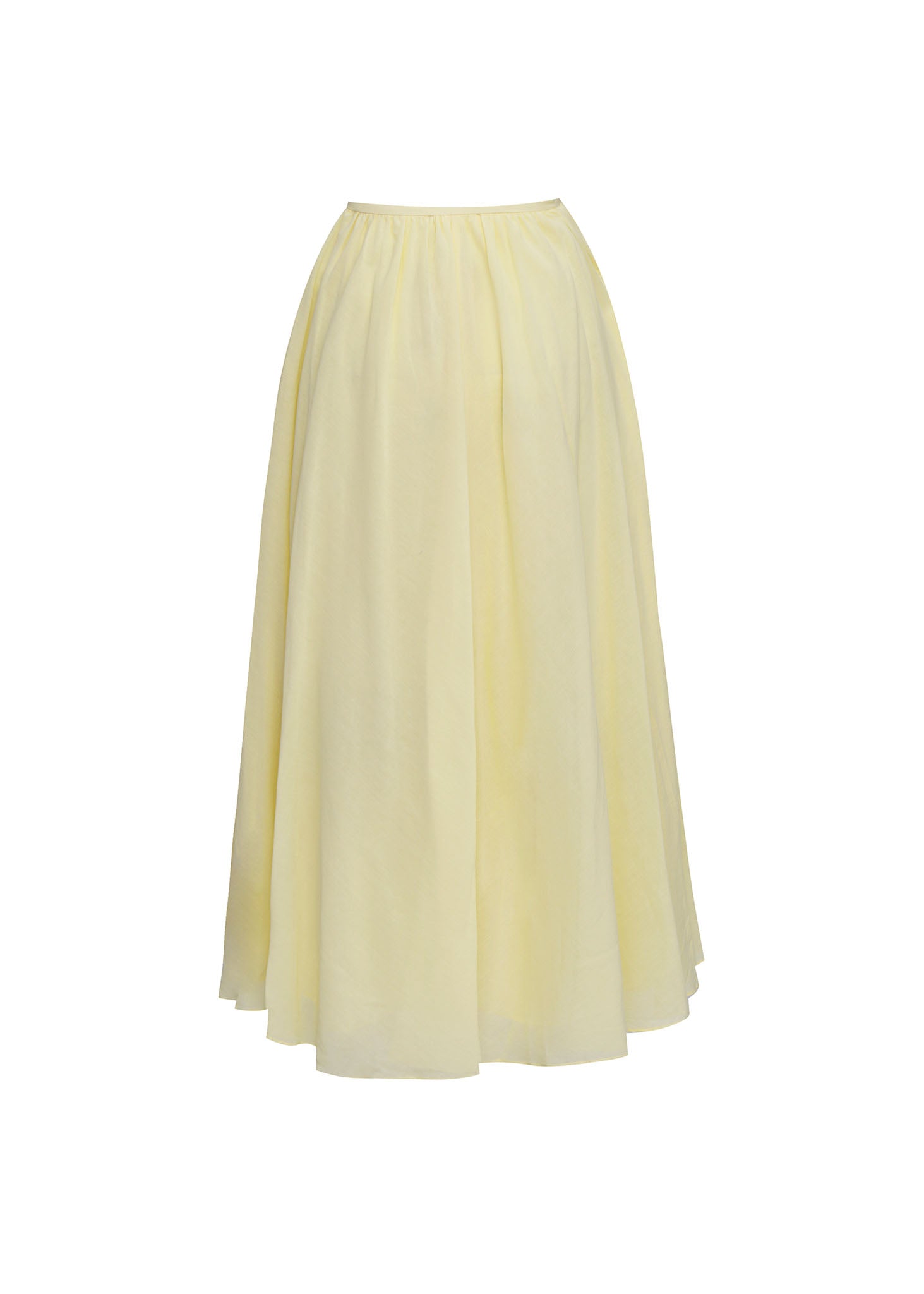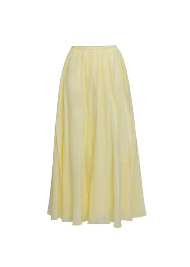 Esta maxifalda es la máxima expresión de la ligereza y el movimiento, diseñada para crear una silueta etérea y sofisticada en cada paso. Confeccionada en una delicada gasa de color amarillo pastel, la prenda destaca por su textura semitransparente y su caída fluida, que aporta un aire de romanticismo contemporáneo. El diseño se caracteriza por una cintura delgada y minimalista que da paso a un generoso volumen de tela, creando un vuelo espectacular y una silueta evasé que alarga visualmente la figura. Los sutiles pliegues que nacen de la pretina garantizan una estructura orgánica y un movimiento natural, convirtiéndola en la pieza ideal para eventos de verano o celebraciones de día donde se busca un equilibrio perfecto entre la comodidad absoluta y una elegancia vaporosa.